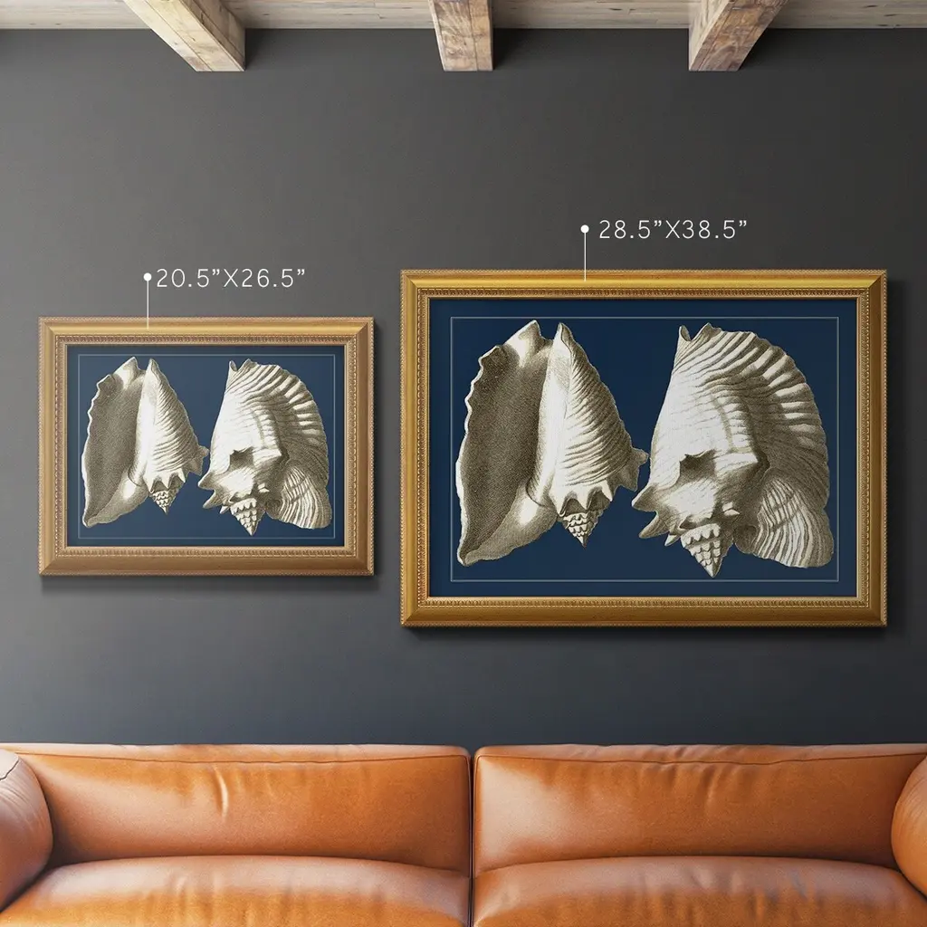 Conch Shells on Navy I Premium Framed Canvas- Ready to Hang A Premium Framed Canvas created to last. Framed in distressed wood and available in an array of sizes and colors Featuring a beveled a solid wood stretcher bar, each piece comes ready to hand 3 SIZES AVAILABLE 16''X20'' - Overall Size 18'X27'' - Overall Size 24''x36'' - Overall Size Each piece is made to order. Each piece comes with hanging hardware. Made in the USA Ready to Hang Giclee Paper Print Acrylic Glass Beveled Matt Board