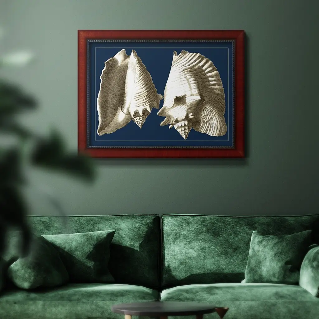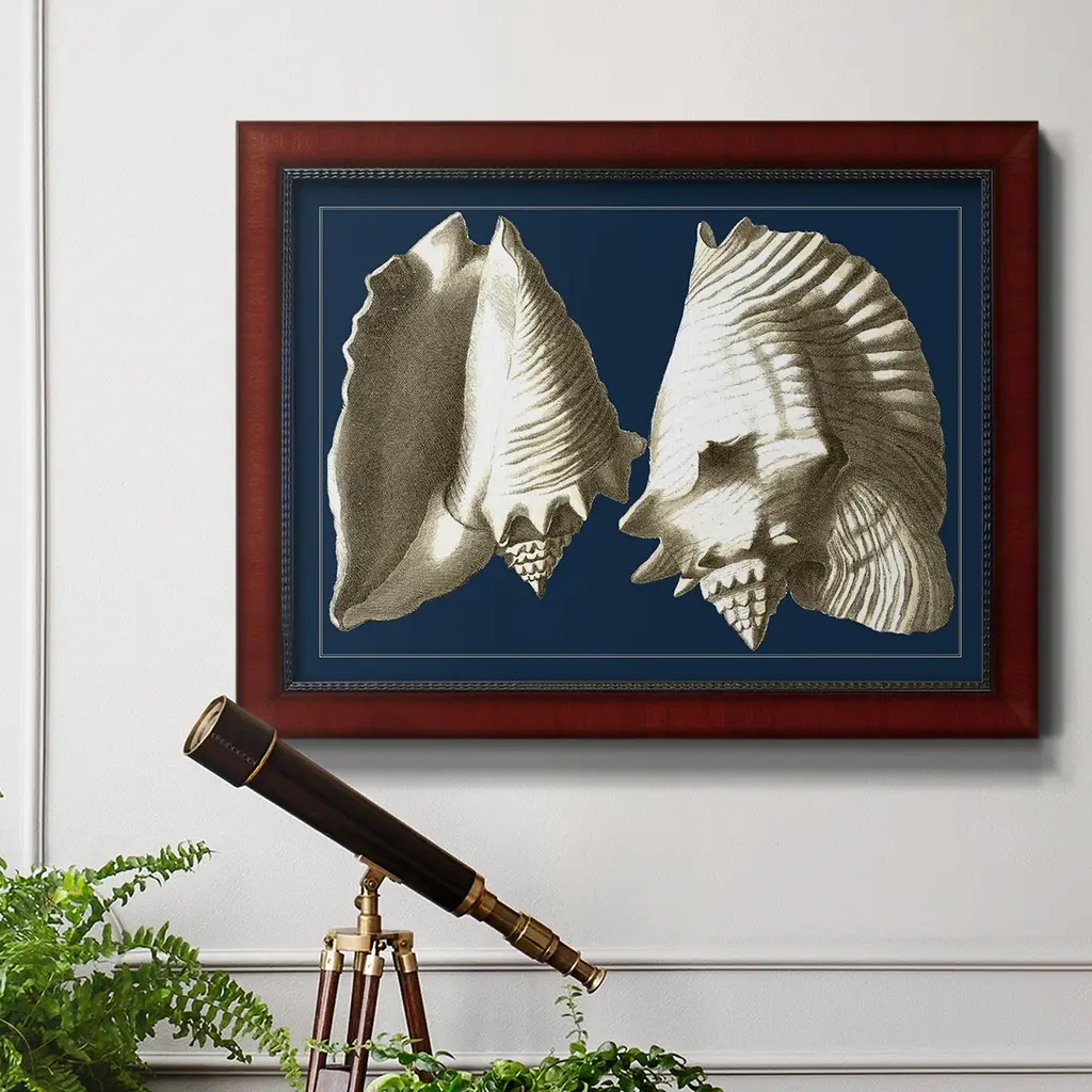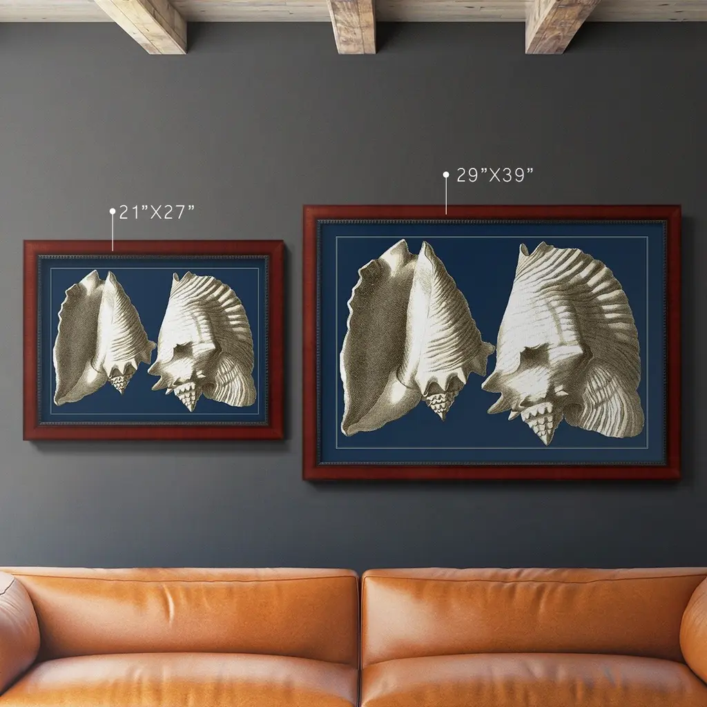 Conch Shells on Navy I Premium Framed Canvas- Ready to Hang A Premium Framed Canvas created to last. Framed in distressed wood and available in an array of sizes and colors Featuring a beveled a solid wood stretcher bar, each piece comes ready to hand 3 SIZES AVAILABLE 16''X20'' - Overall Size 18'X27'' - Overall Size 24''x36'' - Overall Size Each piece is made to order. Each piece comes with hanging hardware. Made in the USA Ready to Hang Giclee Paper Print Acrylic Glass Beveled Matt Board