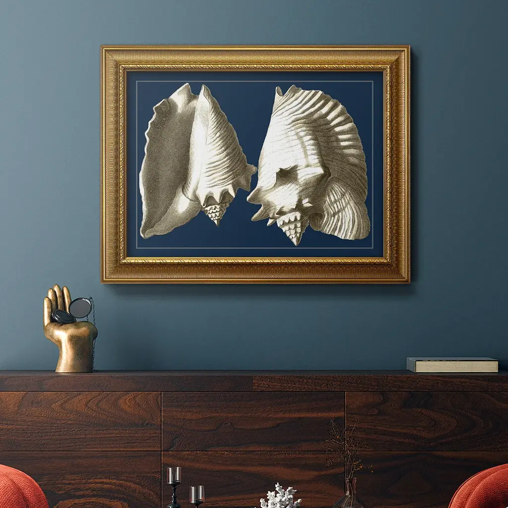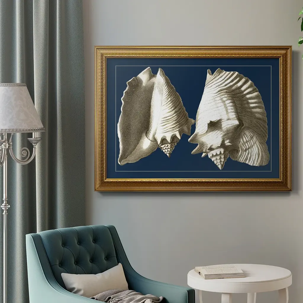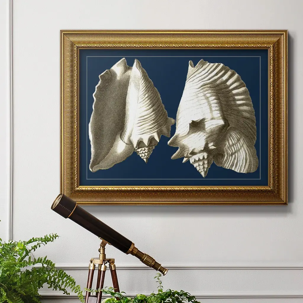Conch Shells on Navy I Premium Framed Canvas- Ready to Hang A Premium Framed Canvas created to last. Framed in distressed wood and available in an array of sizes and colors Featuring a beveled a solid wood stretcher bar, each piece comes ready to hand 3 SIZES AVAILABLE 16''X20'' - Overall Size 18'X27'' - Overall Size 24''x36'' - Overall Size Each piece is made to order. Each piece comes with hanging hardware. Made in the USA Ready to Hang Giclee Paper Print Acrylic Glass Beveled Matt Board