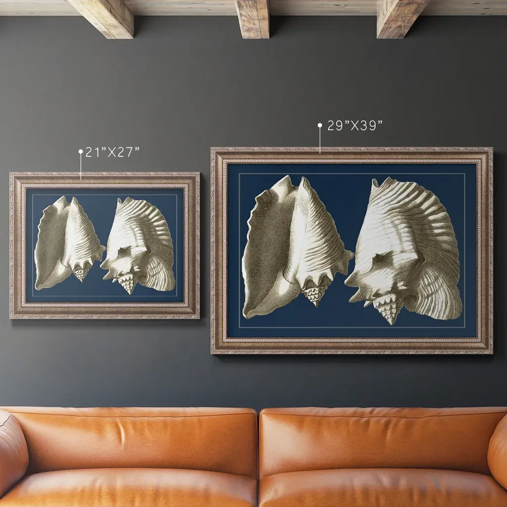 Conch Shells on Navy I Premium Framed Canvas- Ready to Hang A Premium Framed Canvas created to last. Framed in distressed wood and available in an array of sizes and colors Featuring a beveled a solid wood stretcher bar, each piece comes ready to hand 3 SIZES AVAILABLE 16''X20'' - Overall Size 18'X27'' - Overall Size 24''x36'' - Overall Size Each piece is made to order. Each piece comes with hanging hardware. Made in the USA Ready to Hang Giclee Paper Print Acrylic Glass Beveled Matt Board