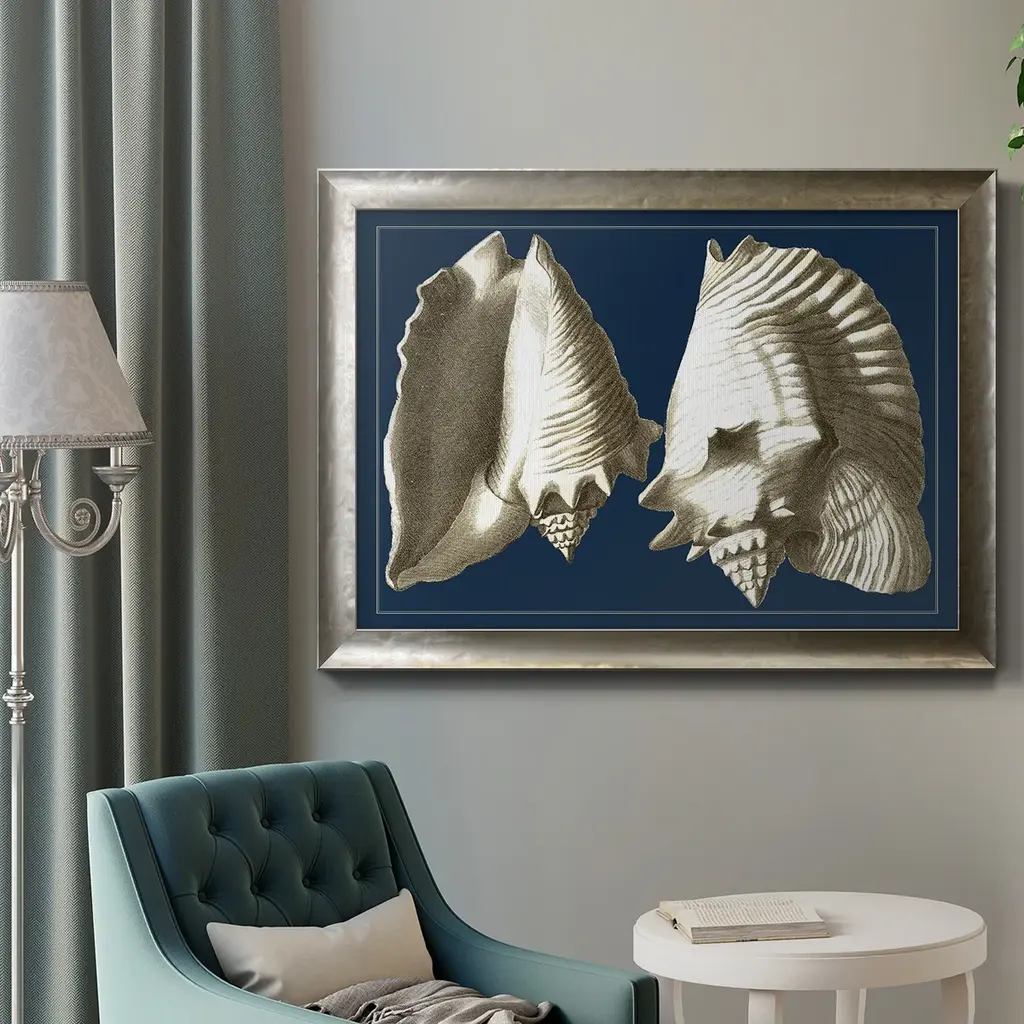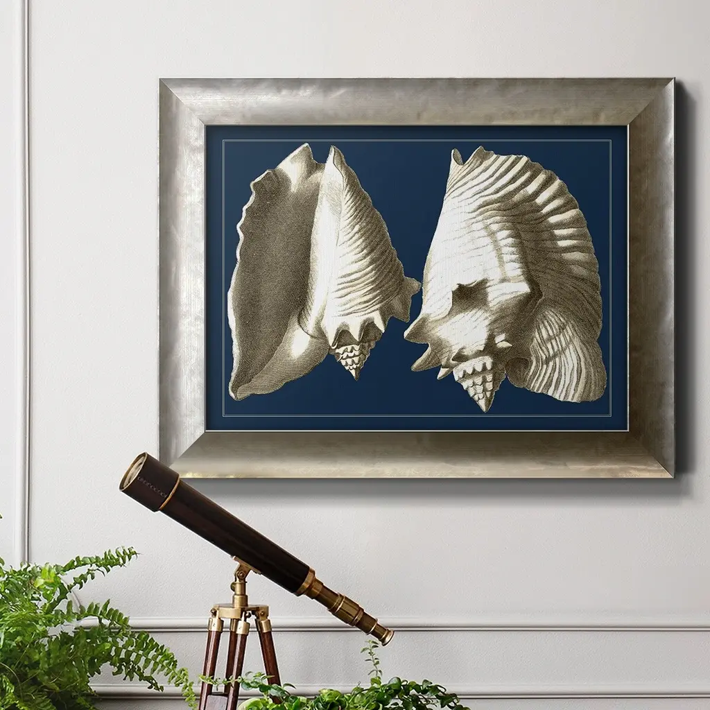 Conch Shells on Navy I Premium Framed Canvas- Ready to Hang A Premium Framed Canvas created to last. Framed in distressed wood and available in an array of sizes and colors Featuring a beveled a solid wood stretcher bar, each piece comes ready to hand 3 SIZES AVAILABLE 16''X20'' - Overall Size 18'X27'' - Overall Size 24''x36'' - Overall Size Each piece is made to order. Each piece comes with hanging hardware. Made in the USA Ready to Hang Giclee Paper Print Acrylic Glass Beveled Matt Board