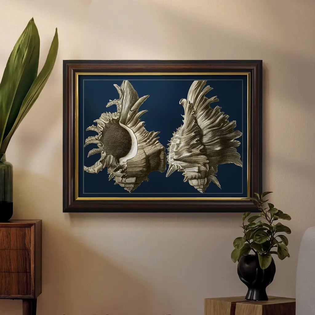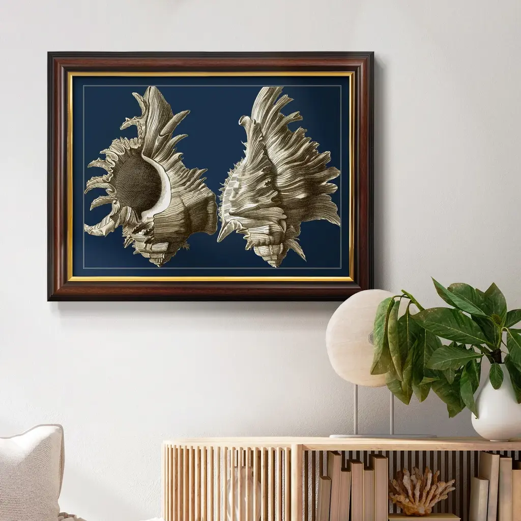 Conch Shells On Navy Ii Premium Framed Canvas- Ready To Hang - 18x27 - Mahogany