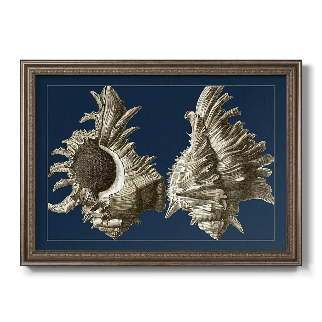 Conch Shells On Navy Ii Premium Framed Canvas- Ready To Hang - 18x27 - Walnut