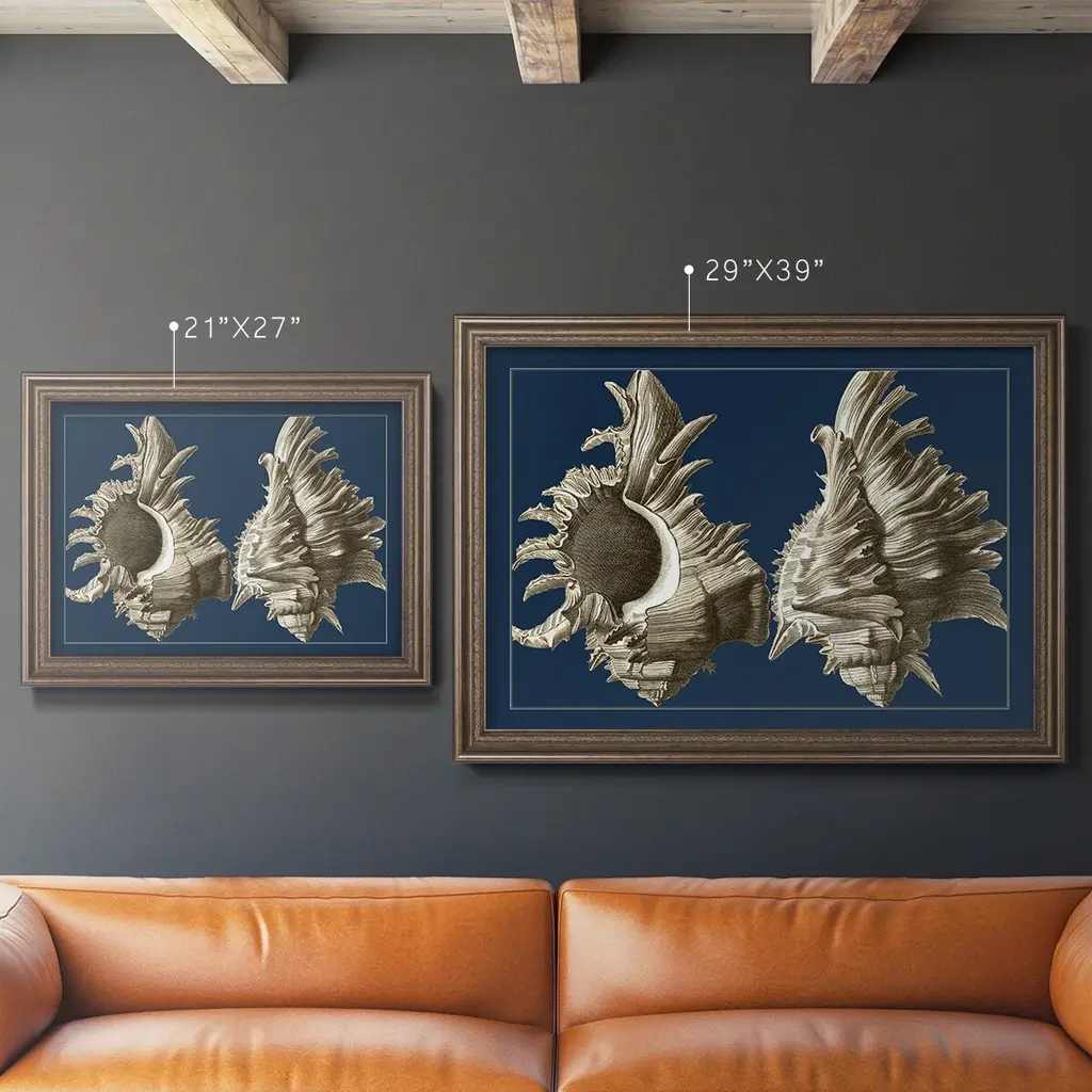 Conch Shells on Navy II Premium Framed Canvas- Ready to Hang A Premium Framed Canvas created to last. Framed in distressed wood and available in an array of sizes and colors Featuring a beveled a solid wood stretcher bar, each piece comes ready to hand 3 SIZES AVAILABLE 16''X20'' - Overall Size 18'X27'' - Overall Size 24''x36'' - Overall Size Each piece is made to order. Each piece comes with hanging hardware. Made in the USA Ready to Hang Giclee Paper Print Acrylic Glass Beveled Matt Board