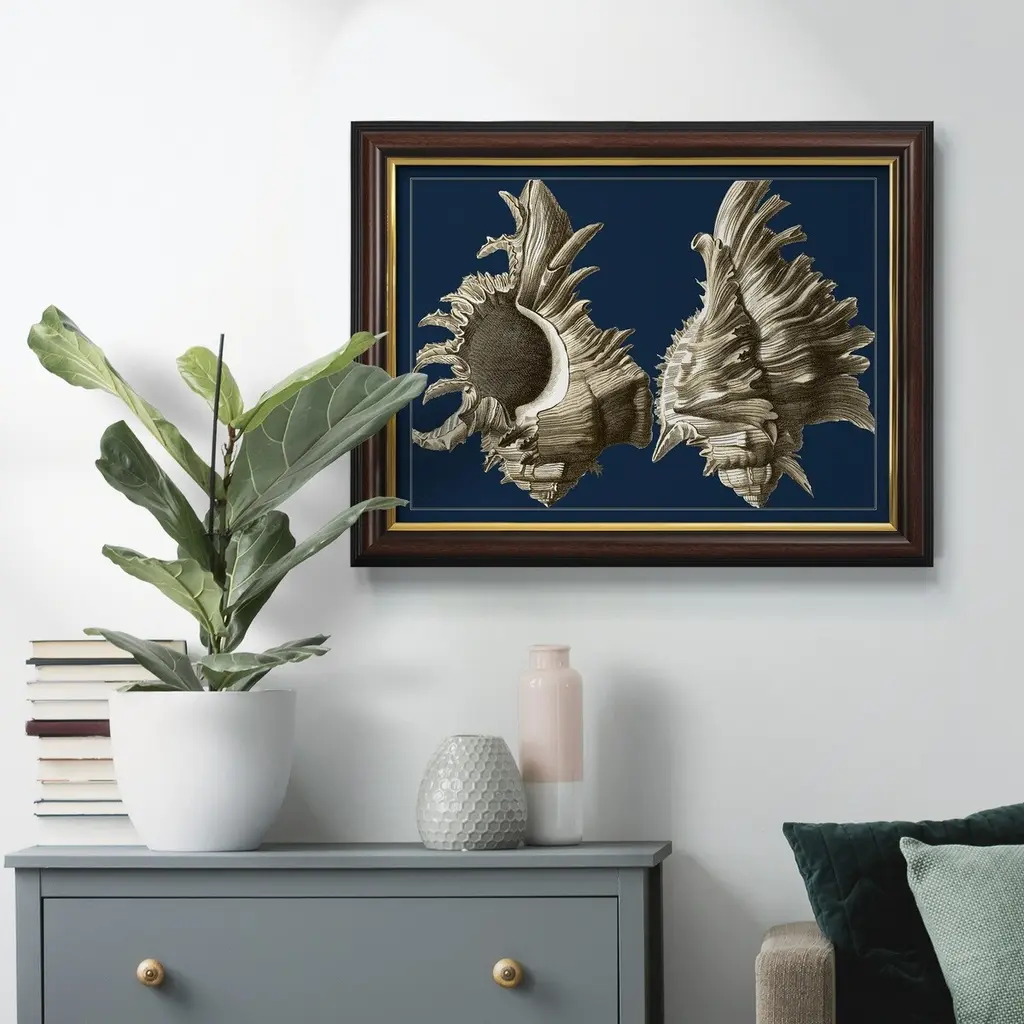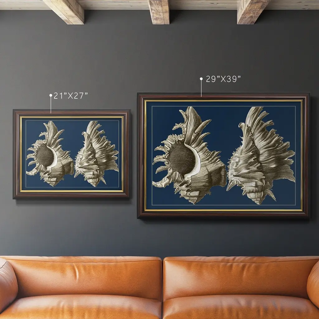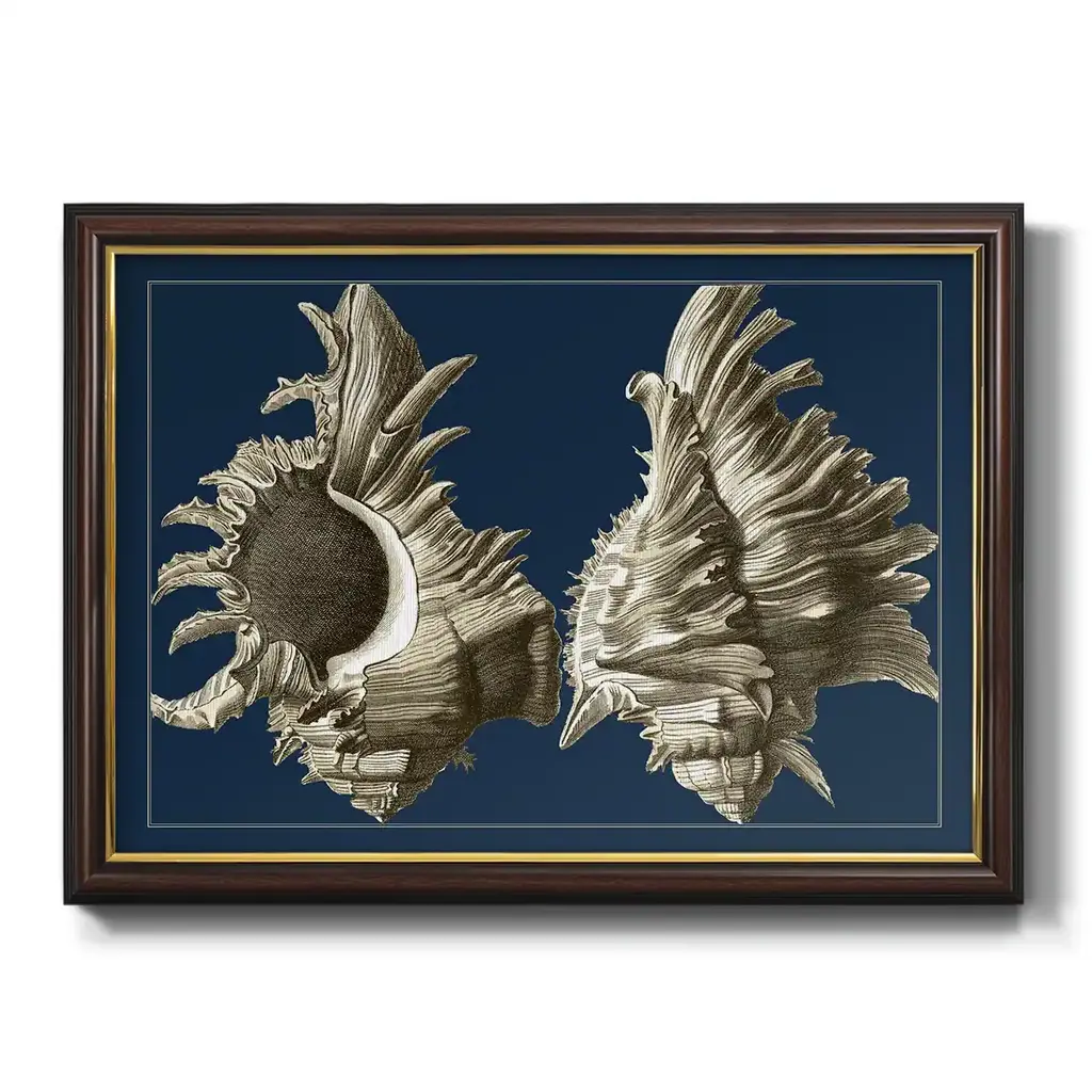 Conch Shells on Navy II Premium Framed Canvas- Ready to Hang A Premium Framed Canvas created to last. Framed in distressed wood and available in an array of sizes and colors Featuring a beveled a solid wood stretcher bar, each piece comes ready to hand 3 SIZES AVAILABLE 16''X20'' - Overall Size 18'X27'' - Overall Size 24''x36'' - Overall Size Each piece is made to order. Each piece comes with hanging hardware. Made in the USA Ready to Hang Giclee Paper Print Acrylic Glass Beveled Matt Board