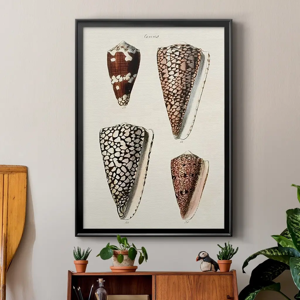 Cone Shell Collection I Premium Framed Print - Ready to Hang A Premium Framed Print created to last. Framed in distressed wood and available in an array of sizes and colors Featuring a beveled a solid wood stretcher bar, each piece comes ready to hand 4 SIZES AVAILABLE 30.5''X42.5'' - Overall Size 26.5'X36.5'' - Overall Size 22.5''x30.5'' - Overall Size 18.5''x24.5'' - Overall Size Each piece is made to order. Each piece comes with hanging hardware. Made in the USA Ready to Hang