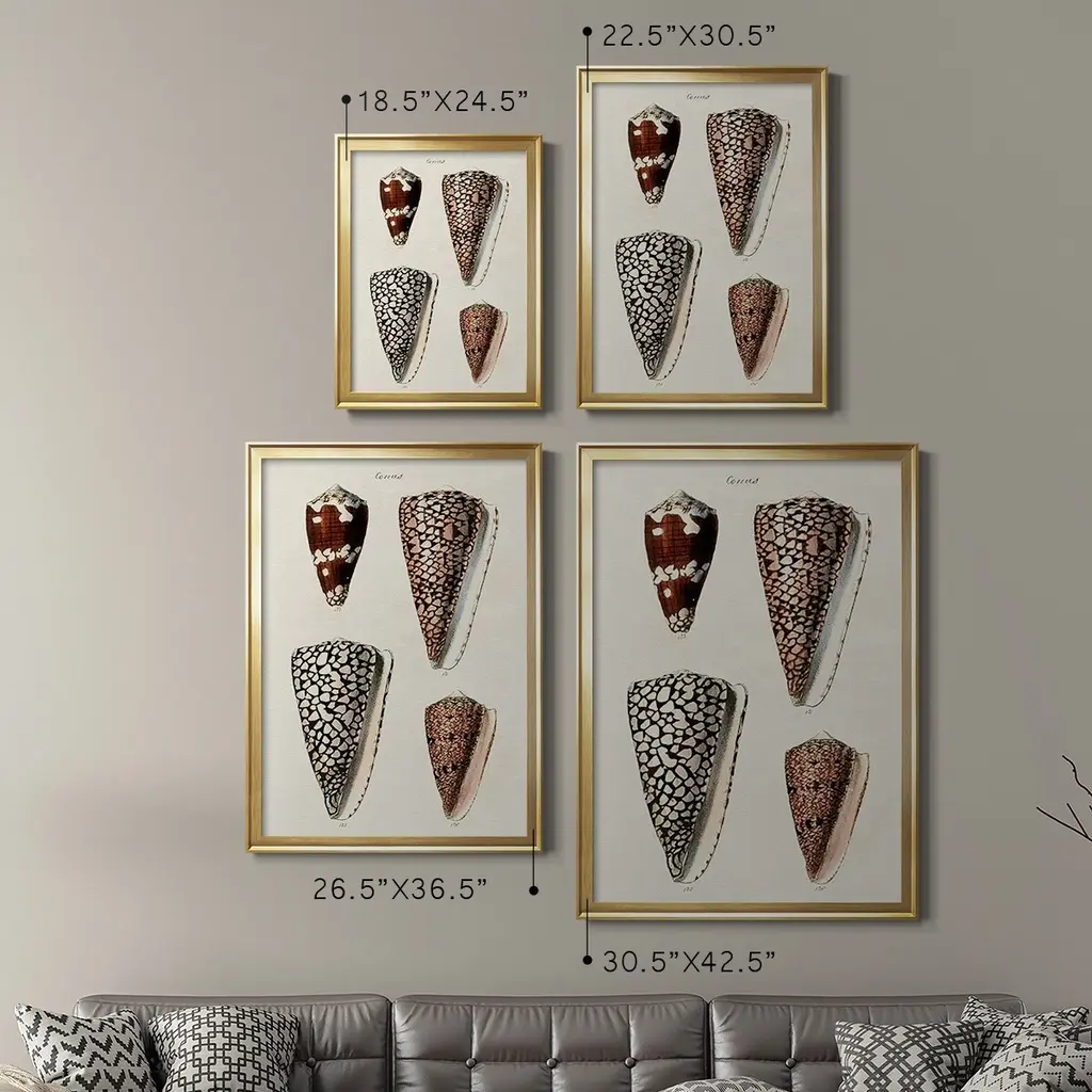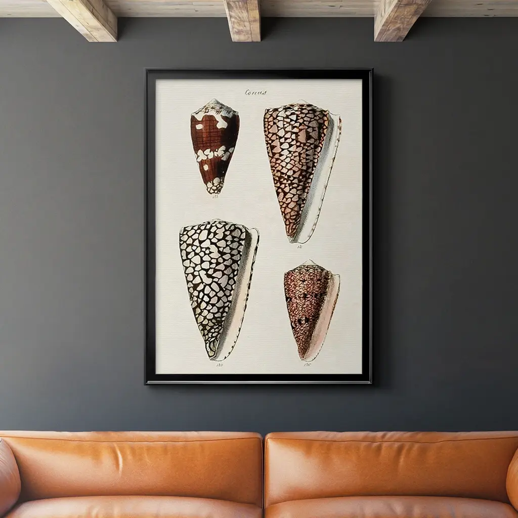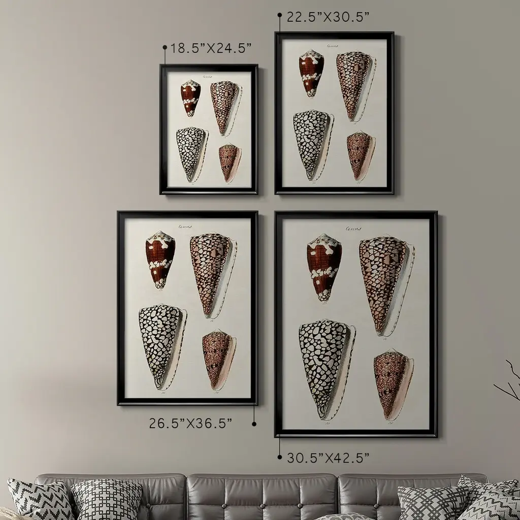 Cone Shell Collection I Premium Framed Print - Ready to Hang A Premium Framed Print created to last. Framed in distressed wood and available in an array of sizes and colors Featuring a beveled a solid wood stretcher bar, each piece comes ready to hand 4 SIZES AVAILABLE 30.5''X42.5'' - Overall Size 26.5'X36.5'' - Overall Size 22.5''x30.5'' - Overall Size 18.5''x24.5'' - Overall Size Each piece is made to order. Each piece comes with hanging hardware. Made in the USA Ready to Hang