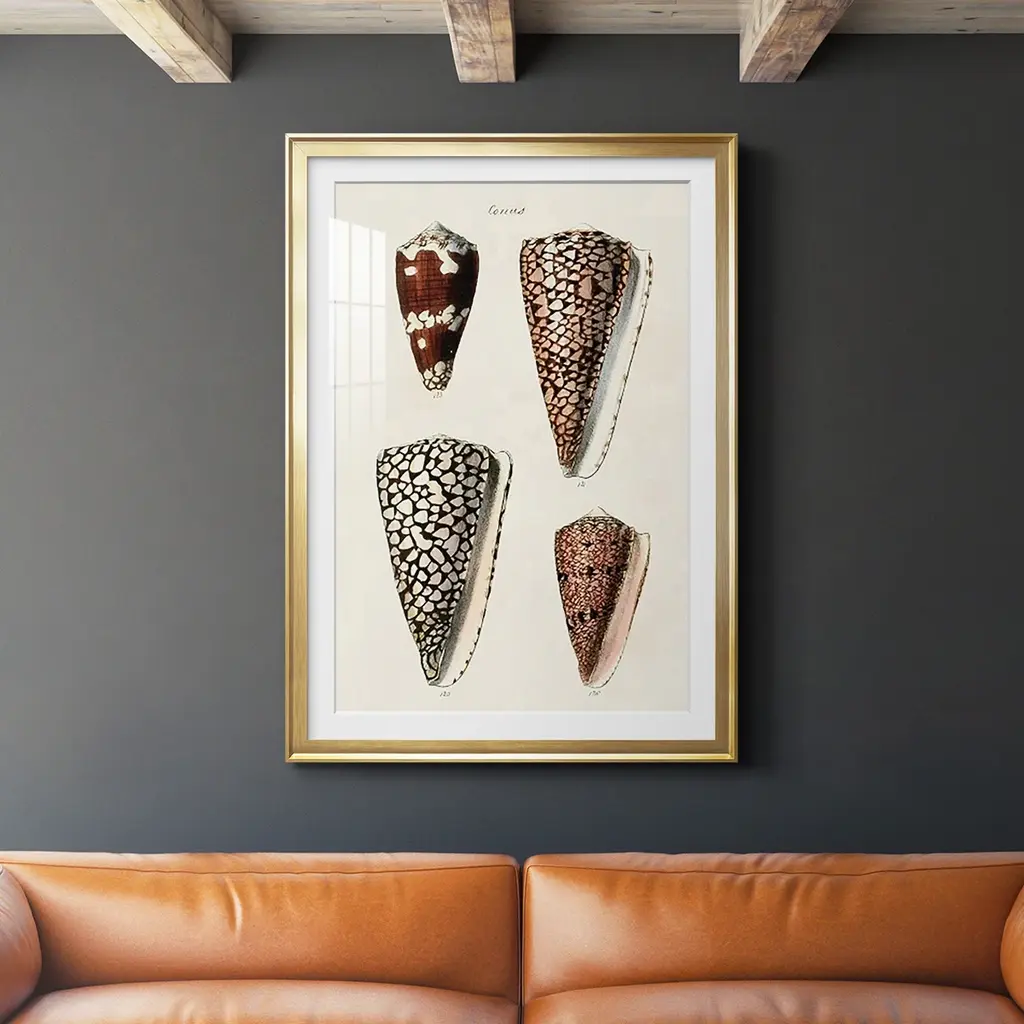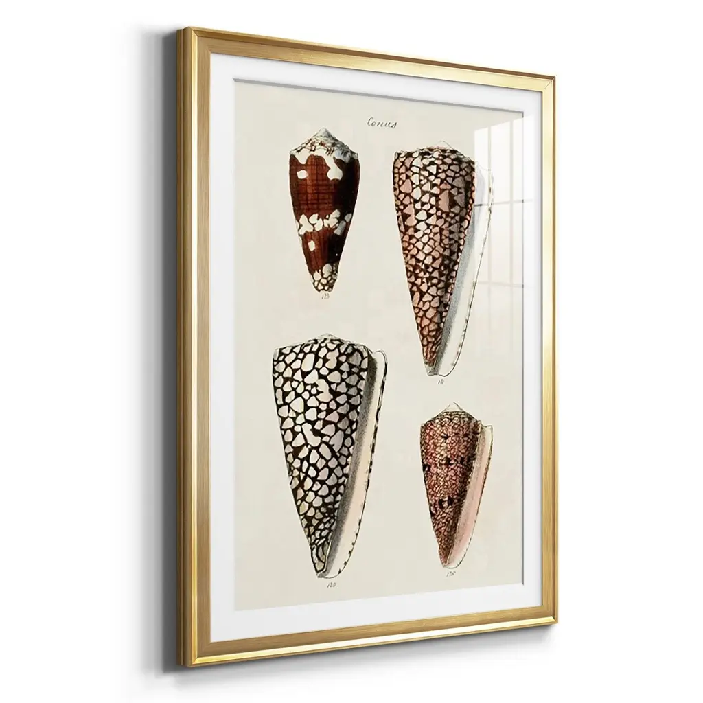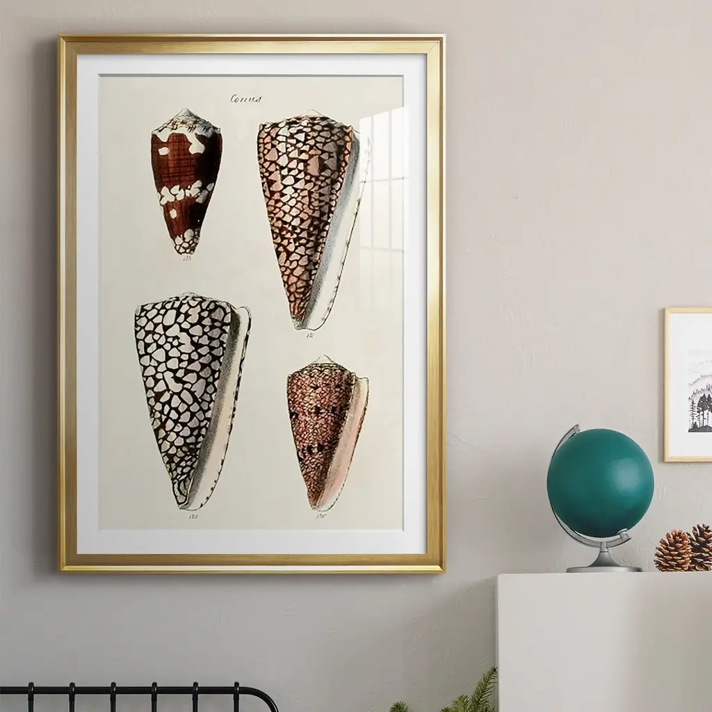 Cone Shell Collection I Premium Framed Print - Ready to Hang A Premium Framed Print created to last. Framed in distressed wood and available in an array of sizes and colors Featuring a beveled a solid wood stretcher bar, each piece comes ready to hand 4 SIZES AVAILABLE 30.5''X42.5'' - Overall Size 26.5'X36.5'' - Overall Size 22.5''x30.5'' - Overall Size 18.5''x24.5'' - Overall Size Each piece is made to order. Each piece comes with hanging hardware. Made in the USA Ready to Hang Giclee Paper Print Acrylic Glass Beveled Matt Board