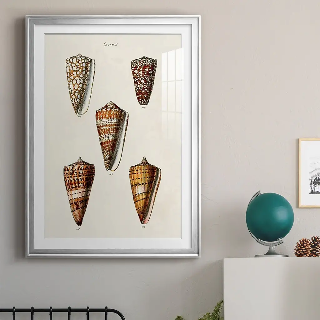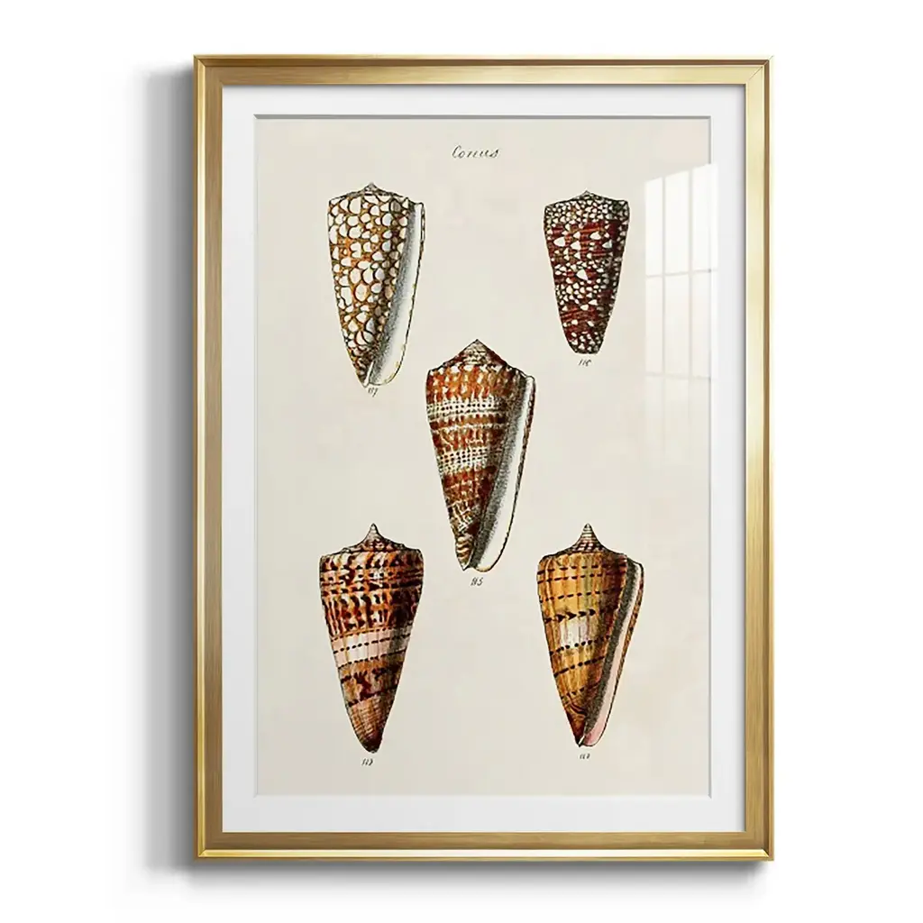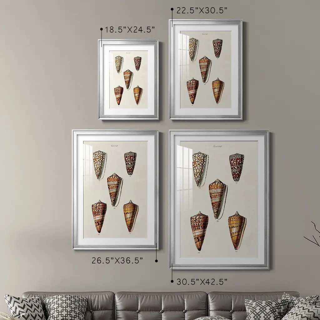 Cone Shell Collection II Premium Framed Print - Ready to Hang A Premium Framed Print created to last. Framed in distressed wood and available in an array of sizes and colors Featuring a beveled a solid wood stretcher bar, each piece comes ready to hand 4 SIZES AVAILABLE 30.5''X42.5'' - Overall Size 26.5'X36.5'' - Overall Size 22.5''x30.5'' - Overall Size 18.5''x24.5'' - Overall Size Each piece is made to order. Each piece comes with hanging hardware. Made in the USA Ready to Hang Giclee Paper Print Acrylic Glass Beveled Matt Board