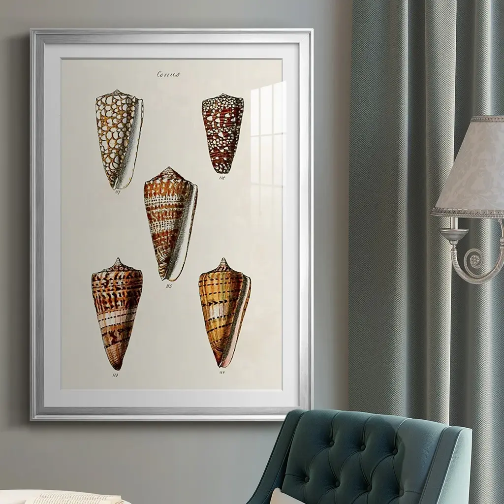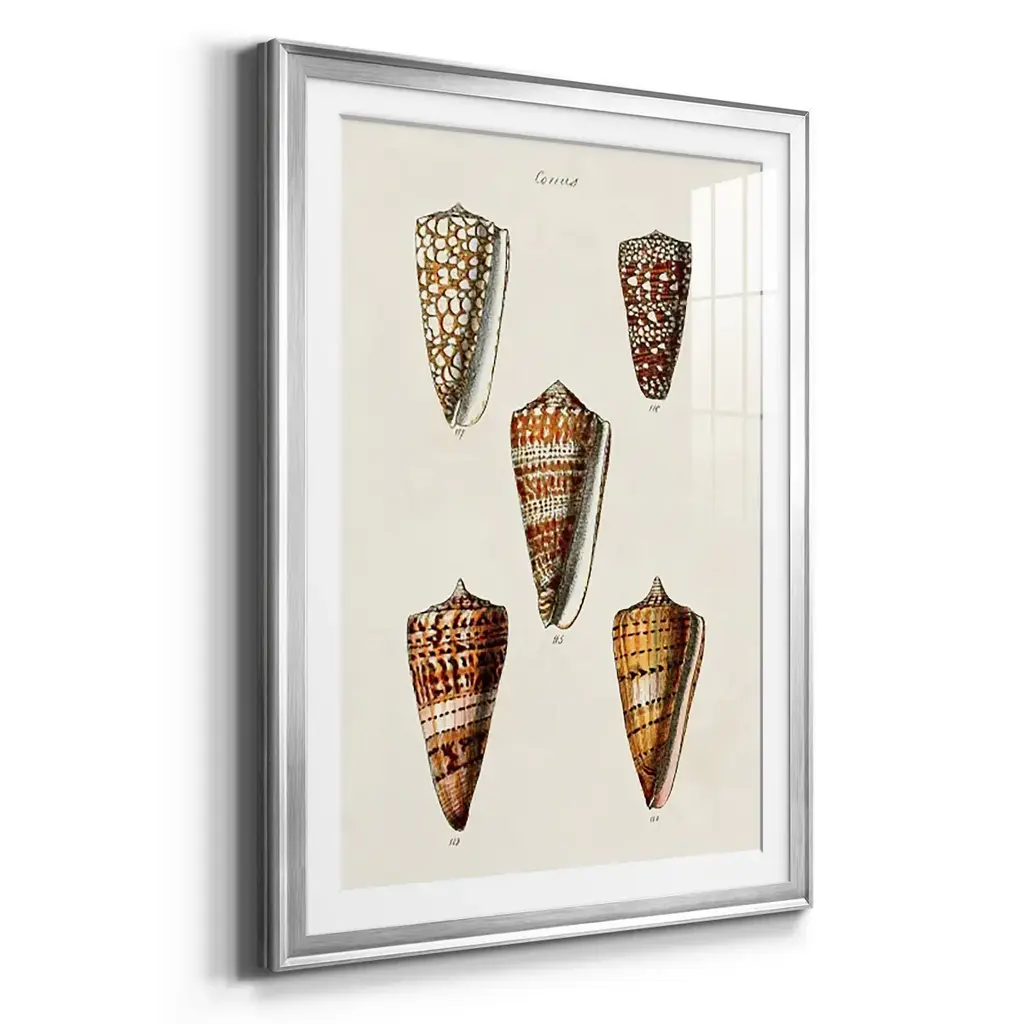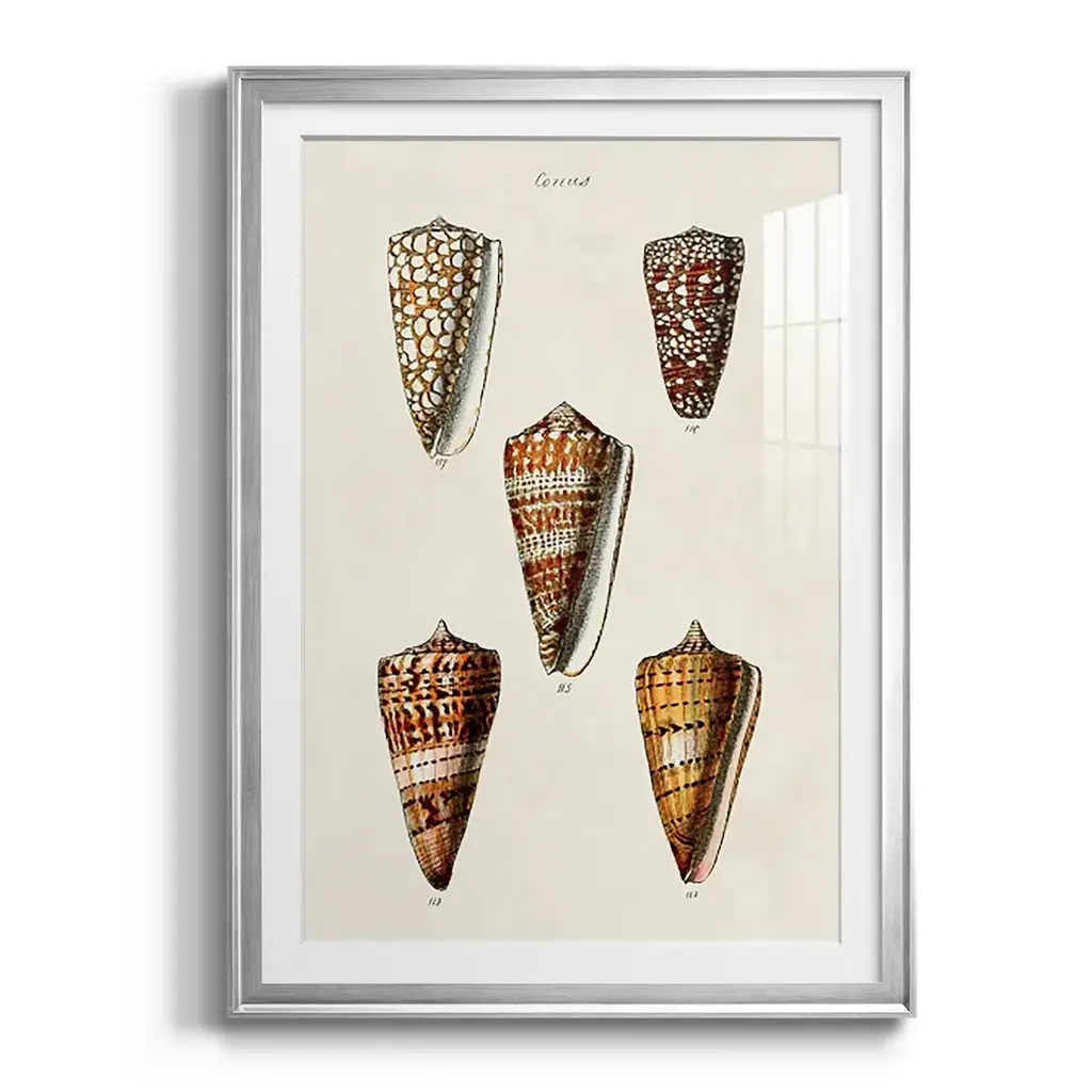 Cone Shell Collection II Premium Framed Print - Ready to Hang A Premium Framed Print created to last. Framed in distressed wood and available in an array of sizes and colors Featuring a beveled a solid wood stretcher bar, each piece comes ready to hand 4 SIZES AVAILABLE 30.5''X42.5'' - Overall Size 26.5'X36.5'' - Overall Size 22.5''x30.5'' - Overall Size 18.5''x24.5'' - Overall Size Each piece is made to order. Each piece comes with hanging hardware. Made in the USA Ready to Hang Giclee Paper Print Acrylic Glass Beveled Matt Board