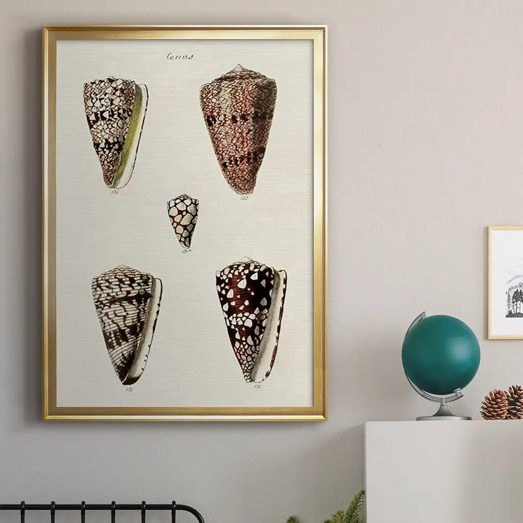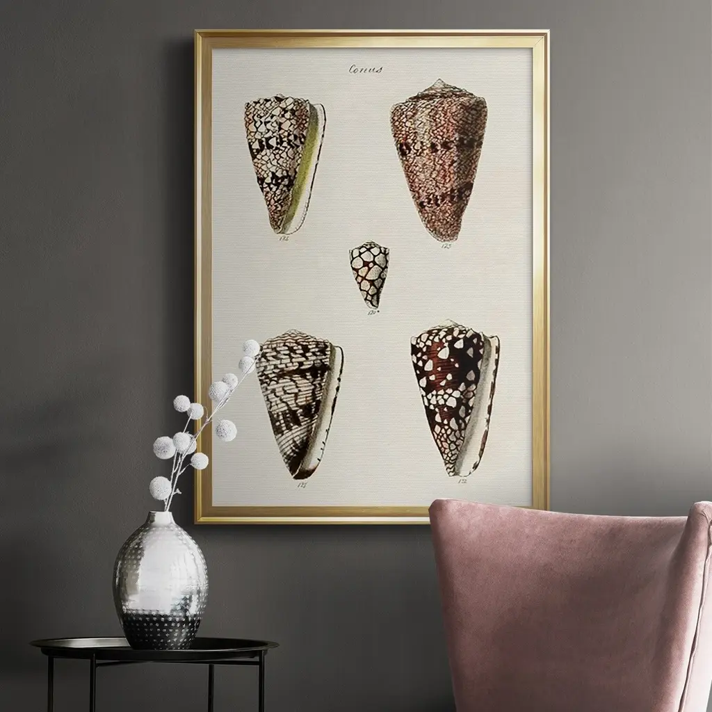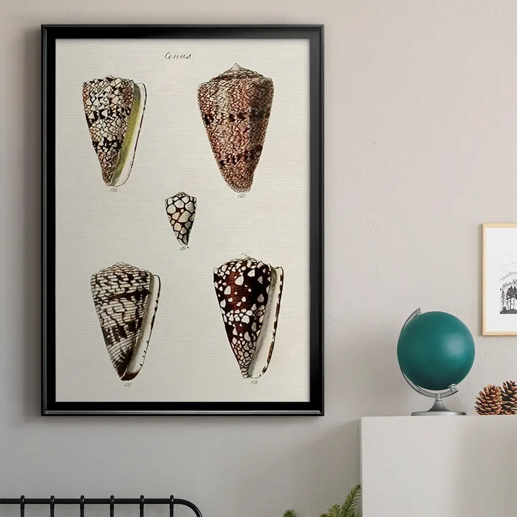Cone Shell Collection III Premium Framed Print - Ready to Hang A Premium Framed Print created to last. Framed in distressed wood and available in an array of sizes and colors Featuring a beveled a solid wood stretcher bar, each piece comes ready to hand 4 SIZES AVAILABLE 30.5''X42.5'' - Overall Size 26.5'X36.5'' - Overall Size 22.5''x30.5'' - Overall Size 18.5''x24.5'' - Overall Size Each piece is made to order. Each piece comes with hanging hardware. Made in the USA Ready to Hang