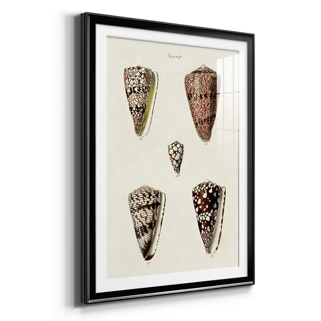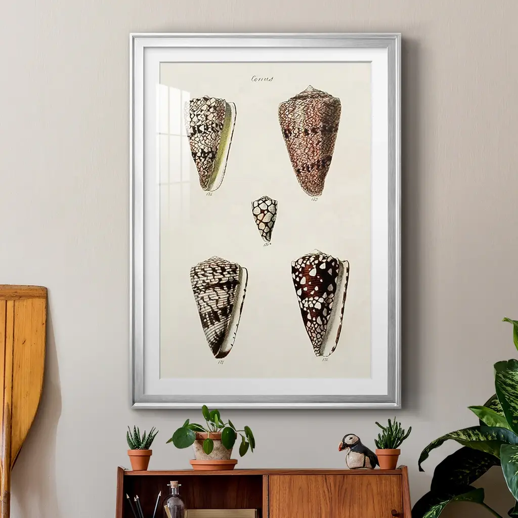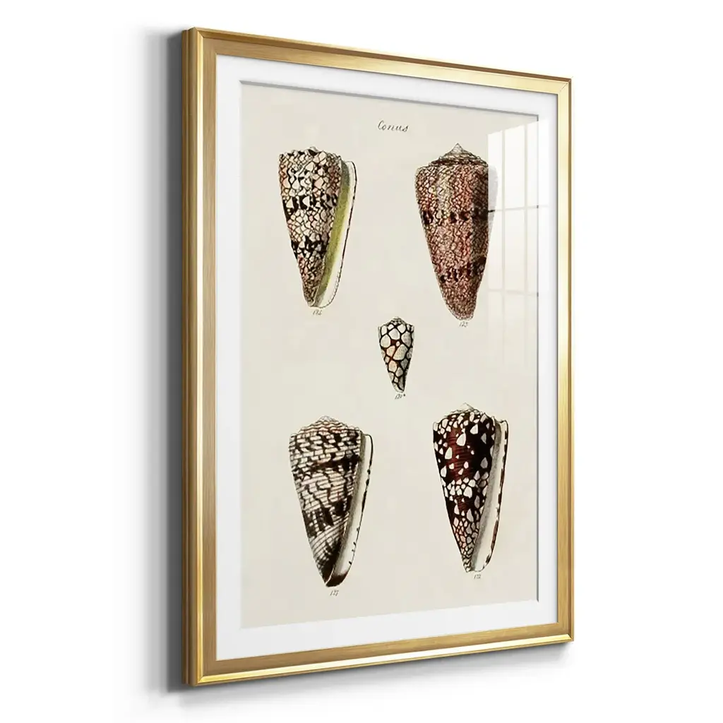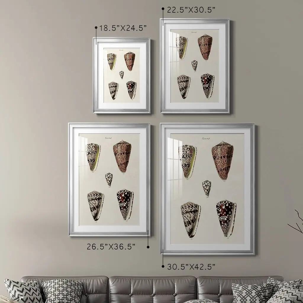 Cone Shell Collection III Premium Framed Print - Ready to Hang A Premium Framed Print created to last. Framed in distressed wood and available in an array of sizes and colors Featuring a beveled a solid wood stretcher bar, each piece comes ready to hand 4 SIZES AVAILABLE 30.5''X42.5'' - Overall Size 26.5'X36.5'' - Overall Size 22.5''x30.5'' - Overall Size 18.5''x24.5'' - Overall Size Each piece is made to order. Each piece comes with hanging hardware. Made in the USA Ready to Hang Giclee Paper Print Acrylic Glass Beveled Matt Board