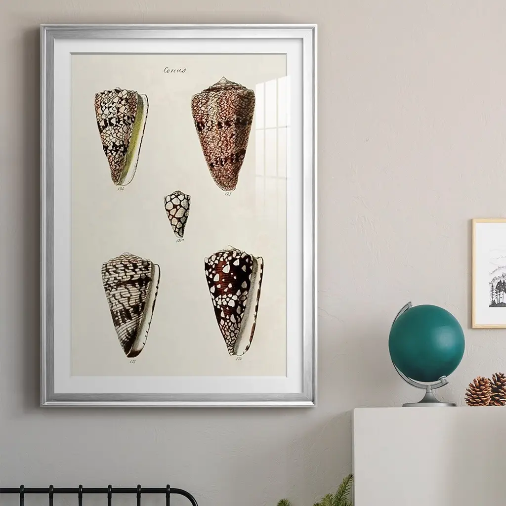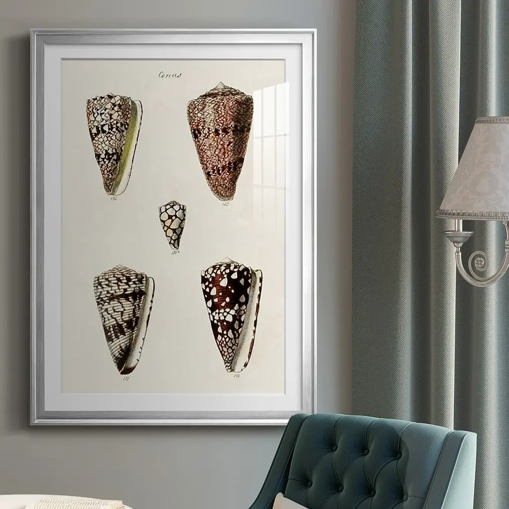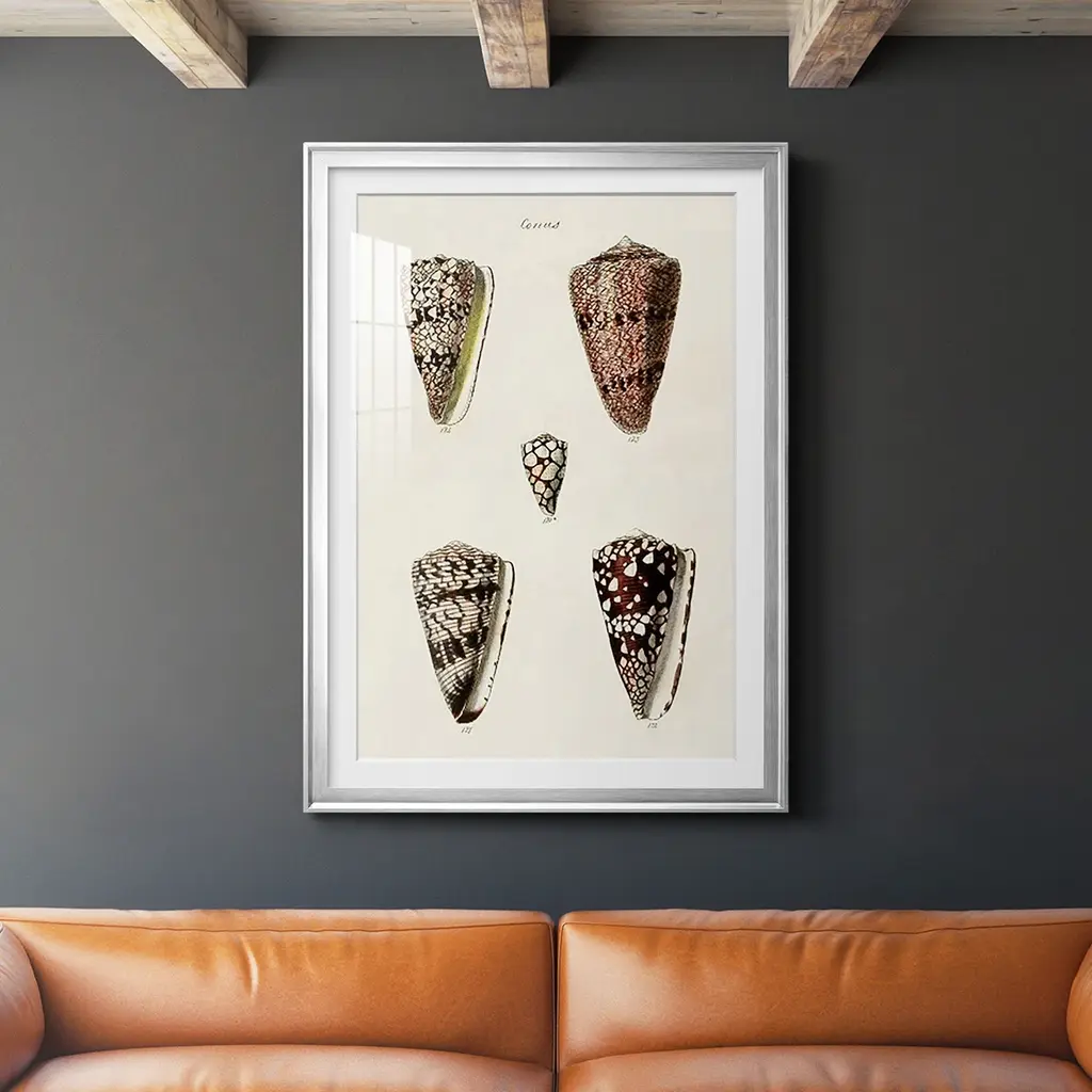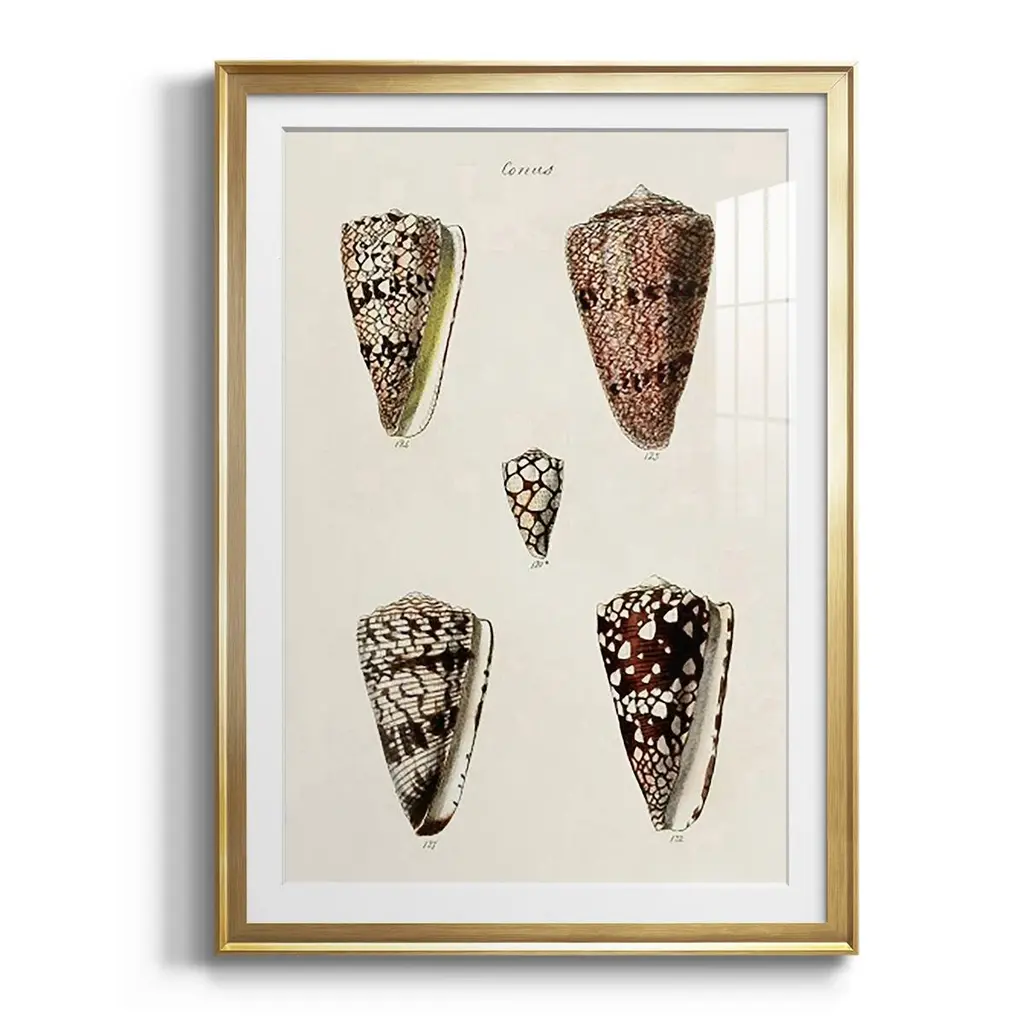 Cone Shell Collection III Premium Framed Print - Ready to Hang A Premium Framed Print created to last. Framed in distressed wood and available in an array of sizes and colors Featuring a beveled a solid wood stretcher bar, each piece comes ready to hand 4 SIZES AVAILABLE 30.5''X42.5'' - Overall Size 26.5'X36.5'' - Overall Size 22.5''x30.5'' - Overall Size 18.5''x24.5'' - Overall Size Each piece is made to order. Each piece comes with hanging hardware. Made in the USA Ready to Hang Giclee Paper Print Acrylic Glass Beveled Matt Board