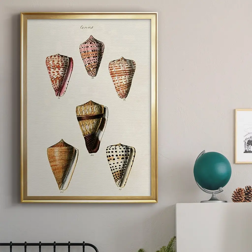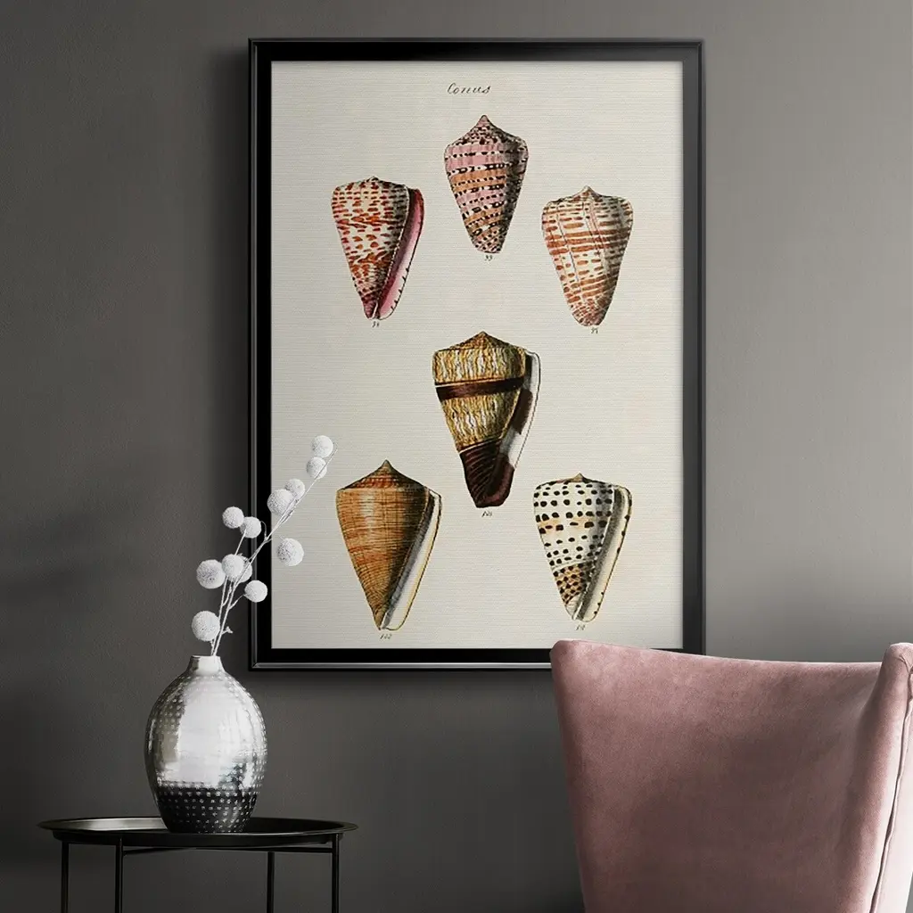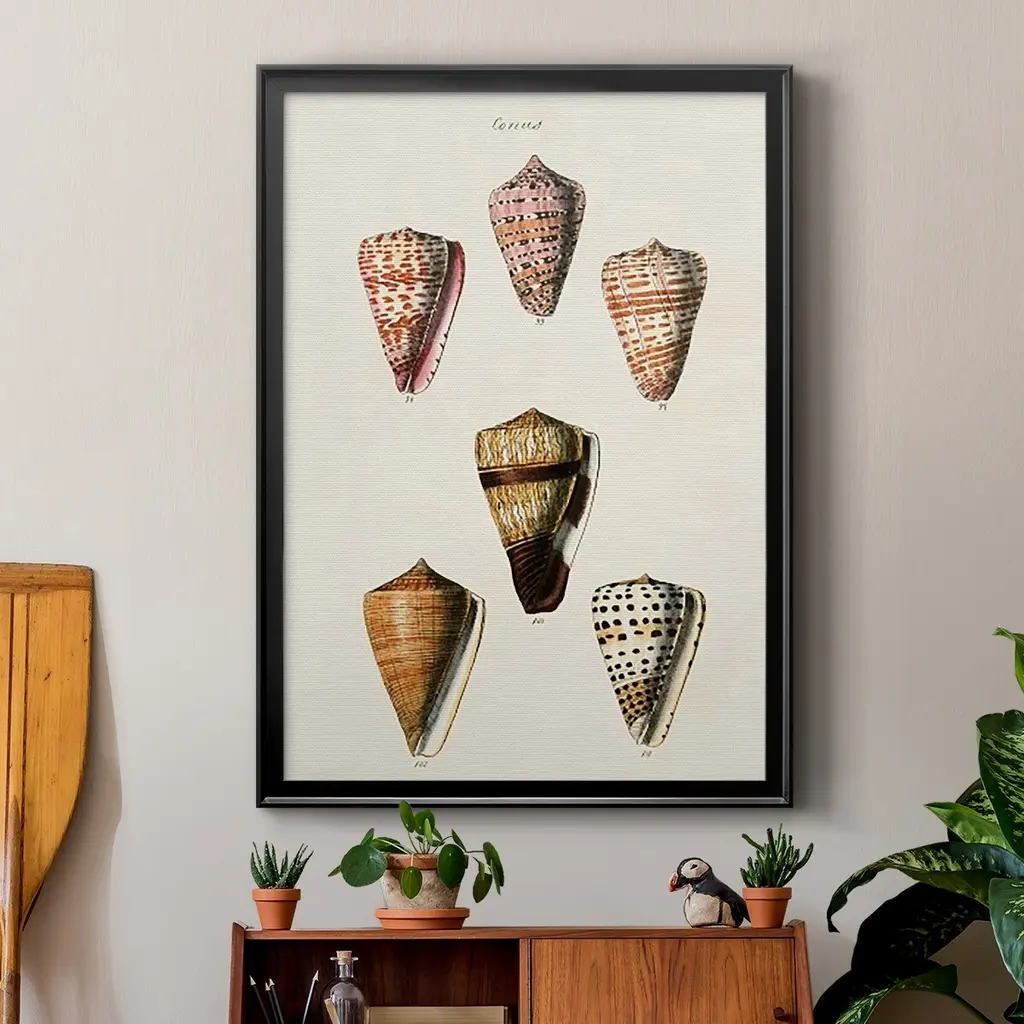 Cone Shell Collection IV Premium Framed Print - Ready to Hang A Premium Framed Print created to last. Framed in distressed wood and available in an array of sizes and colors Featuring a beveled a solid wood stretcher bar, each piece comes ready to hand 4 SIZES AVAILABLE 30.5''X42.5'' - Overall Size 26.5'X36.5'' - Overall Size 22.5''x30.5'' - Overall Size 18.5''x24.5'' - Overall Size Each piece is made to order. Each piece comes with hanging hardware. Made in the USA Ready to Hang