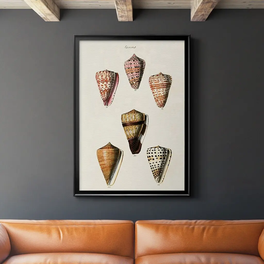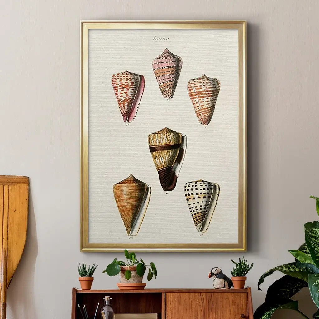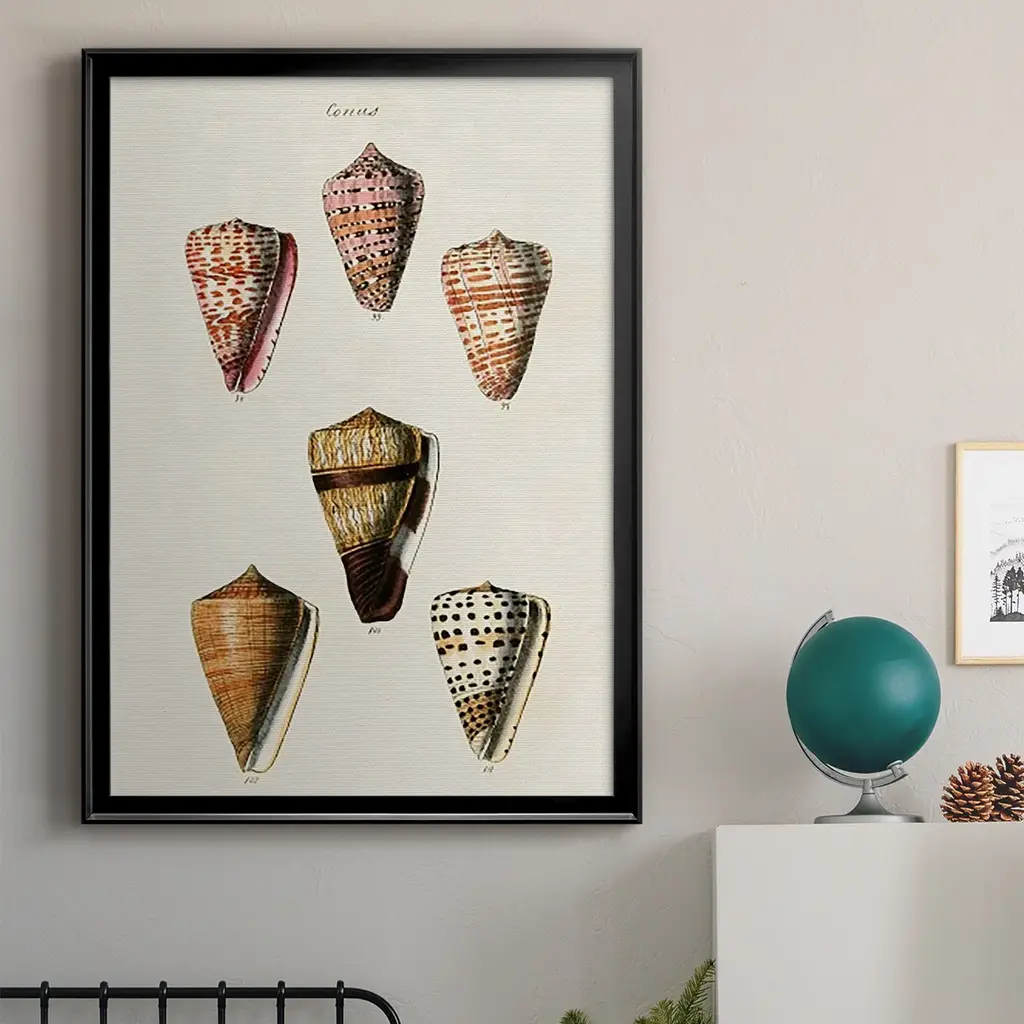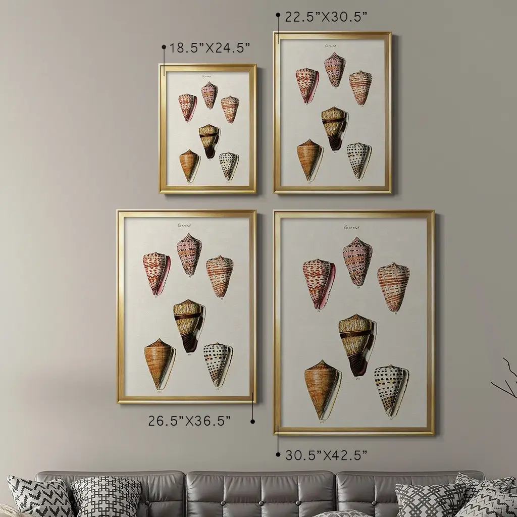 Cone Shell Collection IV Premium Framed Print - Ready to Hang A Premium Framed Print created to last. Framed in distressed wood and available in an array of sizes and colors Featuring a beveled a solid wood stretcher bar, each piece comes ready to hand 4 SIZES AVAILABLE 30.5''X42.5'' - Overall Size 26.5'X36.5'' - Overall Size 22.5''x30.5'' - Overall Size 18.5''x24.5'' - Overall Size Each piece is made to order. Each piece comes with hanging hardware. Made in the USA Ready to Hang