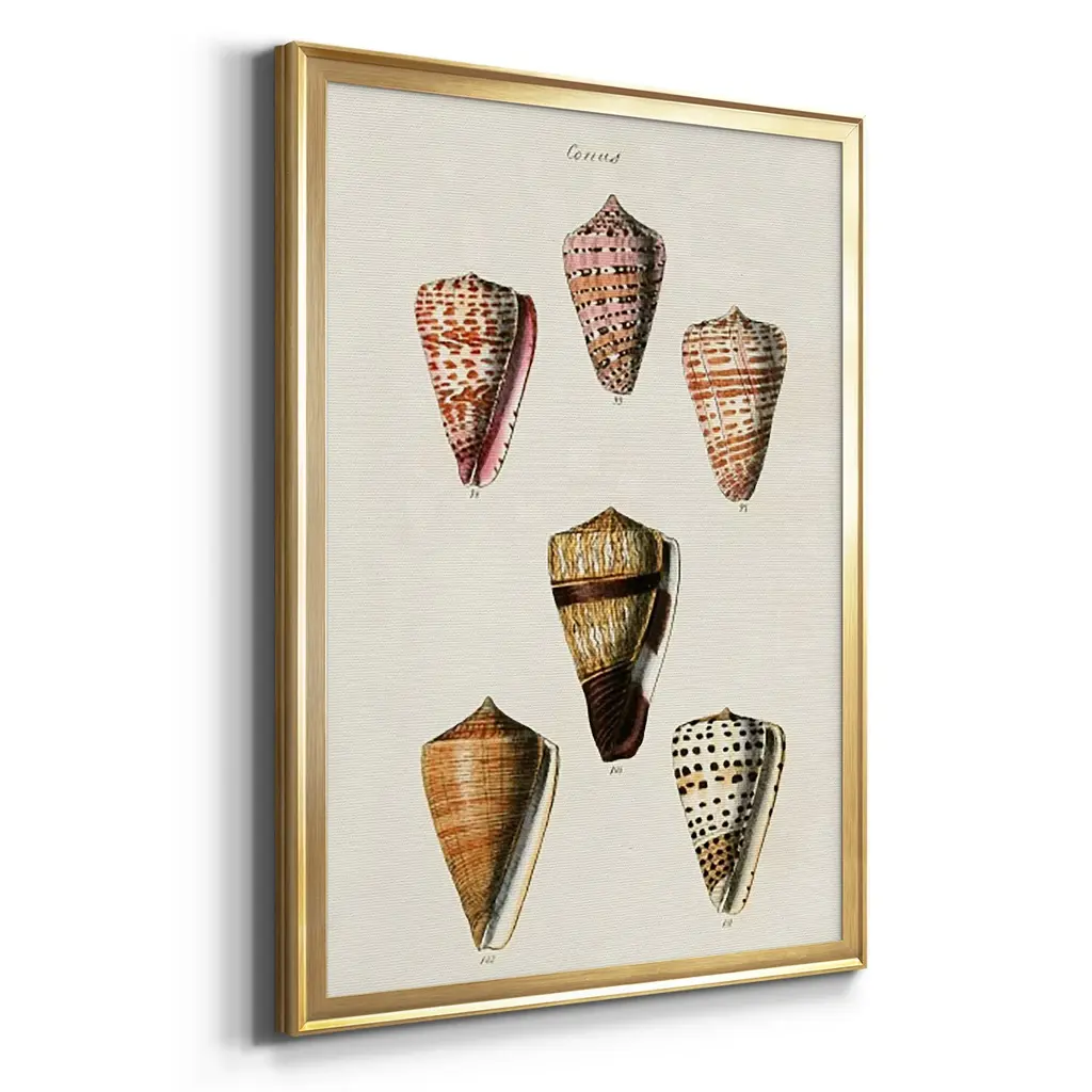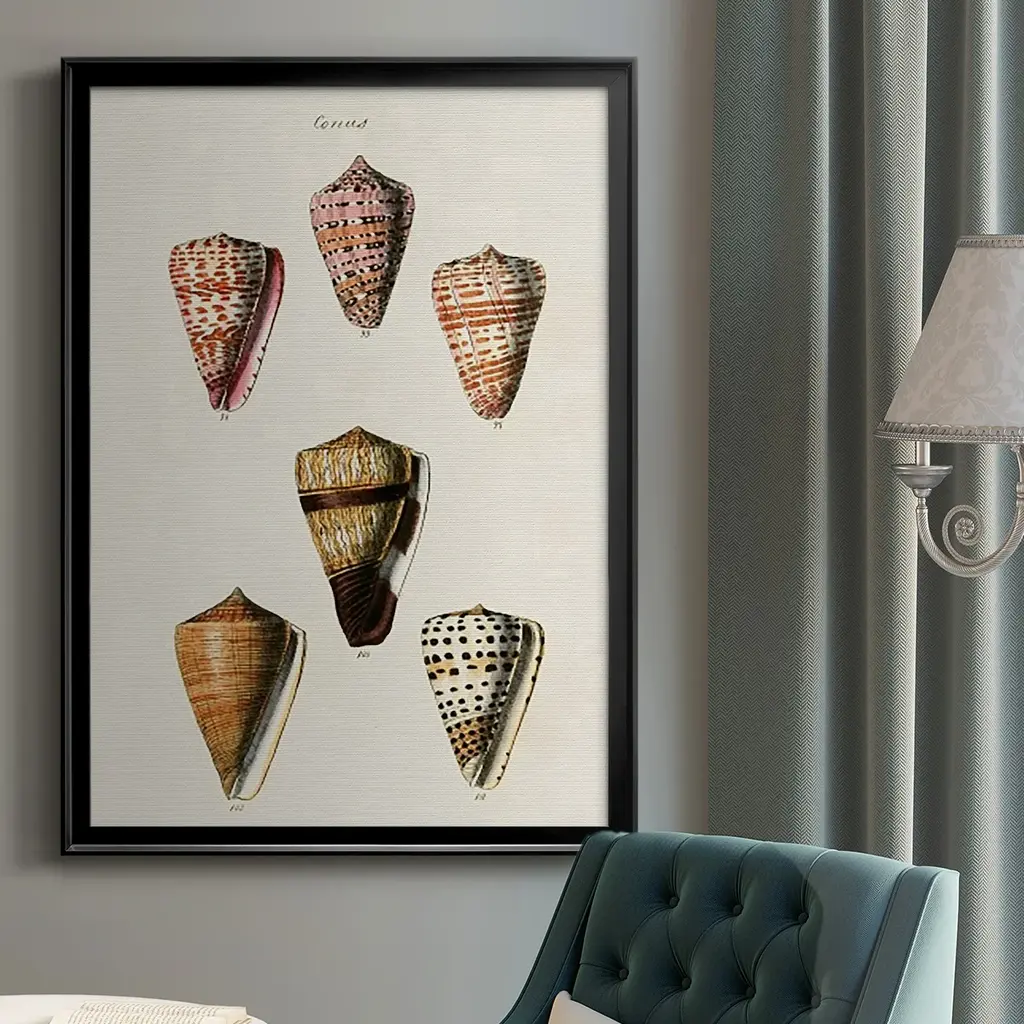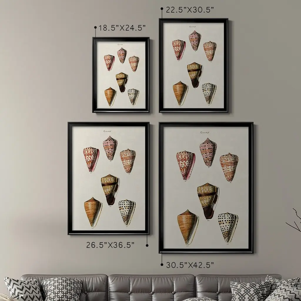 Cone Shell Collection IV Premium Framed Print - Ready to Hang A Premium Framed Print created to last. Framed in distressed wood and available in an array of sizes and colors Featuring a beveled a solid wood stretcher bar, each piece comes ready to hand 4 SIZES AVAILABLE 30.5''X42.5'' - Overall Size 26.5'X36.5'' - Overall Size 22.5''x30.5'' - Overall Size 18.5''x24.5'' - Overall Size Each piece is made to order. Each piece comes with hanging hardware. Made in the USA Ready to Hang