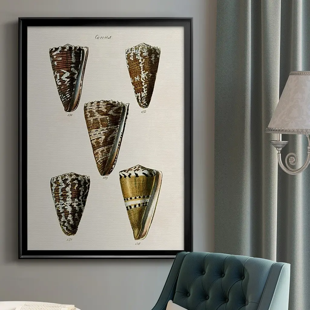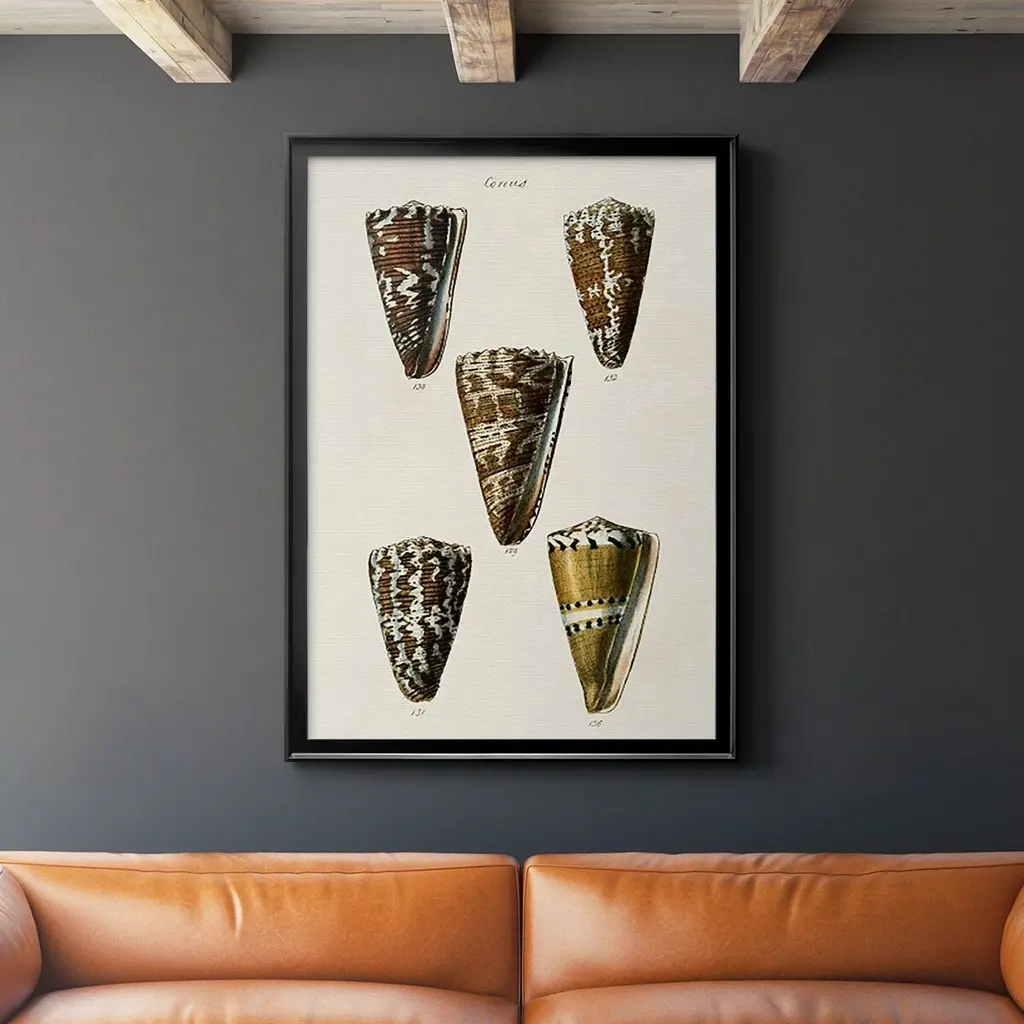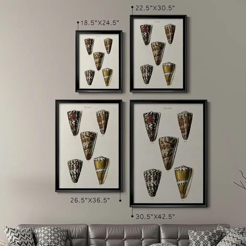 Cone Shell Collection V Premium Framed Print - Ready to Hang A Premium Framed Print created to last. Framed in distressed wood and available in an array of sizes and colors Featuring a beveled a solid wood stretcher bar, each piece comes ready to hand 4 SIZES AVAILABLE 30.5''X42.5'' - Overall Size 26.5'X36.5'' - Overall Size 22.5''x30.5'' - Overall Size 18.5''x24.5'' - Overall Size Each piece is made to order. Each piece comes with hanging hardware. Made in the USA Ready to Hang