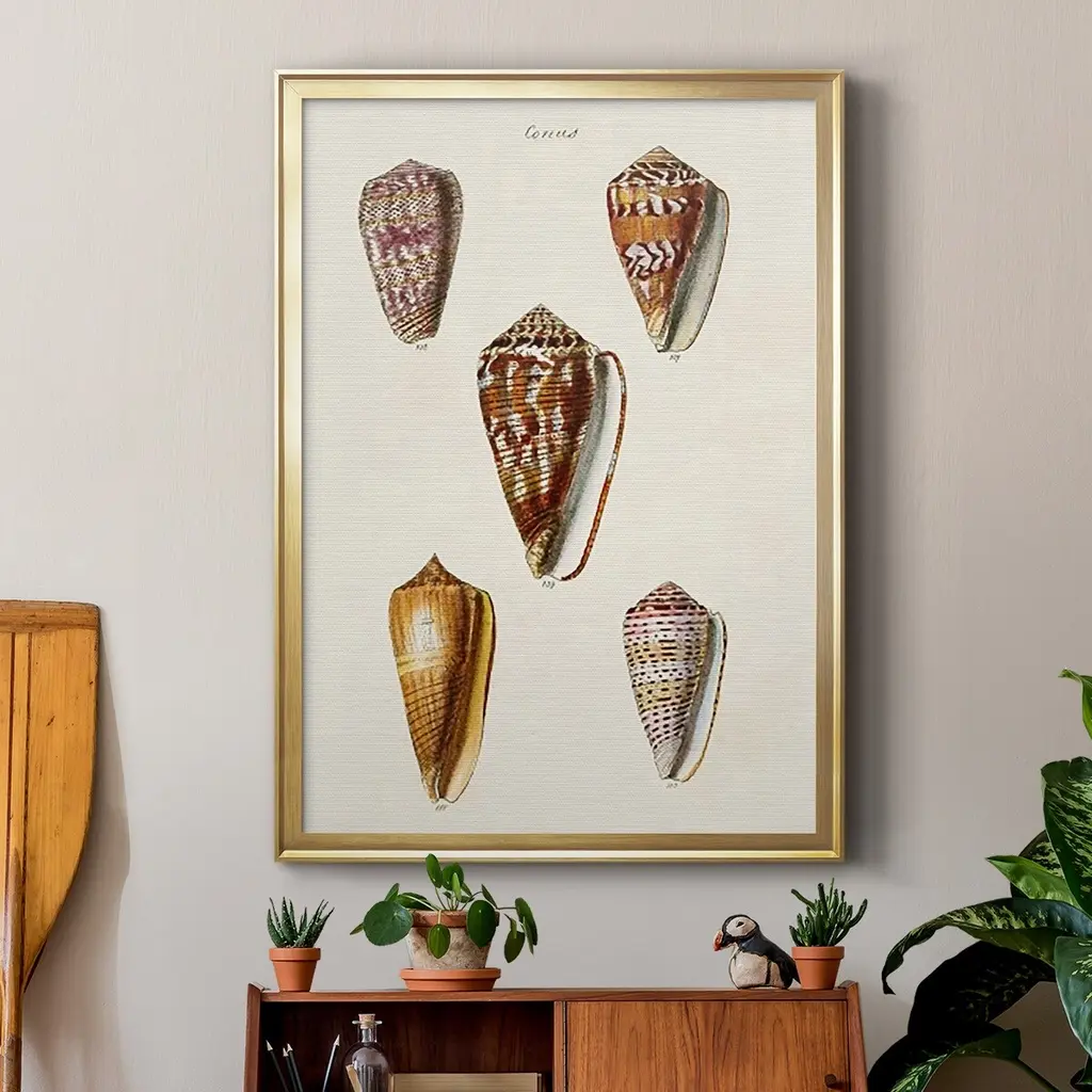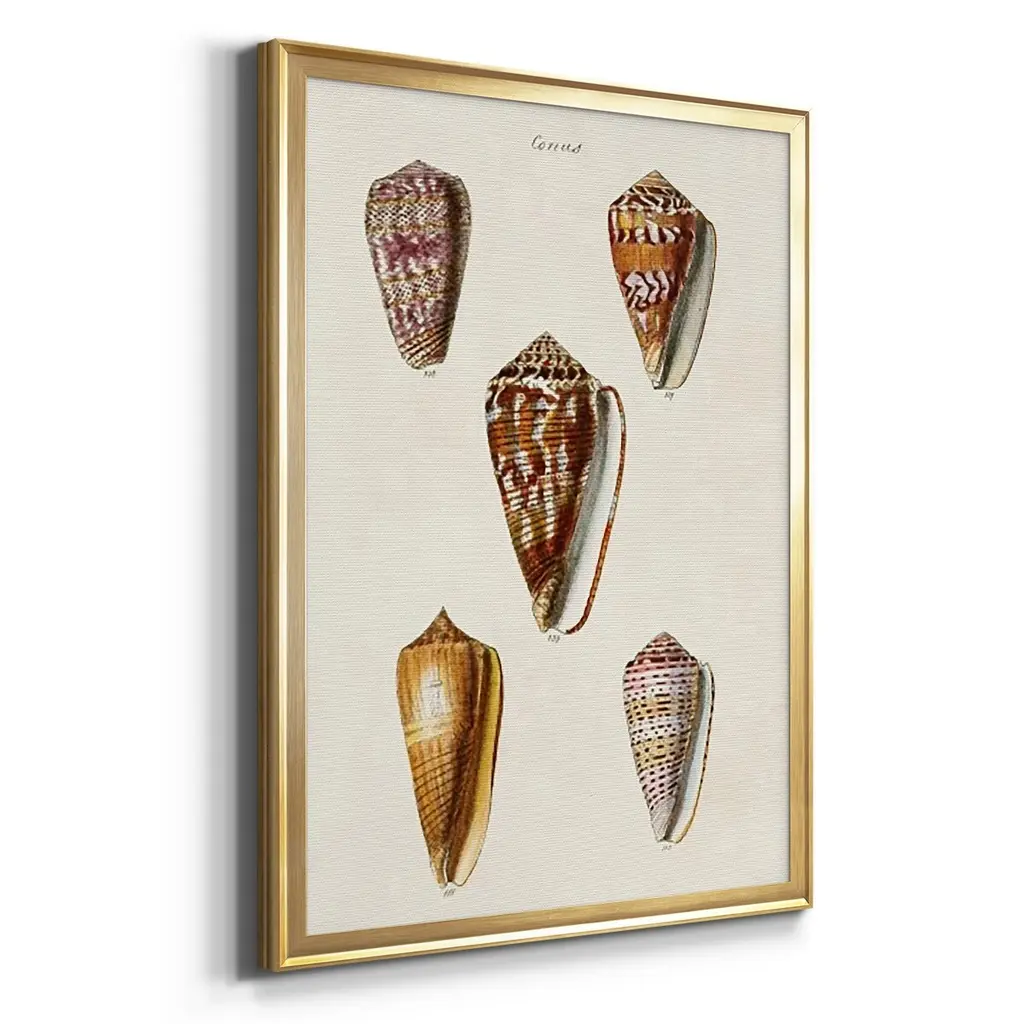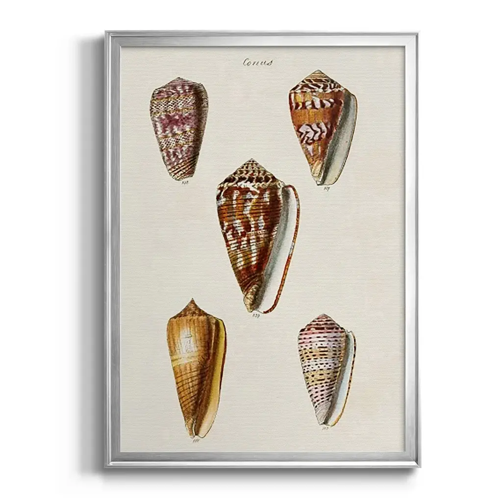 Cone Shell Collection VI Premium Framed Print - Ready to Hang A Premium Framed Print created to last. Framed in distressed wood and available in an array of sizes and colors Featuring a beveled a solid wood stretcher bar, each piece comes ready to hand 4 SIZES AVAILABLE 30.5''X42.5'' - Overall Size 26.5'X36.5'' - Overall Size 22.5''x30.5'' - Overall Size 18.5''x24.5'' - Overall Size Each piece is made to order. Each piece comes with hanging hardware. Made in the USA Ready to Hang