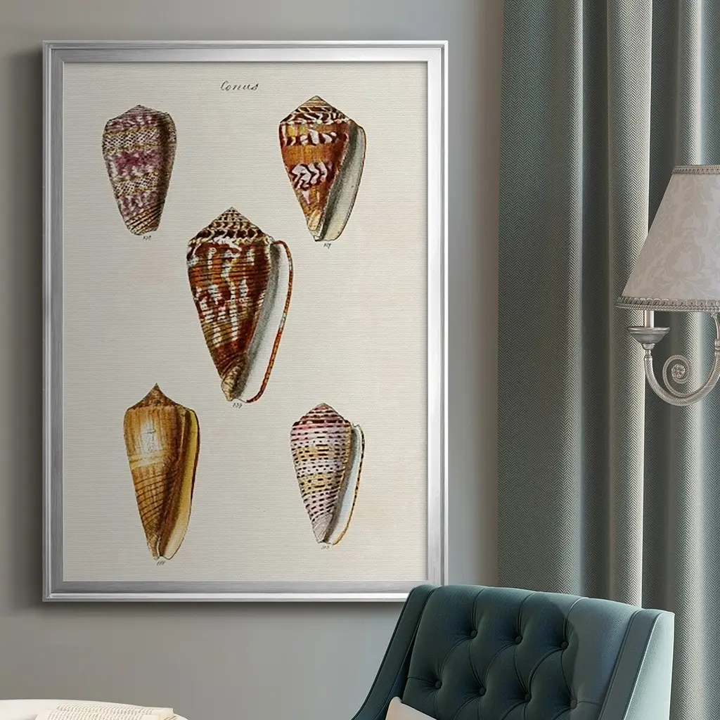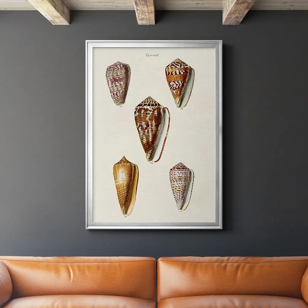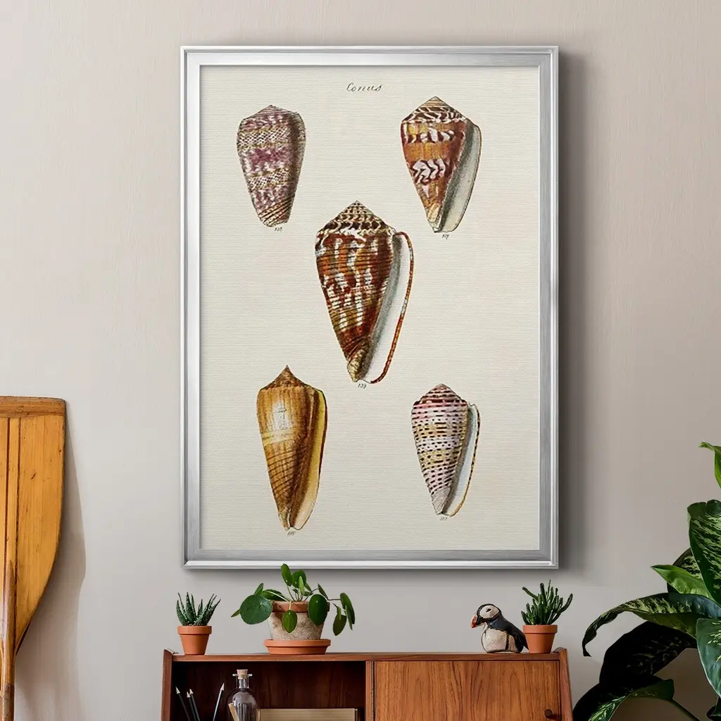 Cone Shell Collection VI Premium Framed Print - Ready to Hang A Premium Framed Print created to last. Framed in distressed wood and available in an array of sizes and colors Featuring a beveled a solid wood stretcher bar, each piece comes ready to hand 4 SIZES AVAILABLE 30.5''X42.5'' - Overall Size 26.5'X36.5'' - Overall Size 22.5''x30.5'' - Overall Size 18.5''x24.5'' - Overall Size Each piece is made to order. Each piece comes with hanging hardware. Made in the USA Ready to Hang