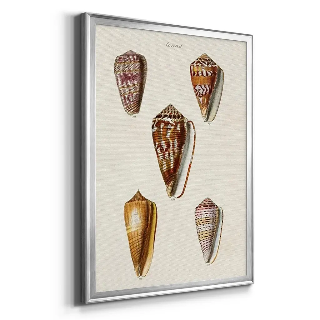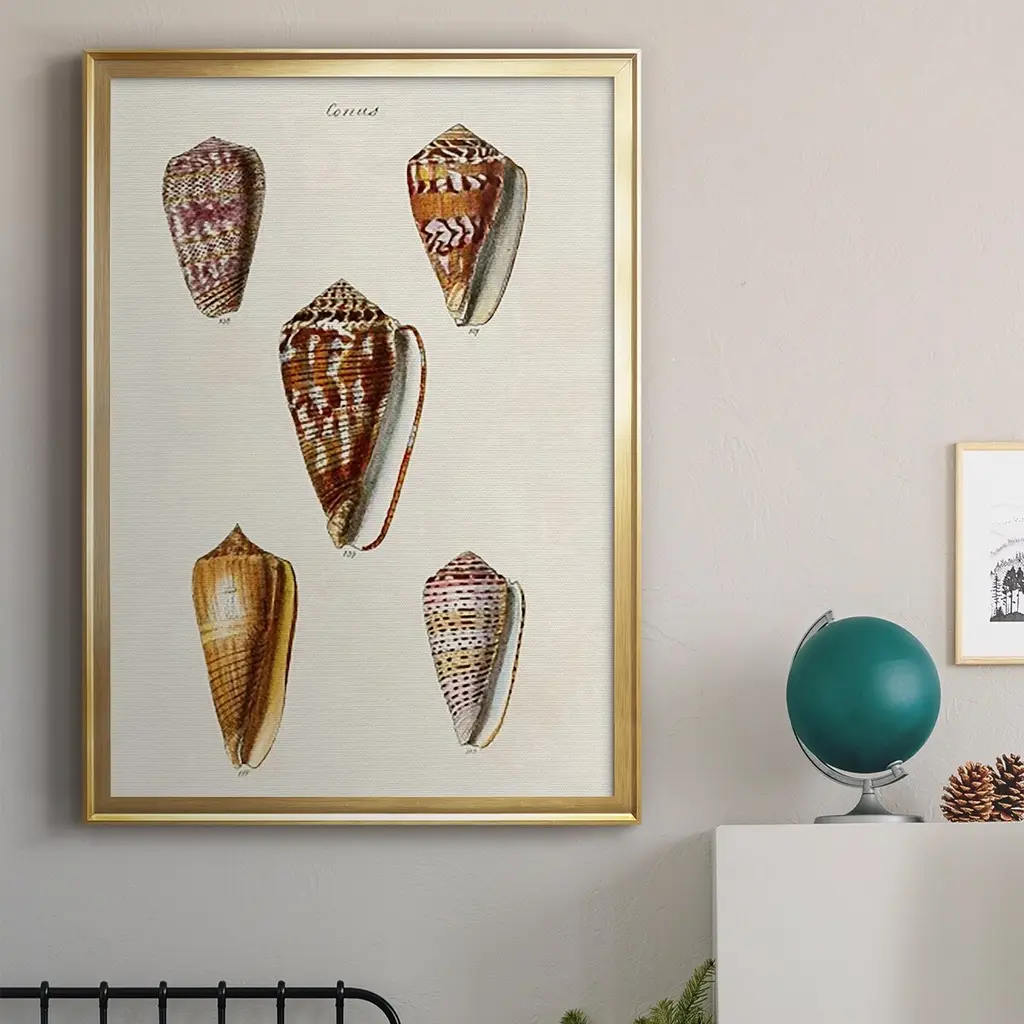 Cone Shell Collection VI Premium Framed Print - Ready to Hang A Premium Framed Print created to last. Framed in distressed wood and available in an array of sizes and colors Featuring a beveled a solid wood stretcher bar, each piece comes ready to hand 4 SIZES AVAILABLE 30.5''X42.5'' - Overall Size 26.5'X36.5'' - Overall Size 22.5''x30.5'' - Overall Size 18.5''x24.5'' - Overall Size Each piece is made to order. Each piece comes with hanging hardware. Made in the USA Ready to Hang