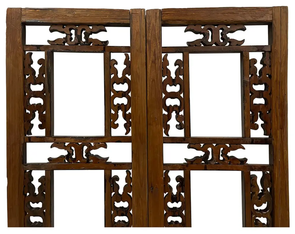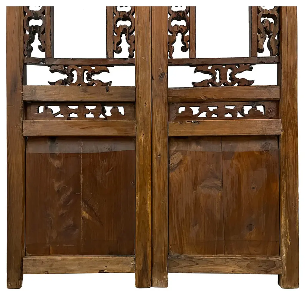 This is a pair of Chinese antique Open Carved interior wooden Window Screen Panels. It features beautiful open carved Chinese traditional folk art design on it and some detailed decorative carving. Look at the beautiful patterns, they are all hand carved. Take look at the pictures, a highly desirable antique collectible that is extremely popular and hard to come by. Don''t miss it!Size: 48.5in H x 14.5in W x 1.25in D eachOrigin: ChinaCirca: 1850 - 1900Material: WoodCondition: Solid wood construction, wonderful primitive condition, hand made, hand carved, full of patina, normal age wear Disclaimer: Due to differences in monitor/screen settings, product colors may differ slightly between product photos and the physical product.