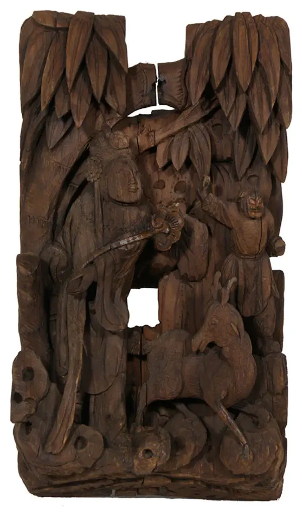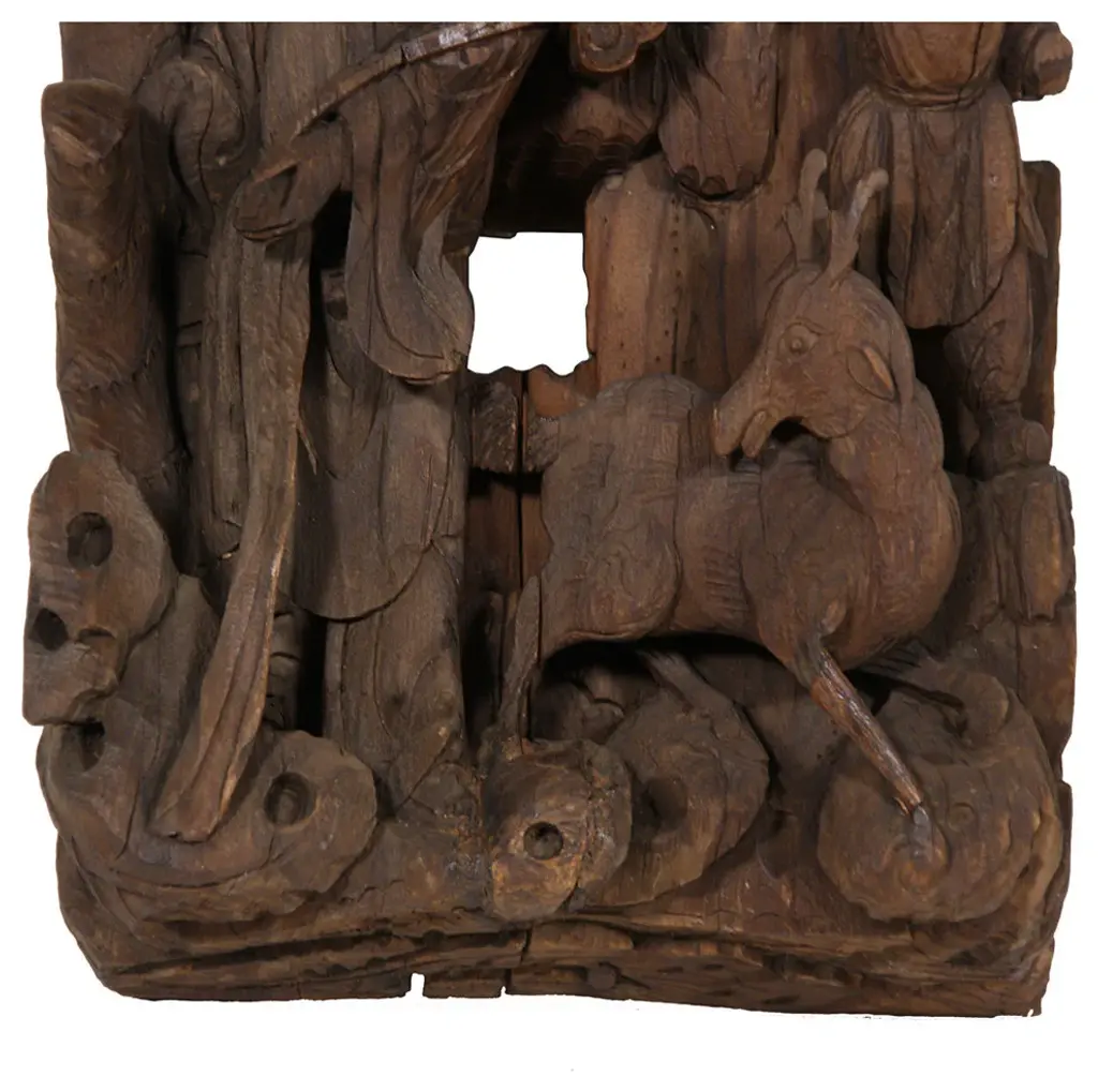Look at this Chinese antique wood carving panel, it has very deep 3D carving works of Chinese folks art - deer and immortal holding a glossy ganoderma- meaning longevity. It was used as the wall decor on the corridor of the house. Take look at the pictures, a highly desirable antique collectible items and hard to come by.Size: 17in H x 10in W x 5in DOrigin: Shan xi, ChinaCirca: 1850 - 1900Material: Duan woodCondition: Solid wood and wonderful primitive condition, hand carved, full of patina, normal age wear