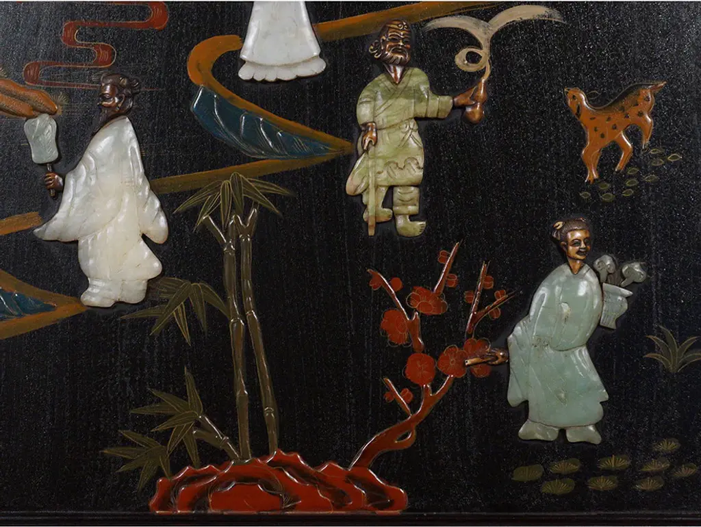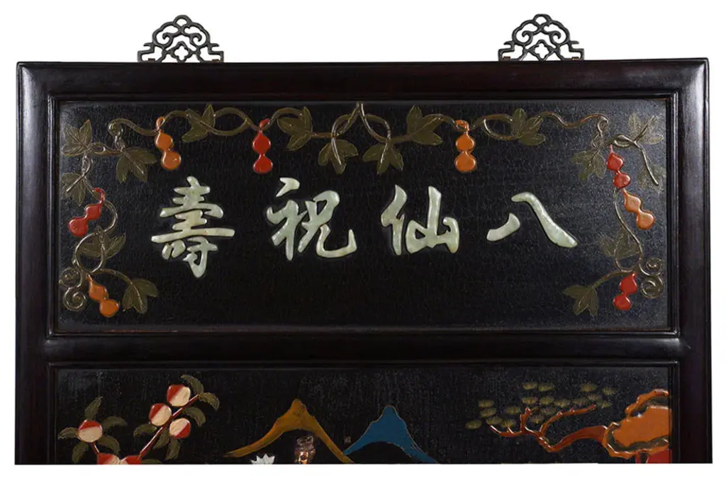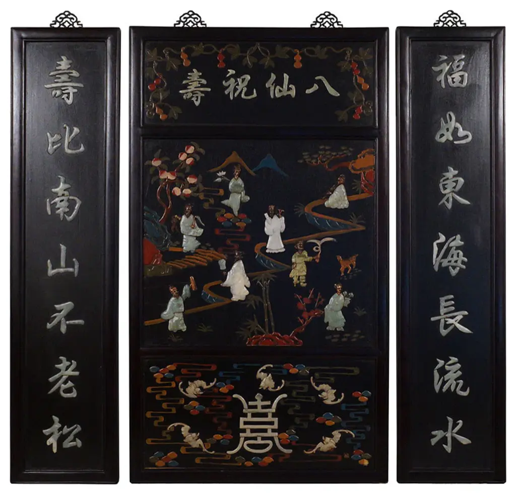 This is a set of 3 panels Chinese antique Rosewood with Jade inlayed Panels. They were hand made and hand painted. It features beautiful detailed carved painting and jade inlayed of Chinese traditional design - 8 immortals wishing longevity on center panel and Jade inlayed Chinese calligraphy of wishing longevity poem on the two side panels. All together make the perfect gift for the elder people. Take look at the pictures on the left, a highly desirable antique collectible that is extremely popular and hard to come by. More photos available when request.Size: two side panel: 56 1/2in H x 13in W x 1 1/2in D eachCenter panel: 56 1/2in H x 31 1/2in W x 1 1/2in DTotal wide for three panels: 57 1/2in WOrigin: ChinaCirca: 1900 - 1940Material: Rosewood with Jade inlayCondition: Original finished hand made, Hand paint, normal age wear.