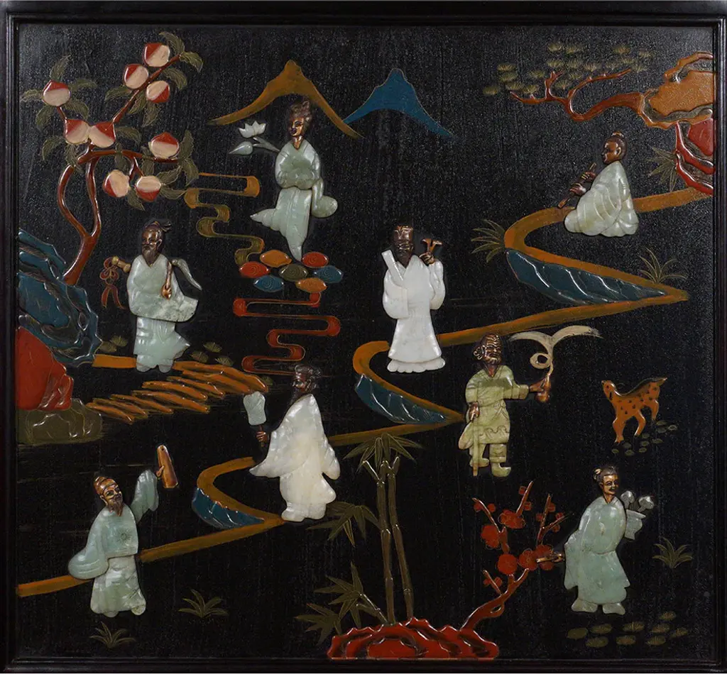 Consigned Chinese Antique Rosewood With Jade Inlayed Panels, Wall Hanging 27x11