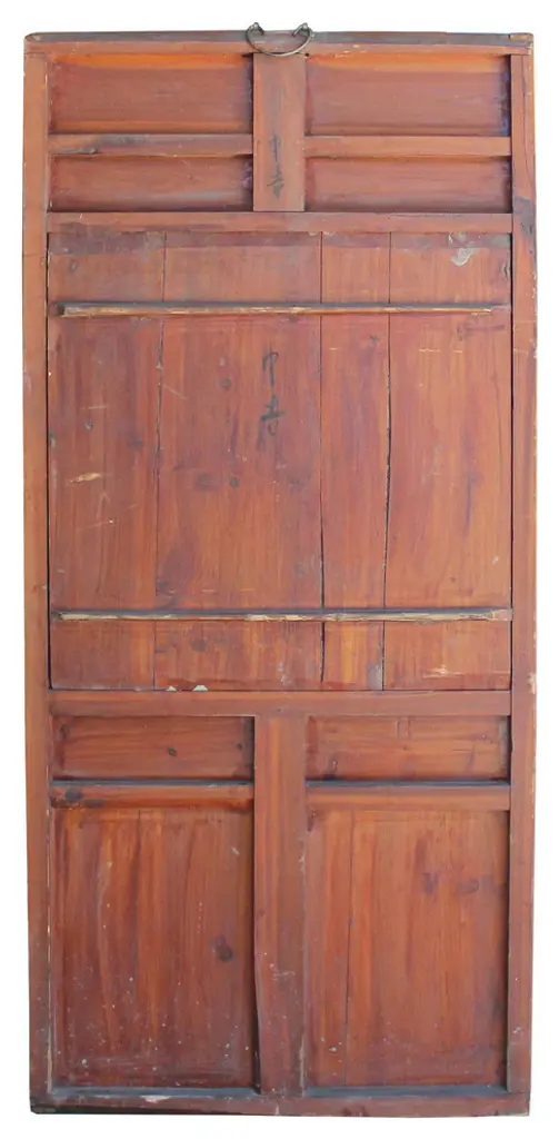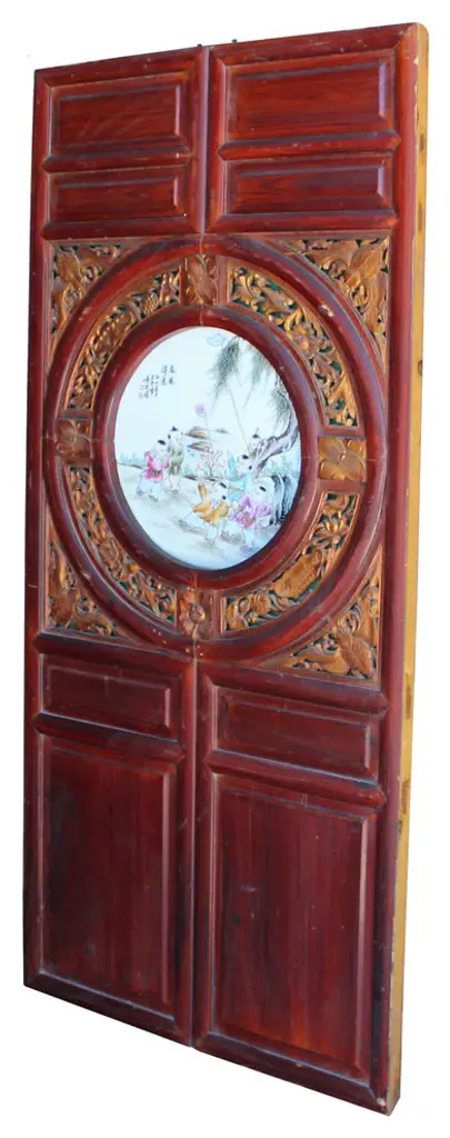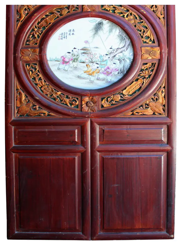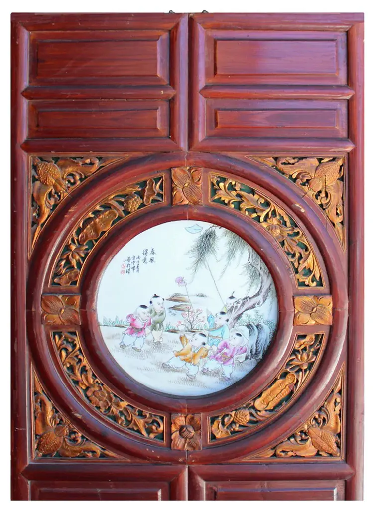 This is a vintage wooden wall decor panel screen with a brown stain finish. It has precise relief carving motif surrounding the round shape porcelain inset at the center. It is a charm wall decoration, or as a room divider or as a mirror frame.Dimensions: w25.25" x h55" x thickness 1.5"Origin: ChinaMaterial: Wood, porcelainCondition: Vintage finish, wear out marksWork: No Assembly Required, Era : 1940~