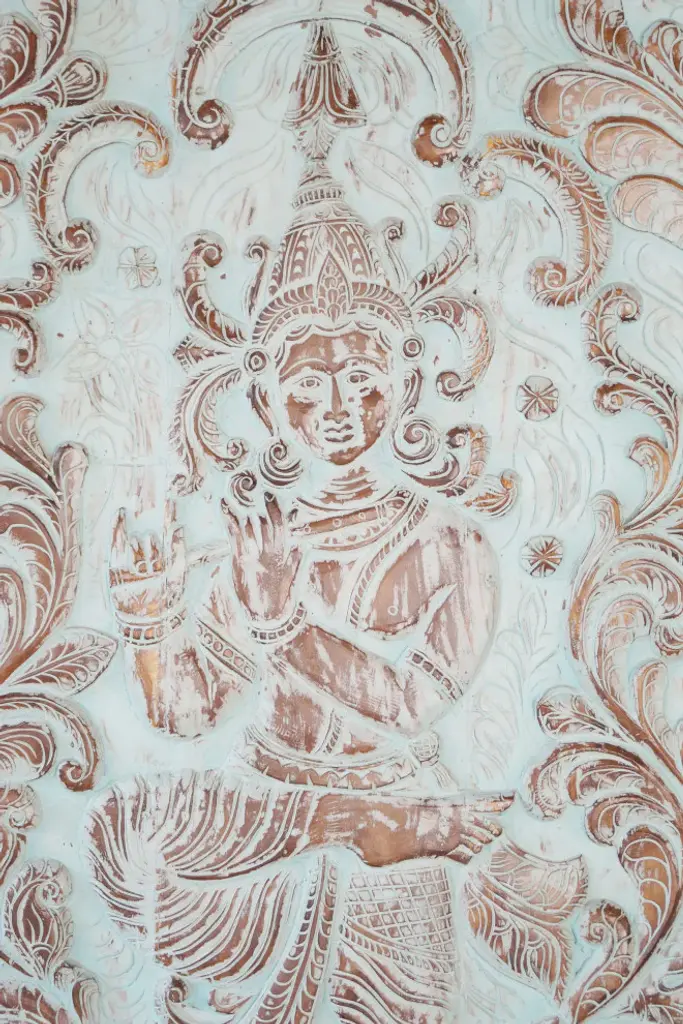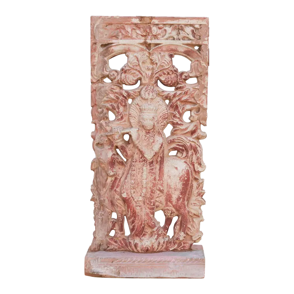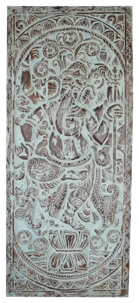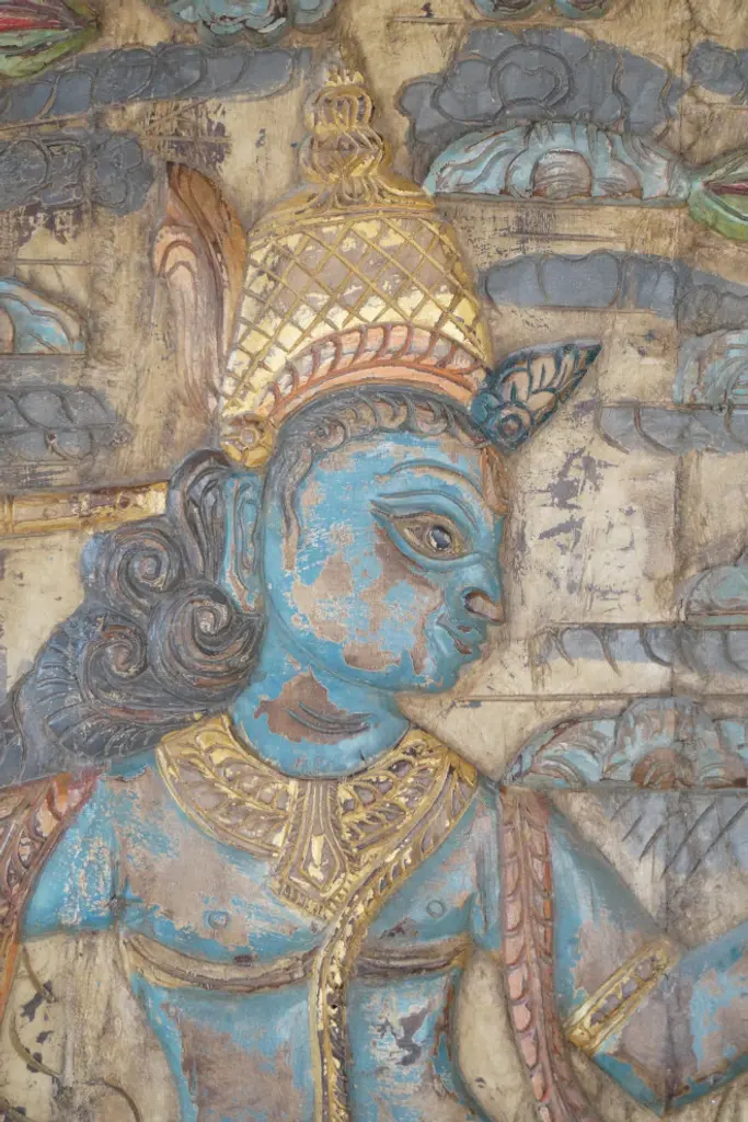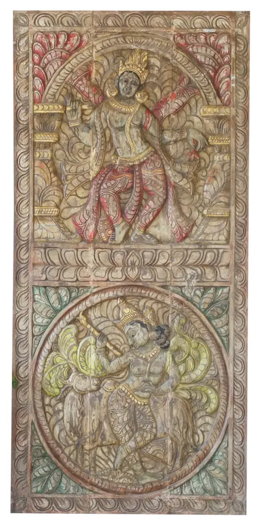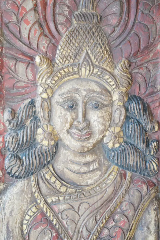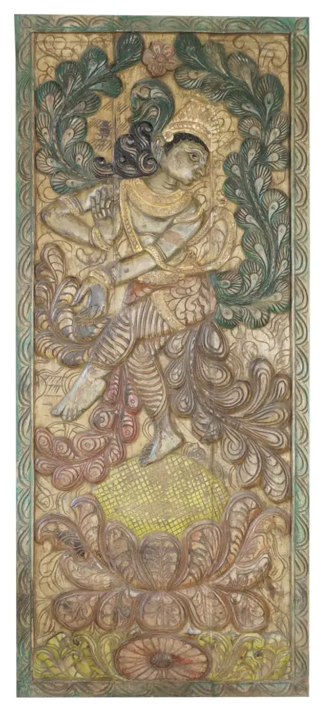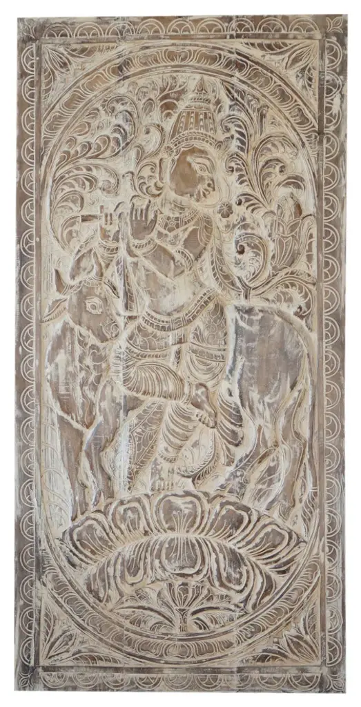 Add a touch of divine artistry and wellness to your space with this Dancing Krishna Accent Wall Décor Carved Wood Barn Door. Krishna in his joyous colors dancing gracefully on the multi-headed snake Kaliya symbolizes divine intervention that brings about change. Use as headboard, wall paneling or as a custom barn door to your sanctuary or zen studioCrafted from reclaimed wood by skilled artisans, the panel showcases detailed carvings inspired by traditional Indian motifs.Exterior Dimensions : 83x36x1.5inchesHARDWARE NOT INCLUDEDThe back of the door is rustic and has supporting woods that run horizontally, The carved door is pieced together from old vintage woods.Era - 2000, handmade from Vintage woods country of Origin- India
