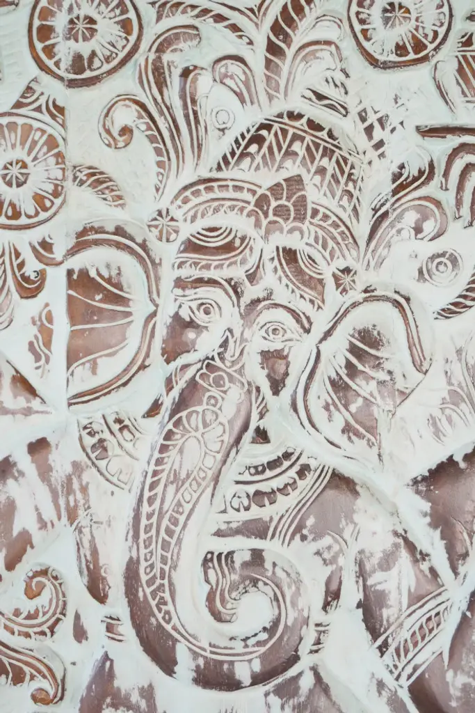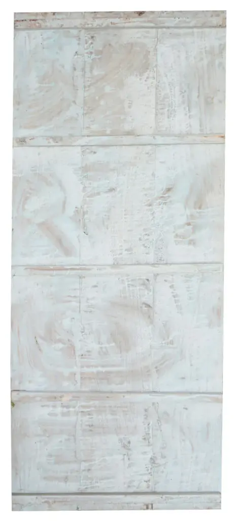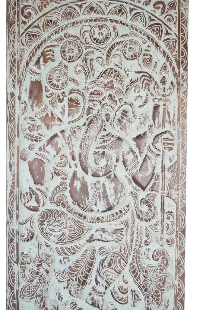 This Vintage Carved Panel Door showcases an intricately hand-carved depiction of Hindu Lord Ganesha in his dancing form, holding a trishul (trident). The panel, crafted from reclaimed wood and finished in a soothing antique blue patina, exudes rustic charm and spiritual elegance.Each detail of this wall décor panel reflects expert craftsmanship, from the ornate carvings of Ganesha''s graceful posture to the intricate floral and geometric motifs framing the artwork. This piece embodies the essence of traditional Indian artistry, making it a striking wall art sculpture that radiates serenity and cultural heritage.Perfect as a vintage panel for an entryway, yoga studio, or meditation space, it doubles as a carved door panel or statement piece for your interiors. Its timeless beauty and spiritual symbolism will infuse your home with a tranquil and sacred ambiance, making it an extraordinary addition to eclectic or Bohemian décor styles.Exterior Dimensions : 83x36x1.5inchesHARDWARE NOT INCLUDEDThe carved door is pieced together from old vintage woods.Era - 2000, handmade from Vintage woods country of Origin- Indiawood-3506