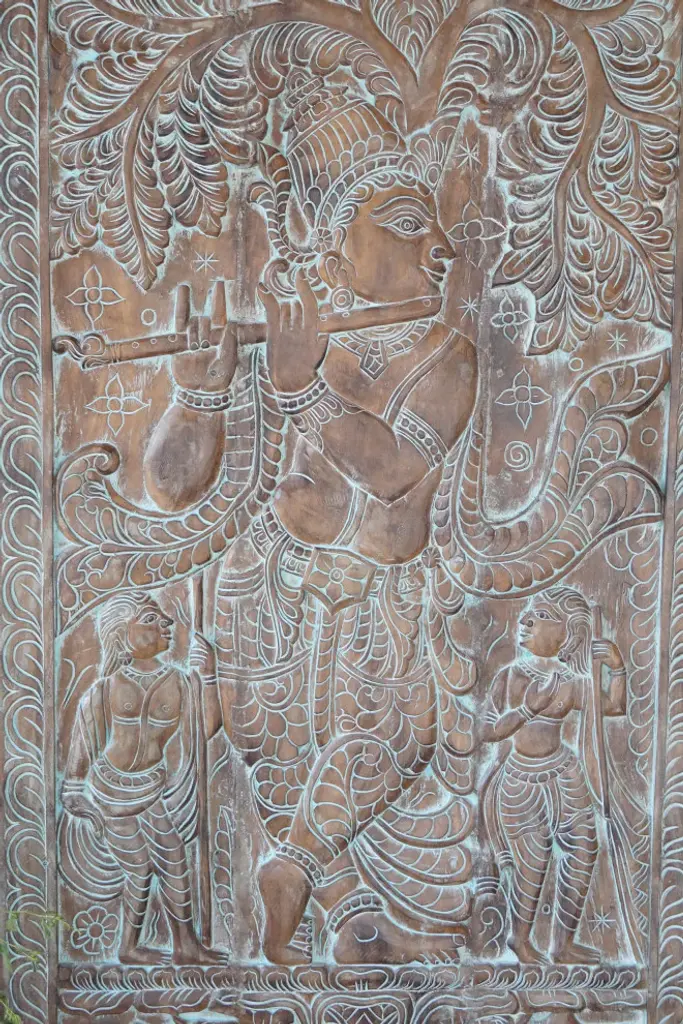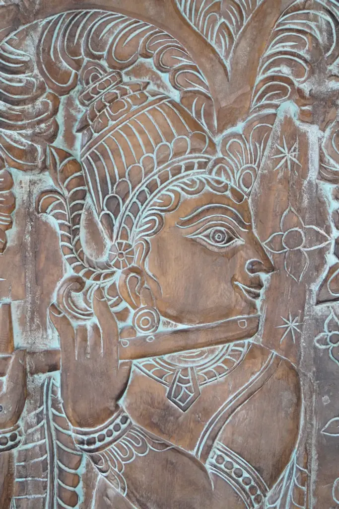 Vintage Krishna Wall Art, Hand-carved Fluting Krishna Experience beautiful holistic decor with vintage carved wall sculptures that bring in wellness energies and a connection to nature. Old washed blue patinas highlight the carved detail, use as wall art, headboard or customize into a statement door!The carved panel is handmade from old vintage woods, the back is rustic and not carvedEra - 2000, handmade from Vintage woods Country of Origin- IndiaExterior Dimensions : 72x36X1.5 INCHES
