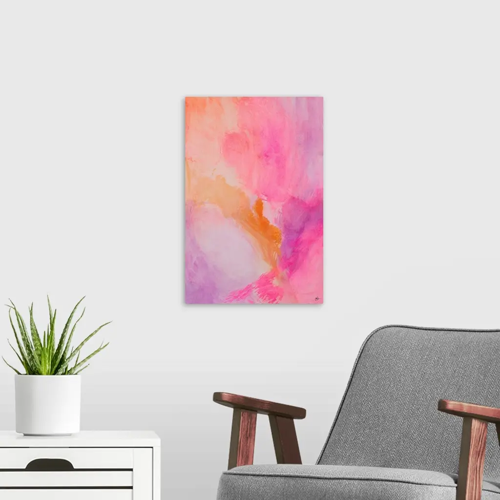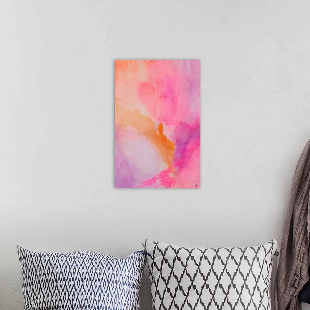 A contemporary abstract watercolor painting with warm pink, purple, and orange hues.