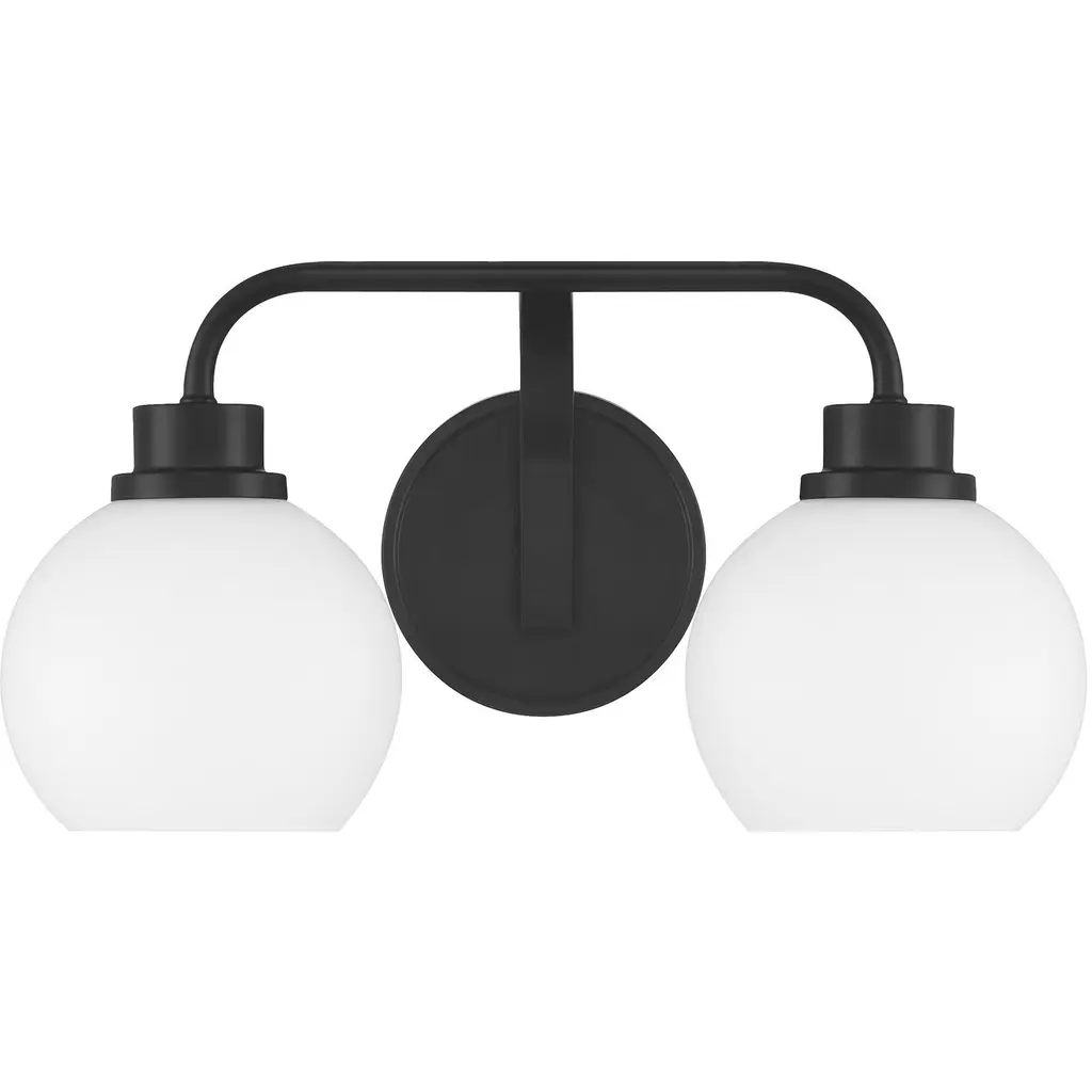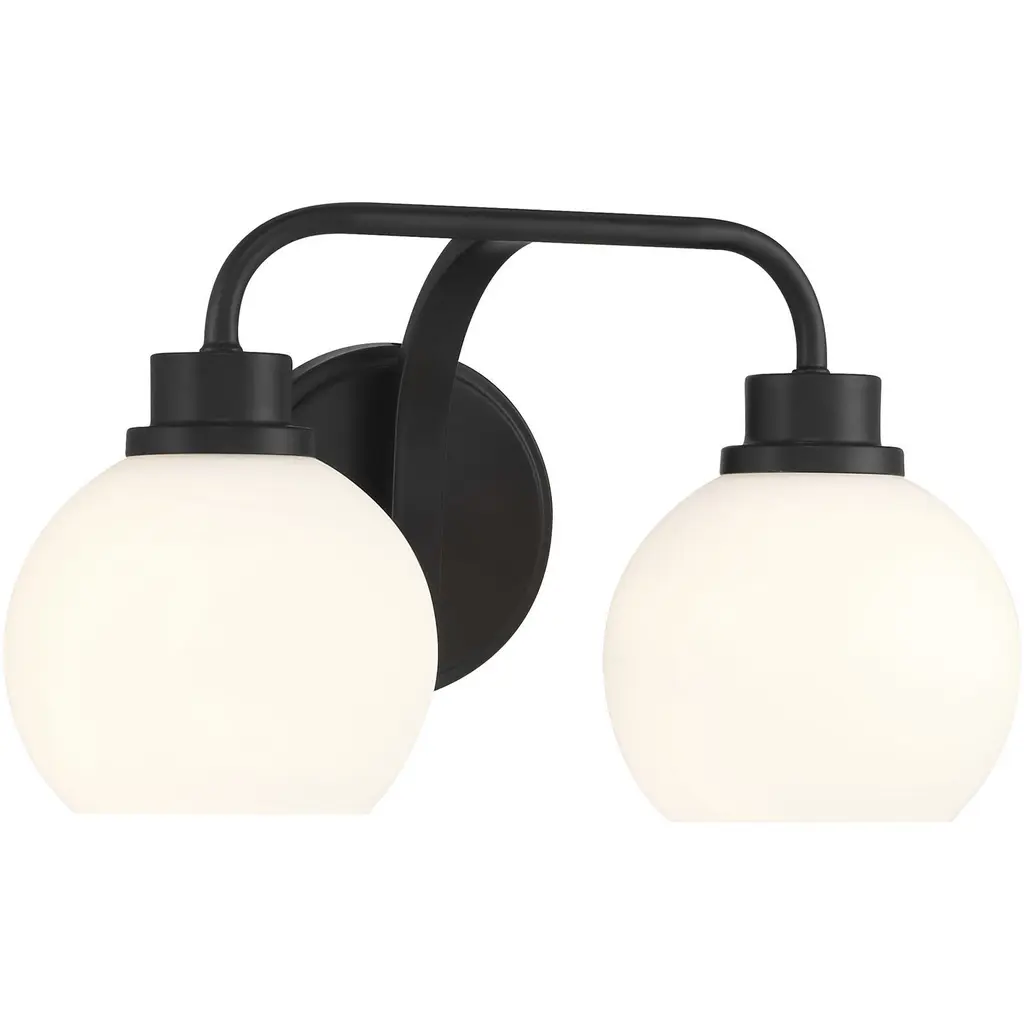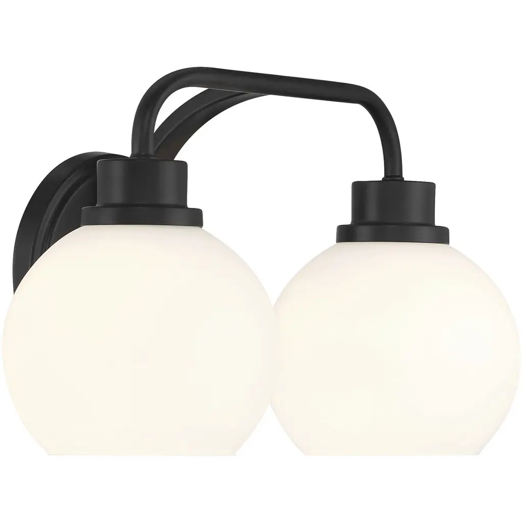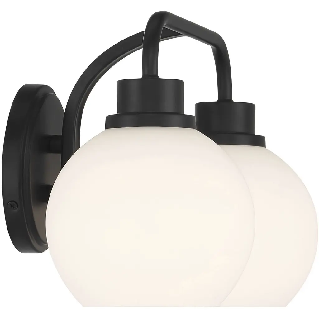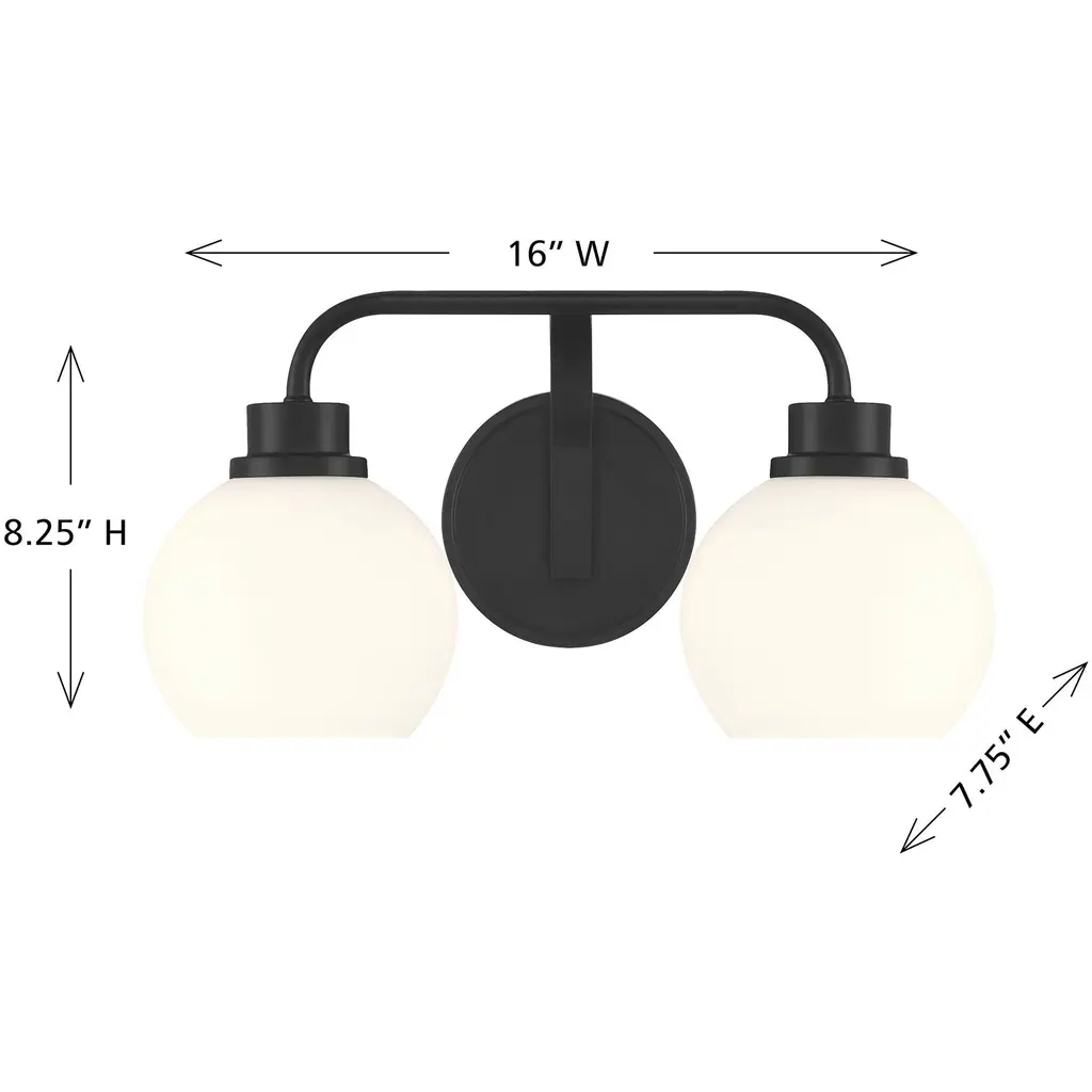 Freshen up your bathroom with the sleekly timeless style of this 2-light bath bar, which features orb-shaped shades of white opal glass that are open at the bottom and a versatile Matte Black finish. It is 8.25" in height, 16" in width and extends 7.75" from the wall. It uses 2 standard size bulbs of up to 60 watts per bulb. Bulbs not included.