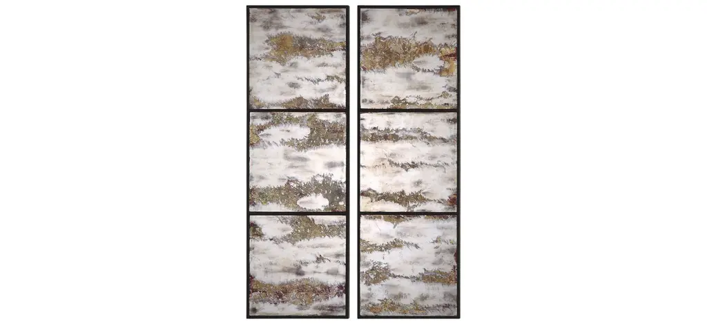 Each panel features three mirrors with a heavily oxidized antique mirror in deep earth tones. - Each panel 14"L x 42"H. Combined weight 29 lbs. - Antiqued Mirror Glass, Hardwood Composite- Properly Weighted Hanging Hardware Attached- Heirloom Quality - Expertly hand crafted and hand finished. Due to the hand crafted nature of this piece, each piece may have subtle differences.