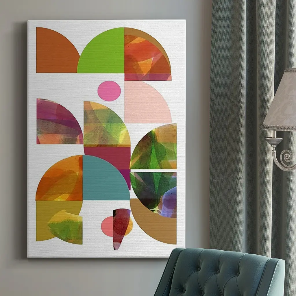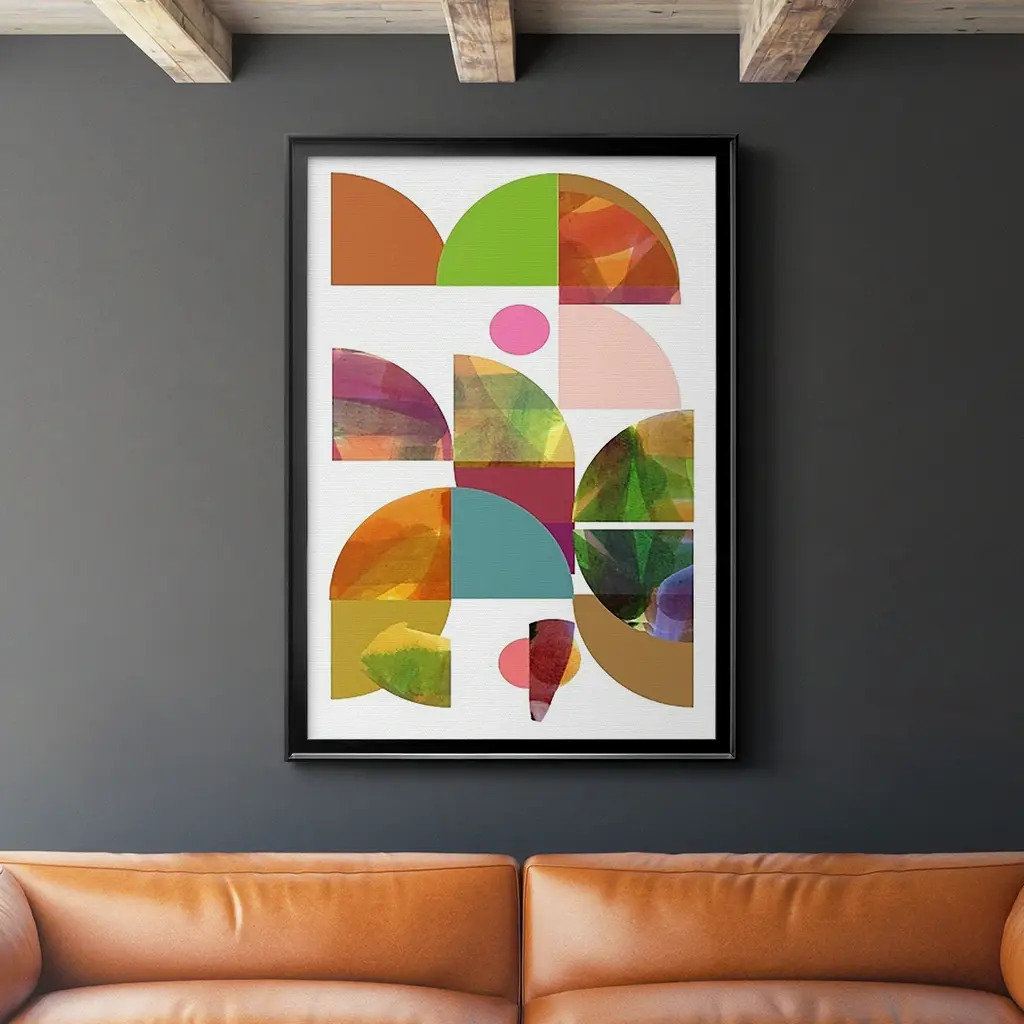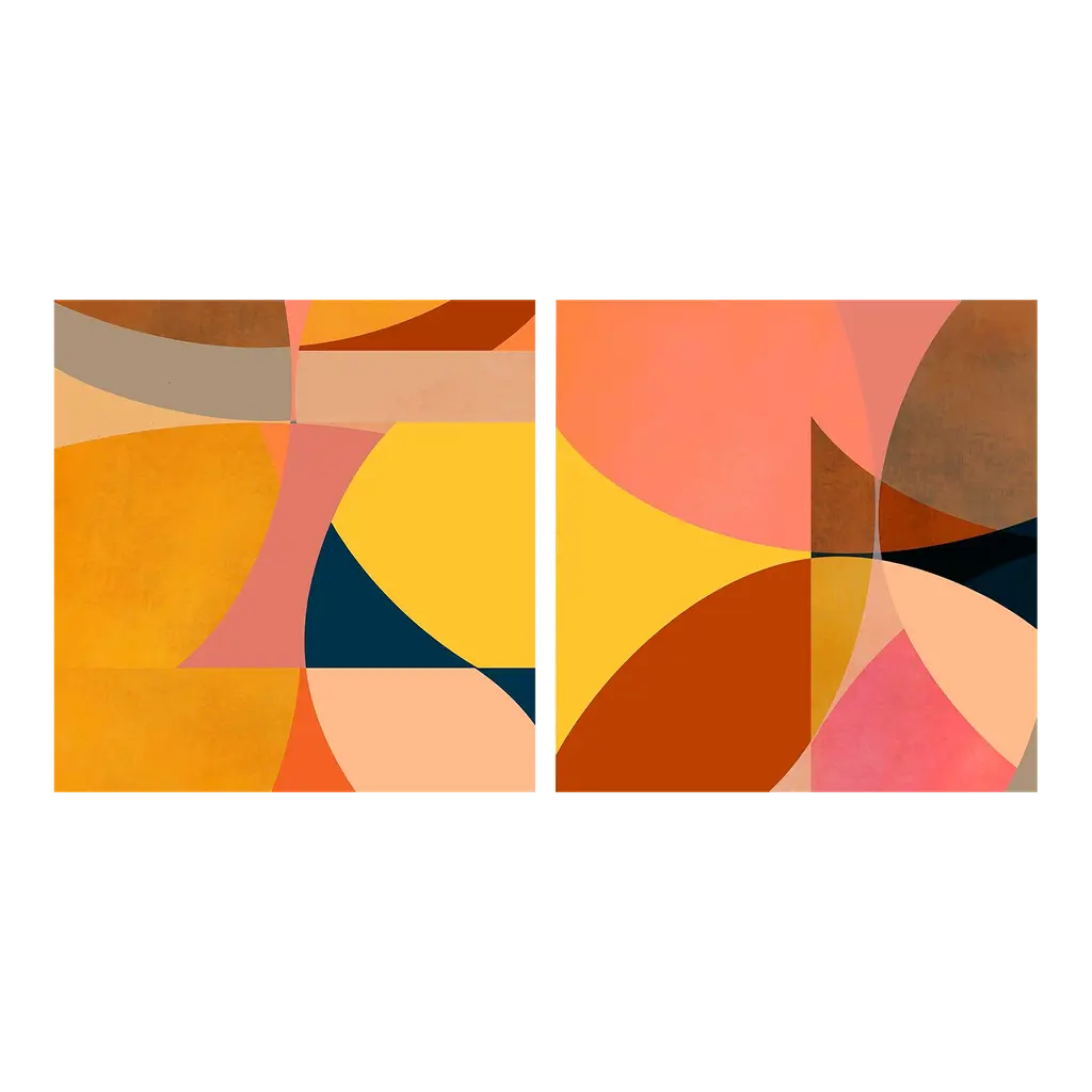 This mid-century modern geometric triptych art print set has stunning orange, pink and green colour throughout. Timeless artwork in contemporary shapes and hues for todays interior spaces. Art prints are made with exceptional quality inks on premium archival matte paper. Each of 3 fine art prints are signed and approved for the highest colour and quality. The paper print size is "16Wx24H" - actual image size is 14Wx22H inches leaving a 1 inch white border all around. About Angela Cameron Angela's art and photography career spans over several decades and achieving numerous awards along the way. Cameron's mission is to continually explore what she sees all around us and interpret with creative abstraction. Her dedication to the craft of creating artwork continues to this day with new works being introduced frequently, Cameron's work can be found in numerous hotels worldwide as well as many private collections, healthcare spaces and corporate collections.