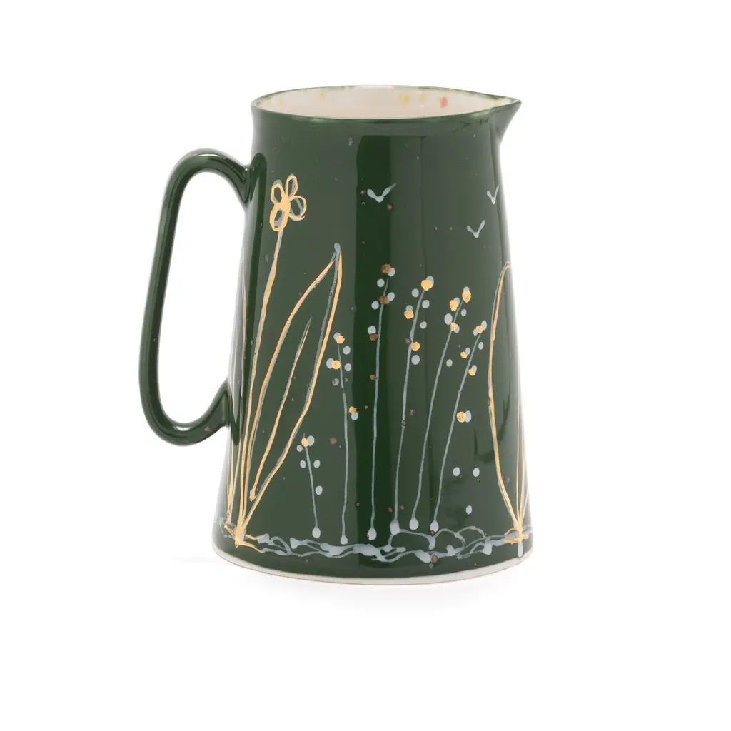 “I have been creating artworks and installations for a long time. Then over the past several years, pottery has absorbed most of my expressive energy. I follow an empirical, yet intuitive process that supports my story and experiences.”.Coralla Maiuri produces tableware, vases, wallplates, sculptures and centerpieces. Each object is entirely hand-decorated.Experimenting with materials and decorations never stops during her creative whirlwinds. Memories of the past intertwine with beauty to create artworks. Her creations represent a dream, and yet seem familiar.The Corallina collection are decorated with joyful pools of gold and mother-of-pearl clouds, with donkeys, red mushrooms and long wild plants, evoking organic life. The collection includes 2 and 3 pint Jugs.