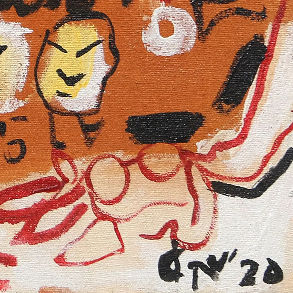 Reza Dwakiss's mixed media work shows the slow descent of an upright citizen into the depths of hate--all because of friction in their community. The Javanese artist uses a style reminiscent of Neo-Expressionism to create the painting, working with bright acrylic, raw brushstrokes, permanent marker, and graphic line work.