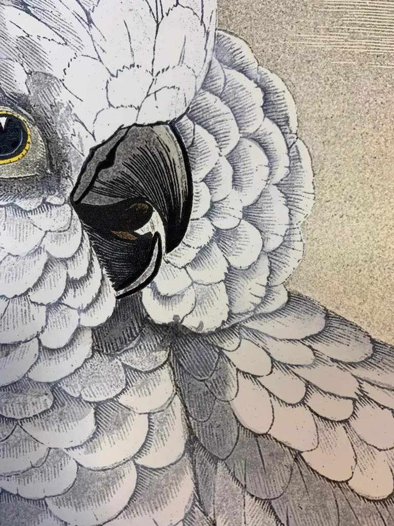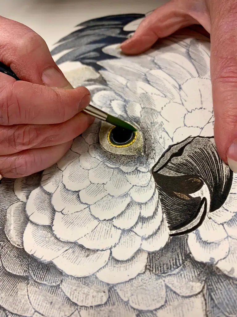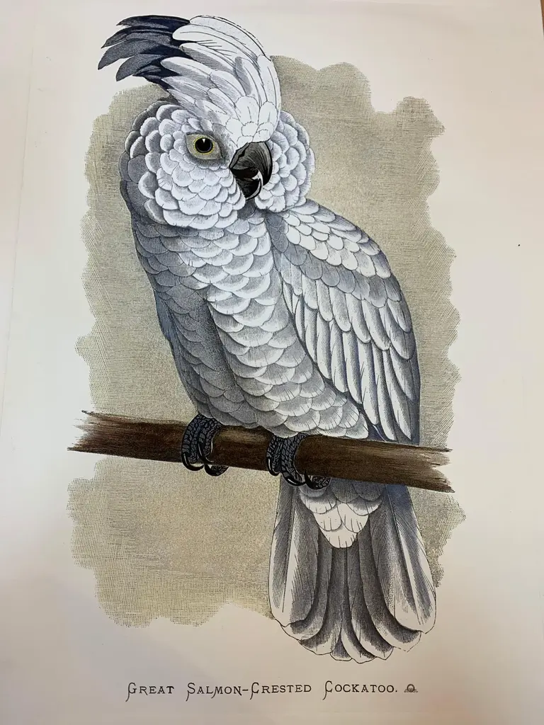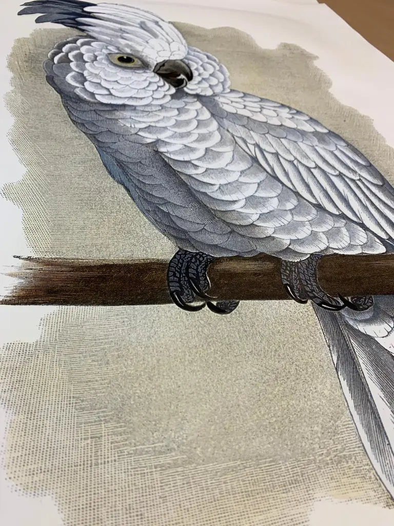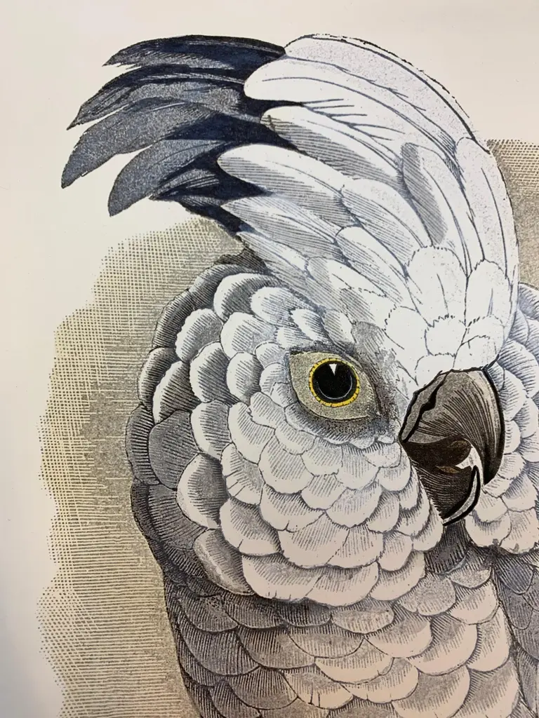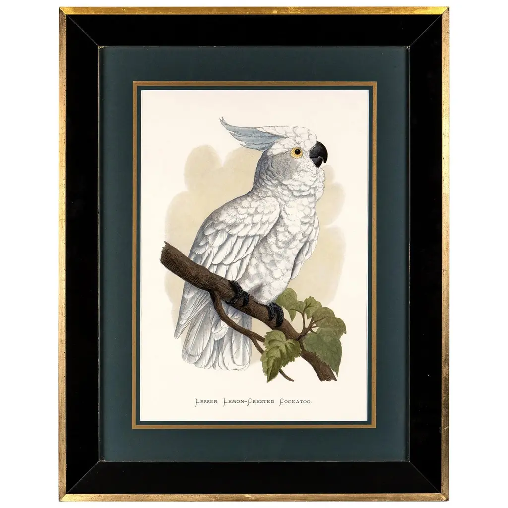 Large cockatoo print entirely hand colored in Italy and hand printed with an antique press. Deep green mat with gold detailing. Art frame with gold leaf border and black glass inserts.ARTECORNICI design produces hand colored art prints, artisan frames, lightings, decorative accessories and furniture. All our products are designed and produced in Florence by Italian master craftsmen.