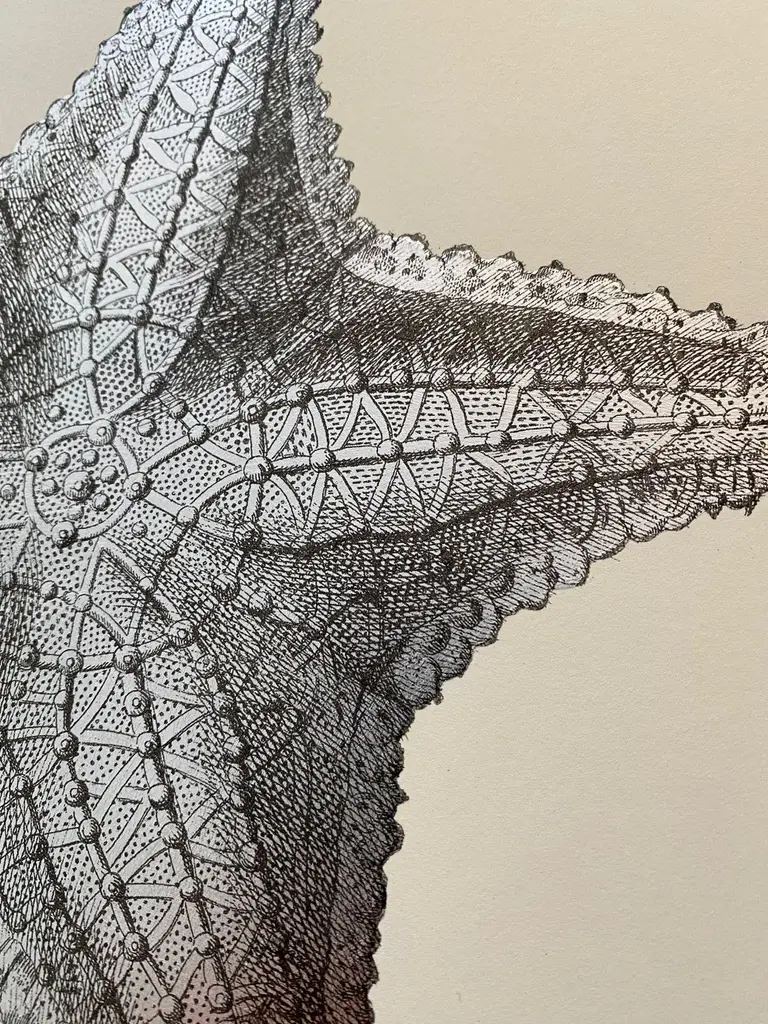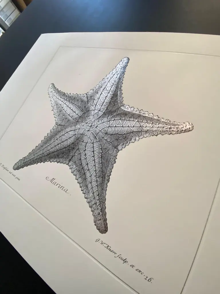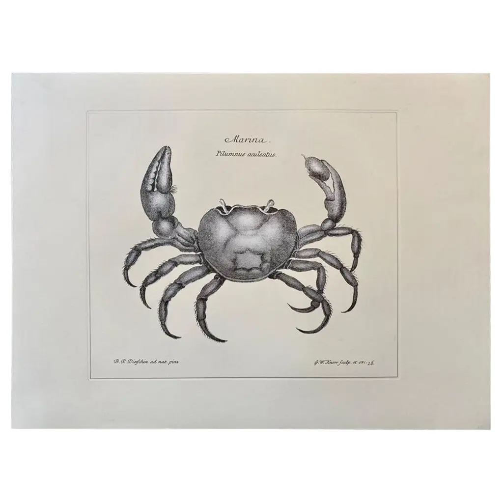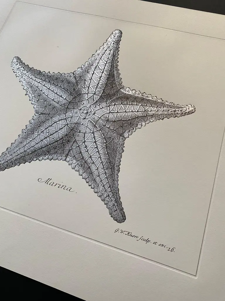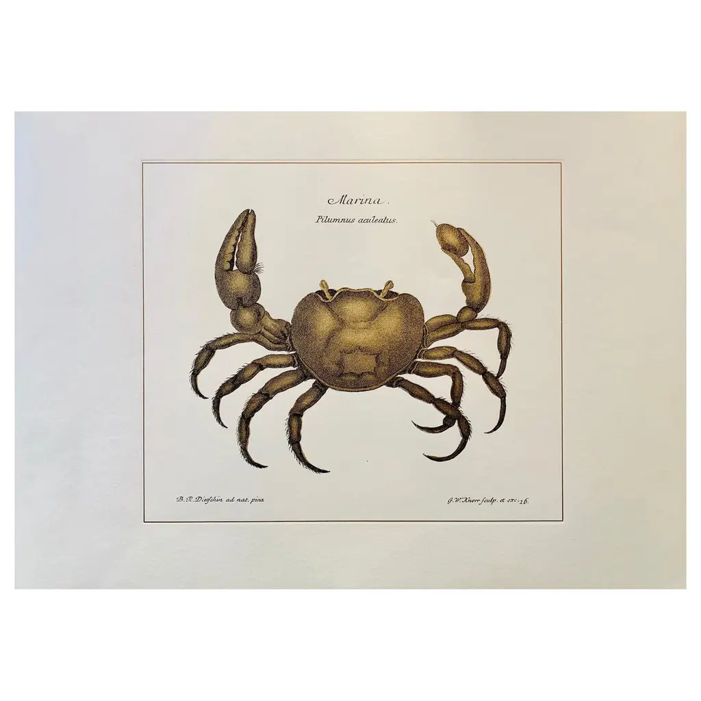 Marina Starfish handcrafted print. The technique of printing on silver leaf is our reinterpretation of an ancient tradition.Each print is entirely printed and colored in Italy by our master craftsmen.Elegant hand-colored print representing a crab "Pilumnus aculeatus" also framed by a small gold leaf line. This print is made with a special handmade cotton paper.This print is part of a collection of 4.With an experience of over 40 years, Artecornici design creates high-quality handmade frames using precious woods and working various types of high-quality finishes, lacquers and ageing, offering a vast choice of models.The richness of our work lies in the ability to make our customers requests our own, creating products with personalized, unique and precious creations, renewing our collections year after year.Each print is an artisanal Florentine product, reproducing images of the European 18th and 19th centuries with the same printing techniques (engraving with a star press), the golden age of prints, which are then finished and watercolored exclusively by hand.