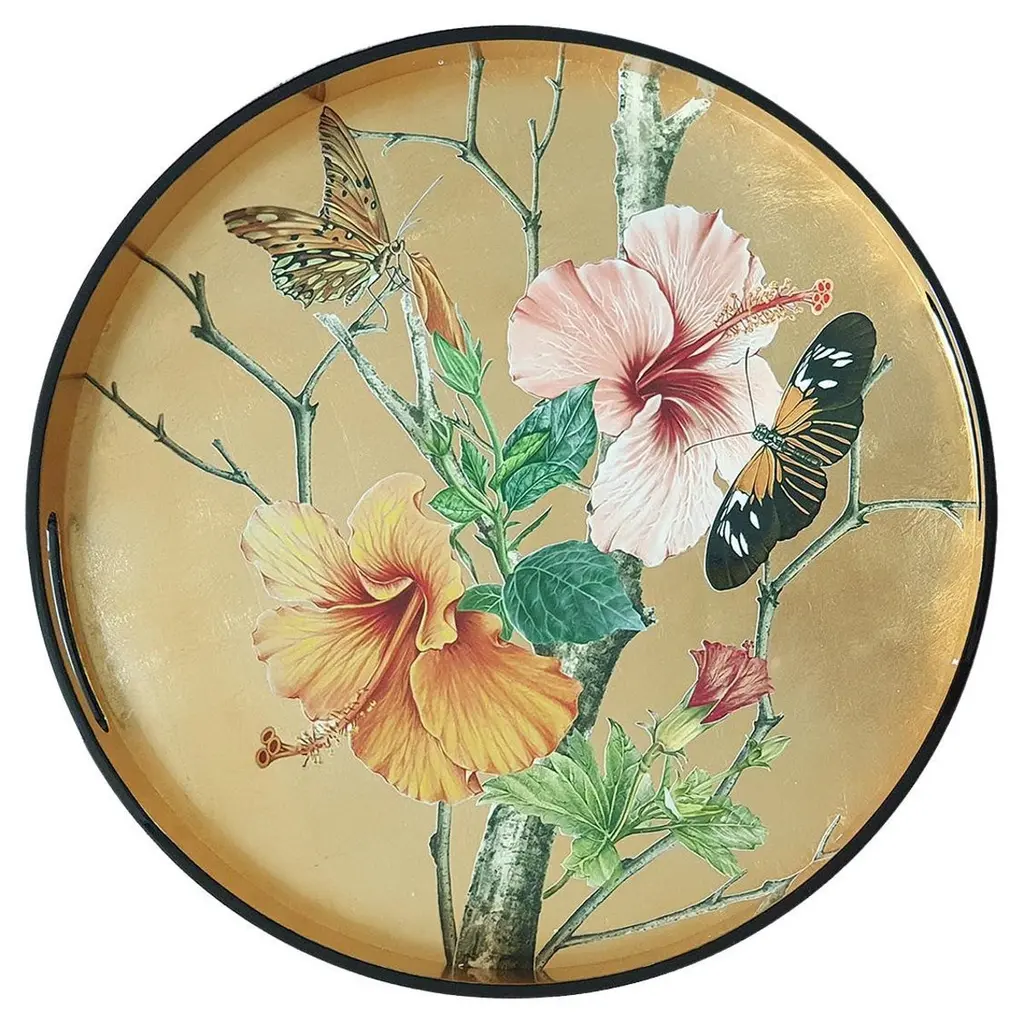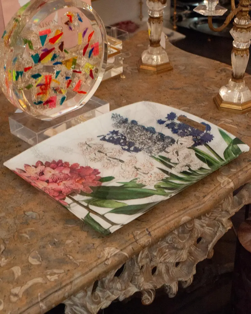 A large serving tray with handles, crafted from acrylic and captured floral printed linen. Made in France, these floral serving trays are a functional and beautiful serving accessory. With their transparent sheen and the refined patterns of printed linen, these trays are perfect for adding a touch of elegance to your home. Versatile and easy to clean, they are the perfect accessory for serving or simply decorating.