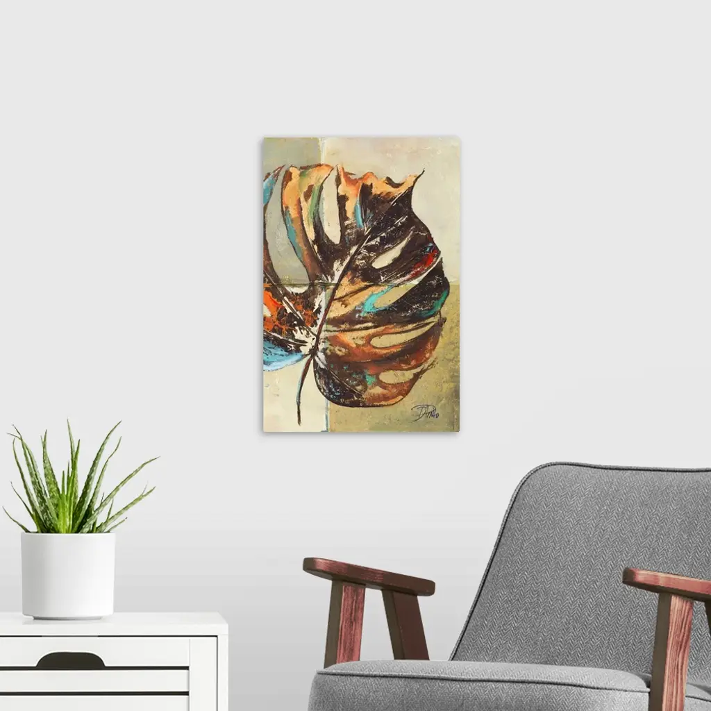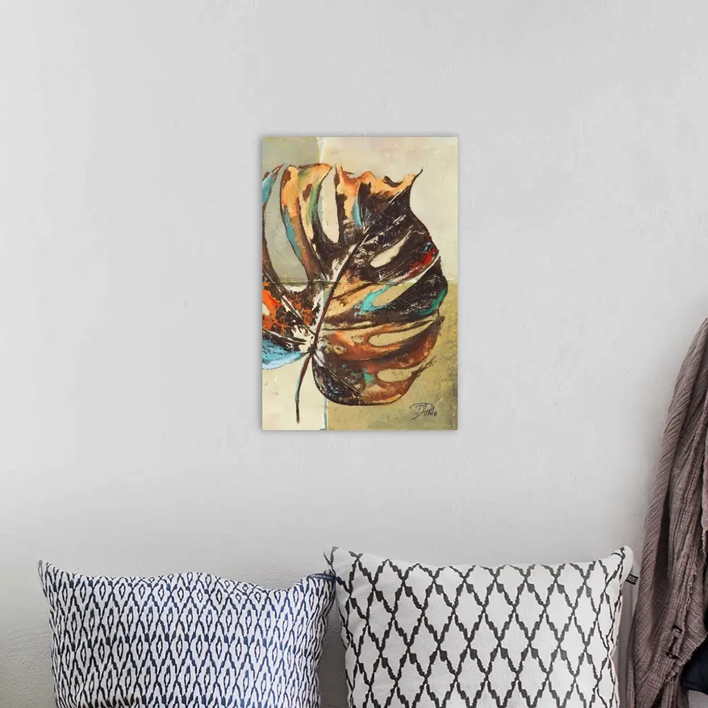 A contemporary painting of a single colorful leaf with a tan squared background.