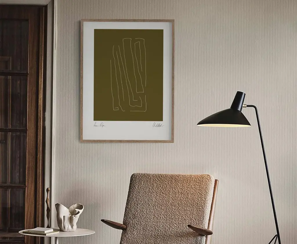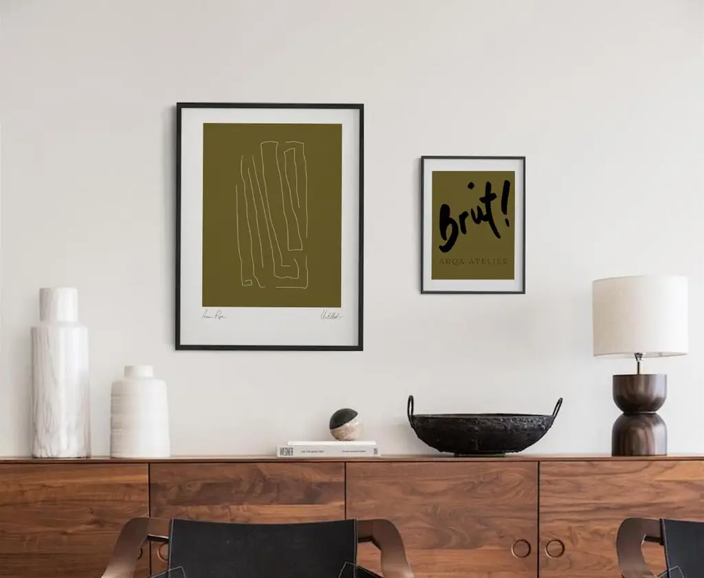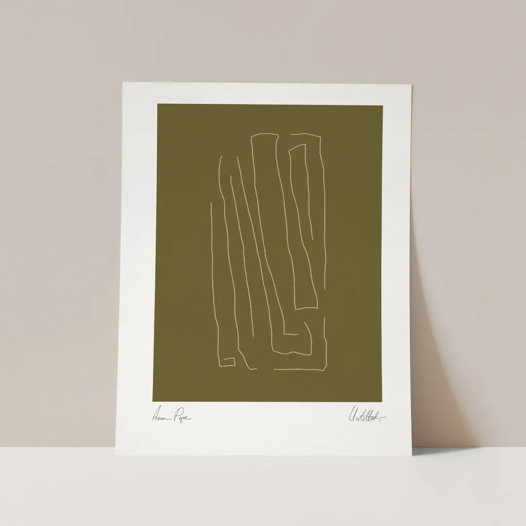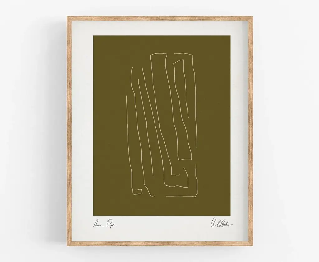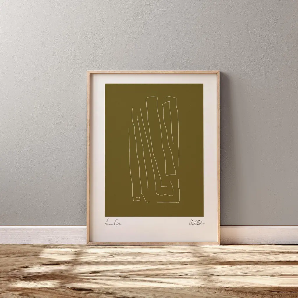 Framed abstract open edition giclee print. 20"x28" Elegant white lines geometrical composition drawing on olive green background. High quality natural color wooden frame ready to hang. Printed on matte art paper 200gsm. Artwork size is 20"x28" (50x70 cm)
