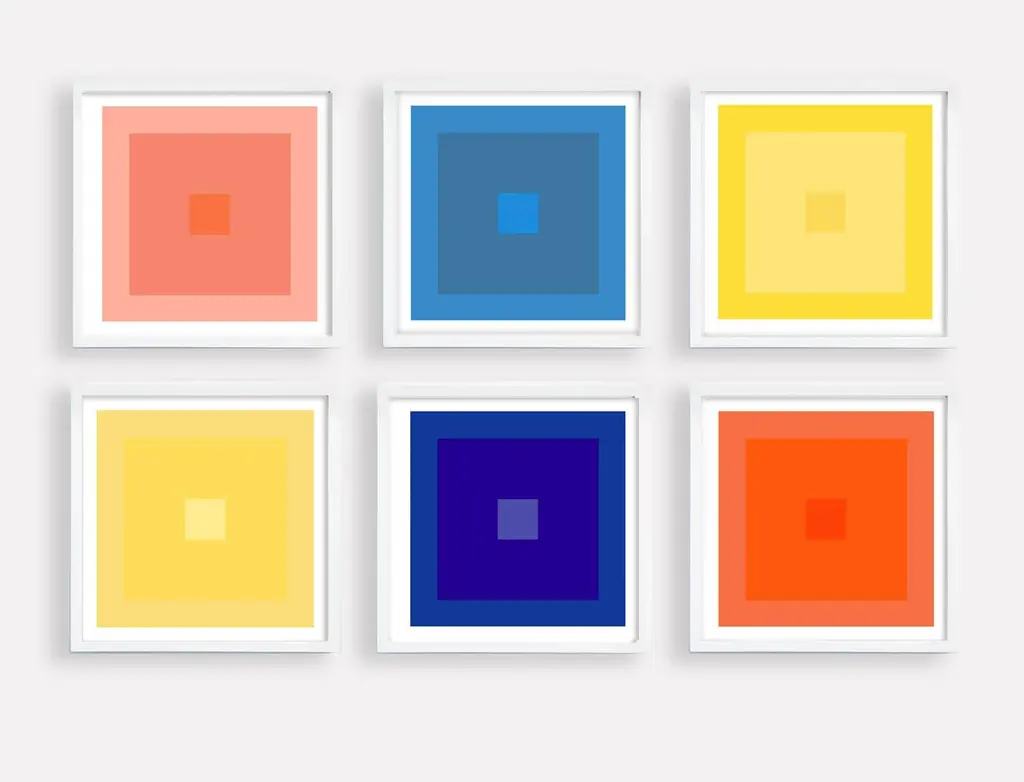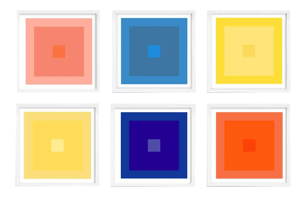 This series of color study prints evolved from our own internal studio experiments with hue, tone and value. We liked them so much we developed this series of modular prints that use reduced geometric shapes and fields of color. If you look closely, you’ll see that each center square has a touch of painterly texture that lends a subtle human touch to each piece. This is a set of 6 Unframed color study prints sized at 11" x 11". Printed on 255gsm 100% cotton matte watercolor paper. Please note: We ship out within 3 days. Chairish transit times are not accurate.