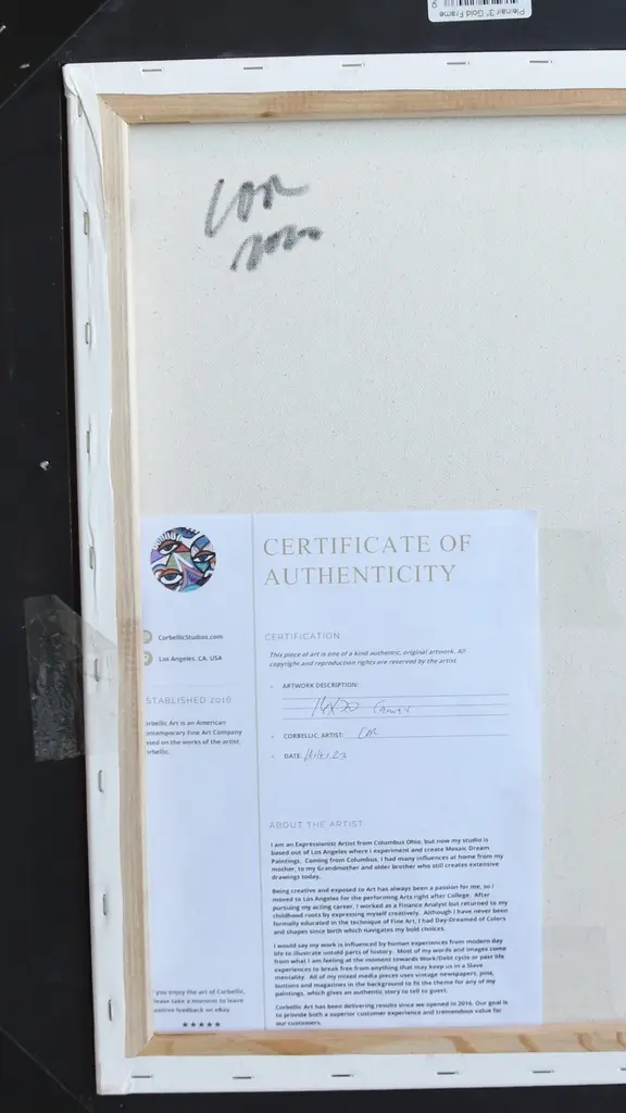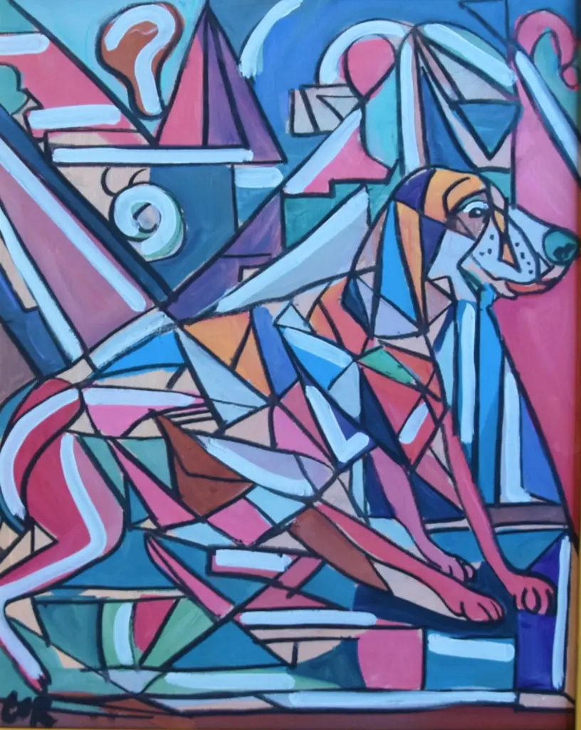 Contemporary, modern cubism original one-of-a-kind oil painting of a dog pet on stretched artist's canvas. The artwork is by the talented artist ��Corbellic���� and includes a certificate of authenticity on the reverse. The artist initialed the painting on the lower left corner. Included are the antiqued gold wood frame and hanging hardware/wire. Dimensions: Artwork, 16"L x 20"H; overall, including the frame, 21"L x 25"H. Excellent, beautiful condition!!!!