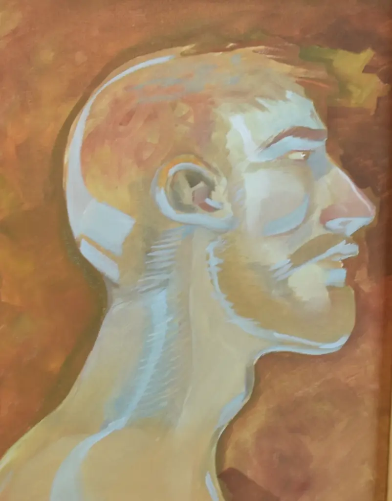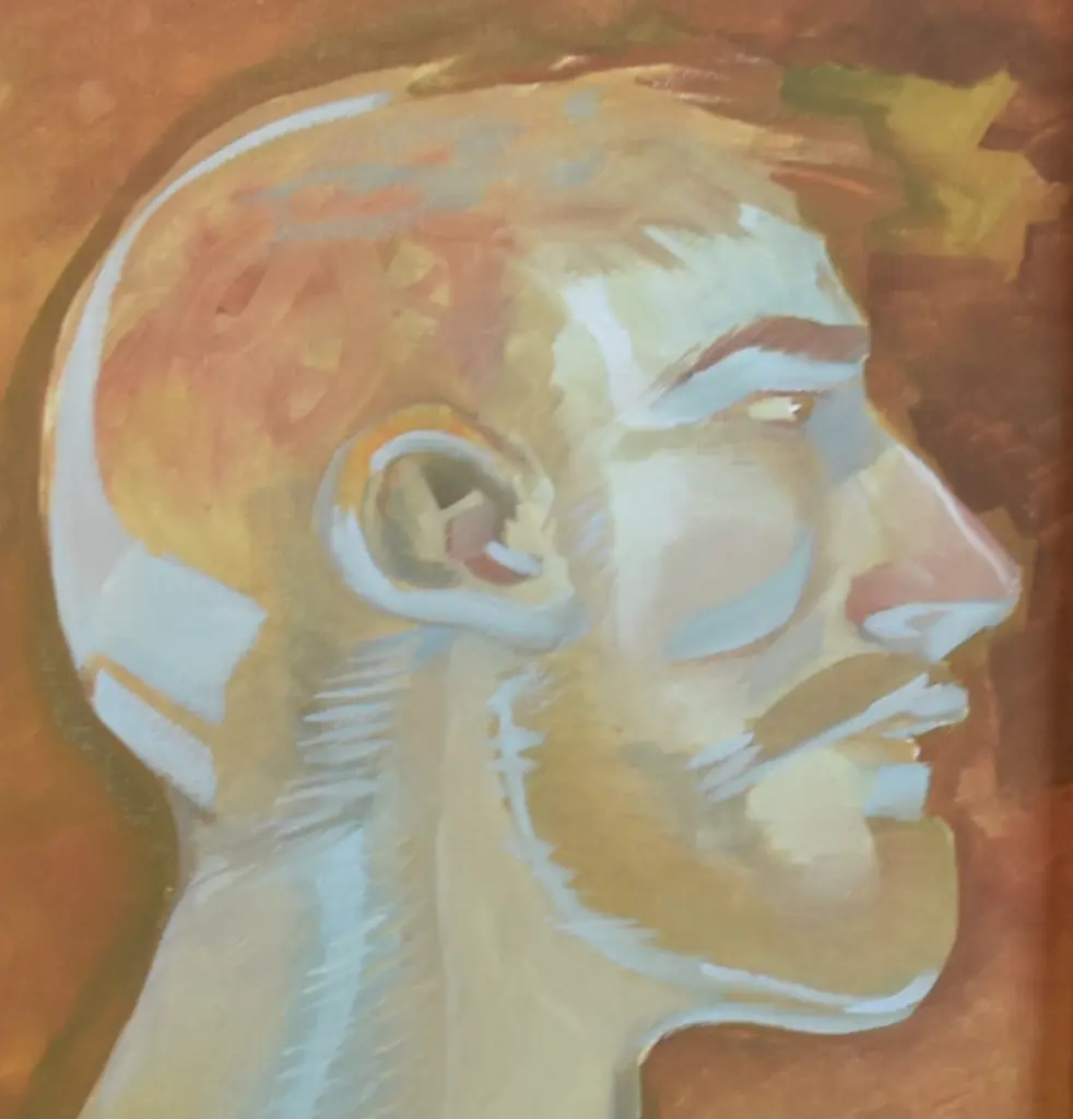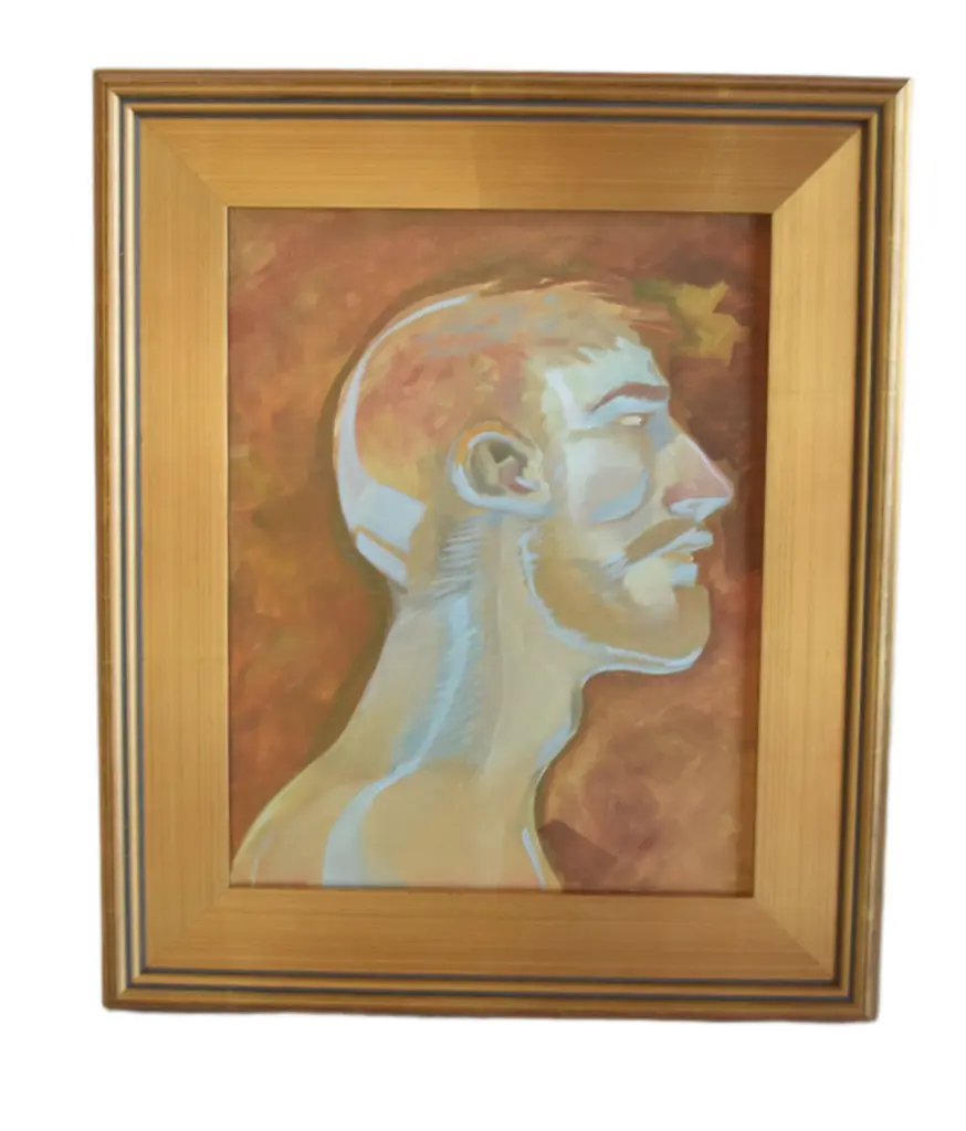 Impressionist portrait of a male profile oil painting on artist canvas board. Illegible signature on reverse. The beautifully antiqued gold wood frame and hanging hardware/wire are included. Dimensions: The artwork measures 11����L x 14�����H, and the overall dimensions, including the frame, are 16”L x 19�����H. It is available from Mike Seratt of The Prized Pig. It is in excellent, beautiful condition!!!