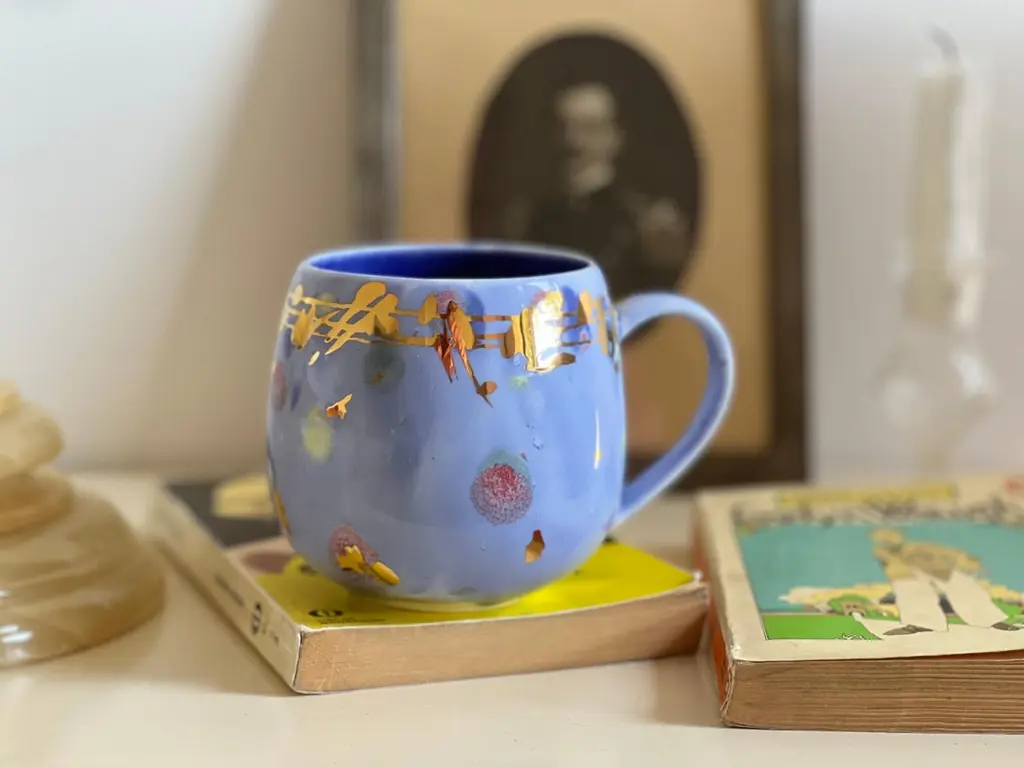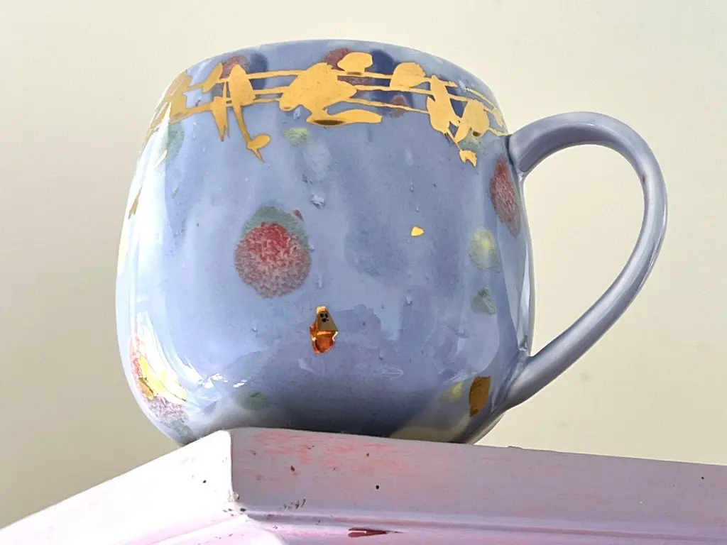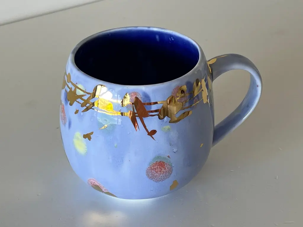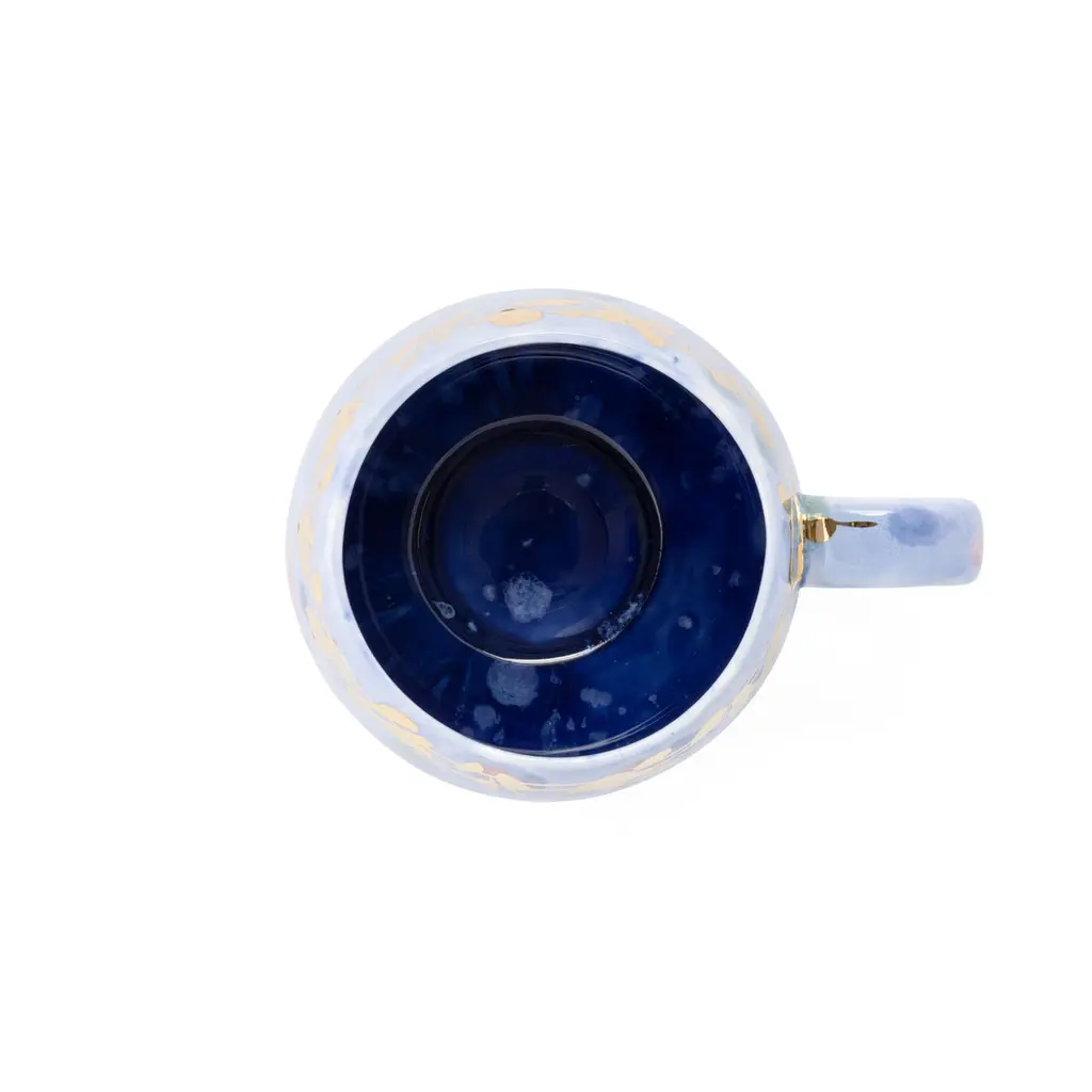 Contemporary Set Of 2 Chubby Mugs Hand Painted Porcelain Blue Gold