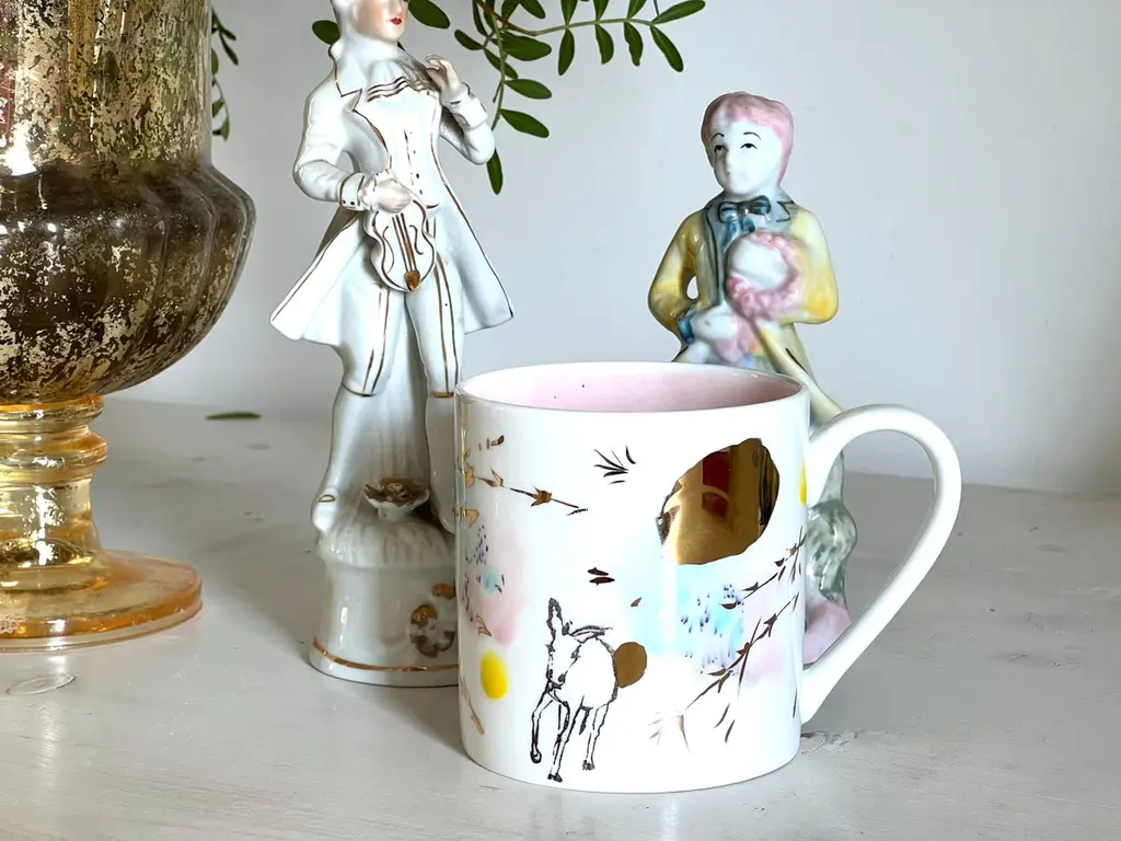 Contemporary Set Of 2 Large Mugs Hand Painted Porcelain Pink Gold