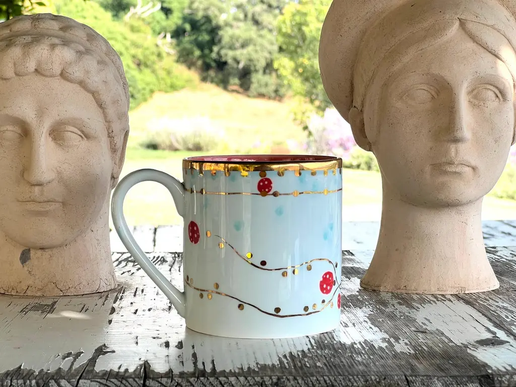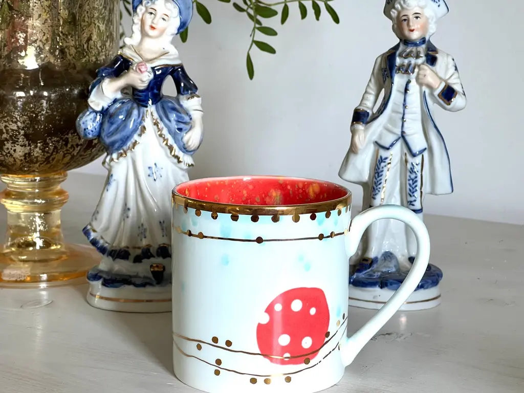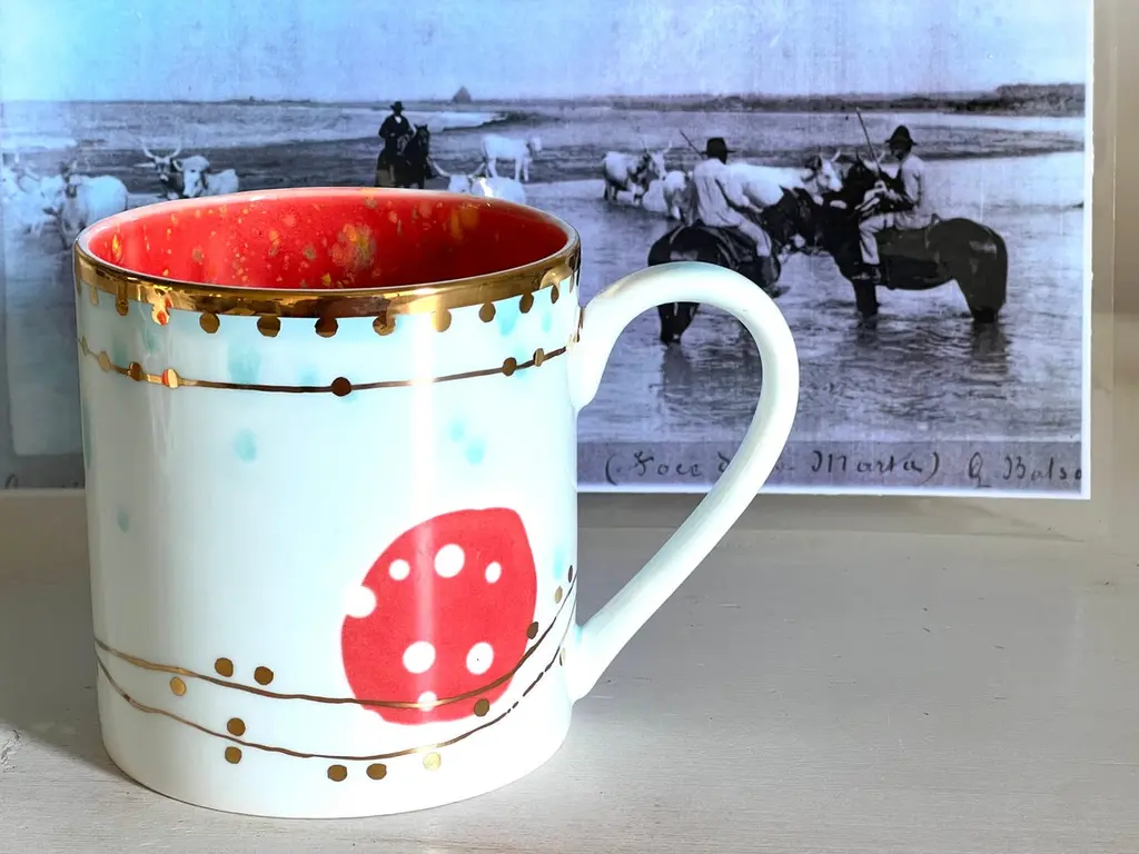 Contemporary Set Of 2 Large Mugs Hand Painted Porcelain Red Gold