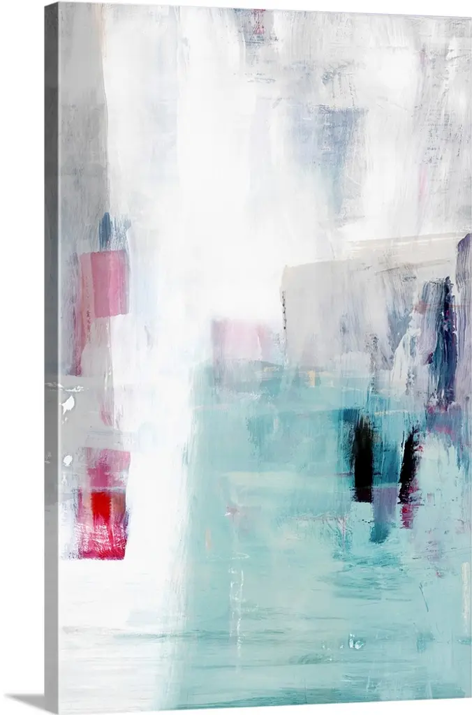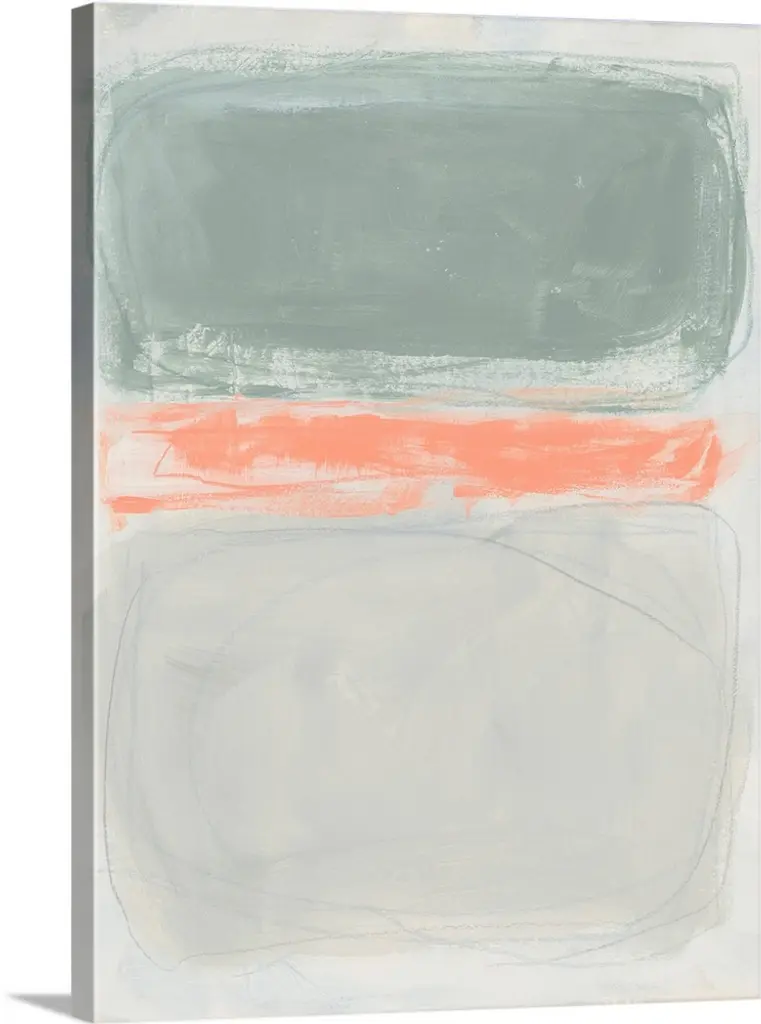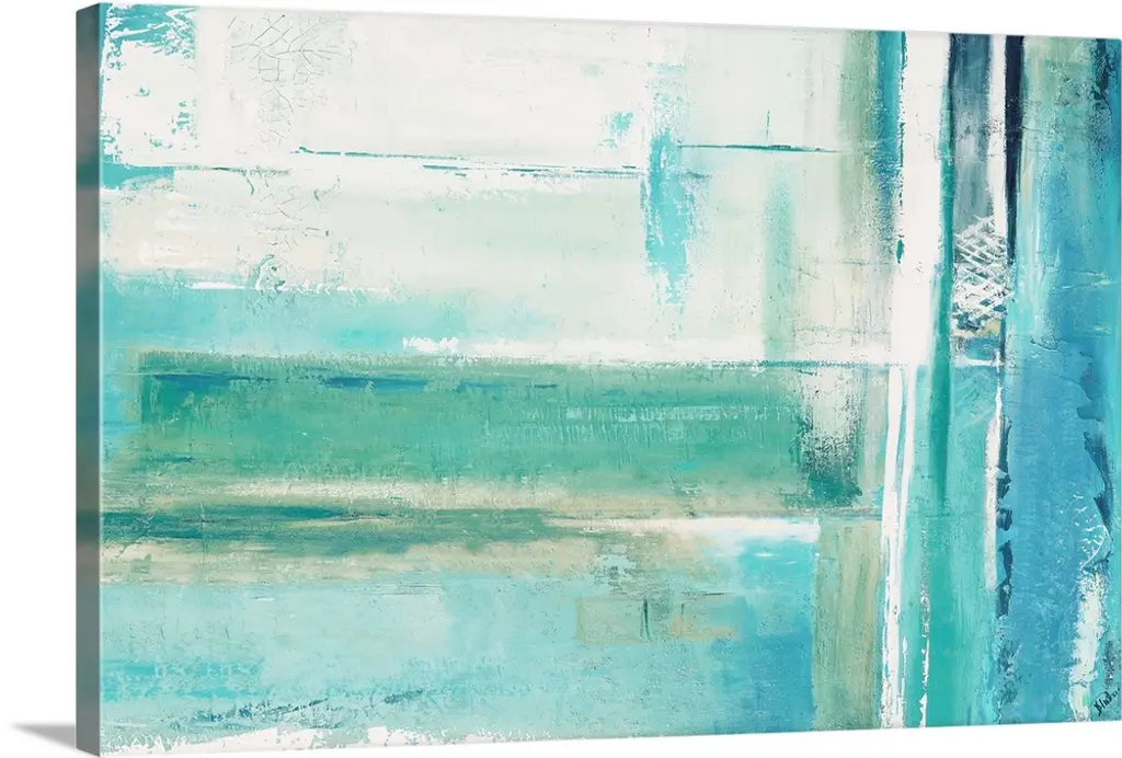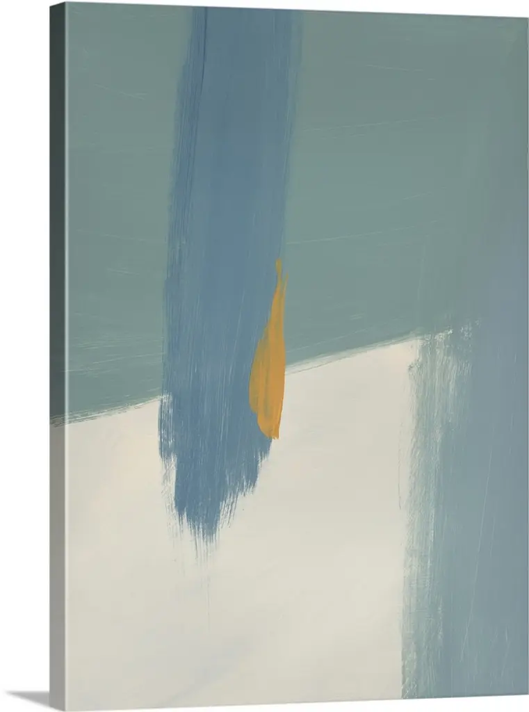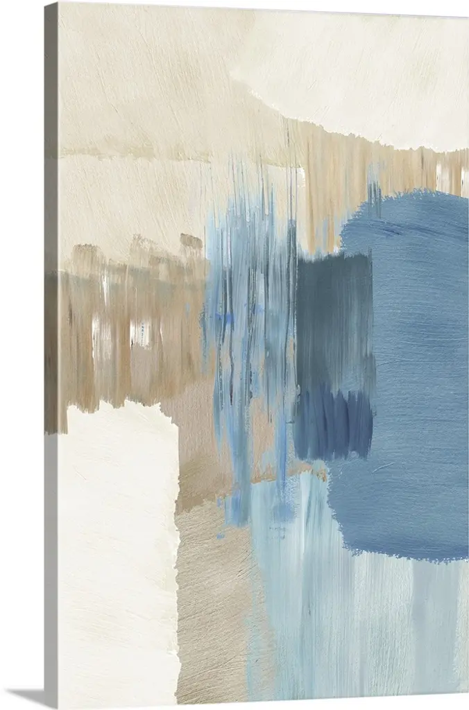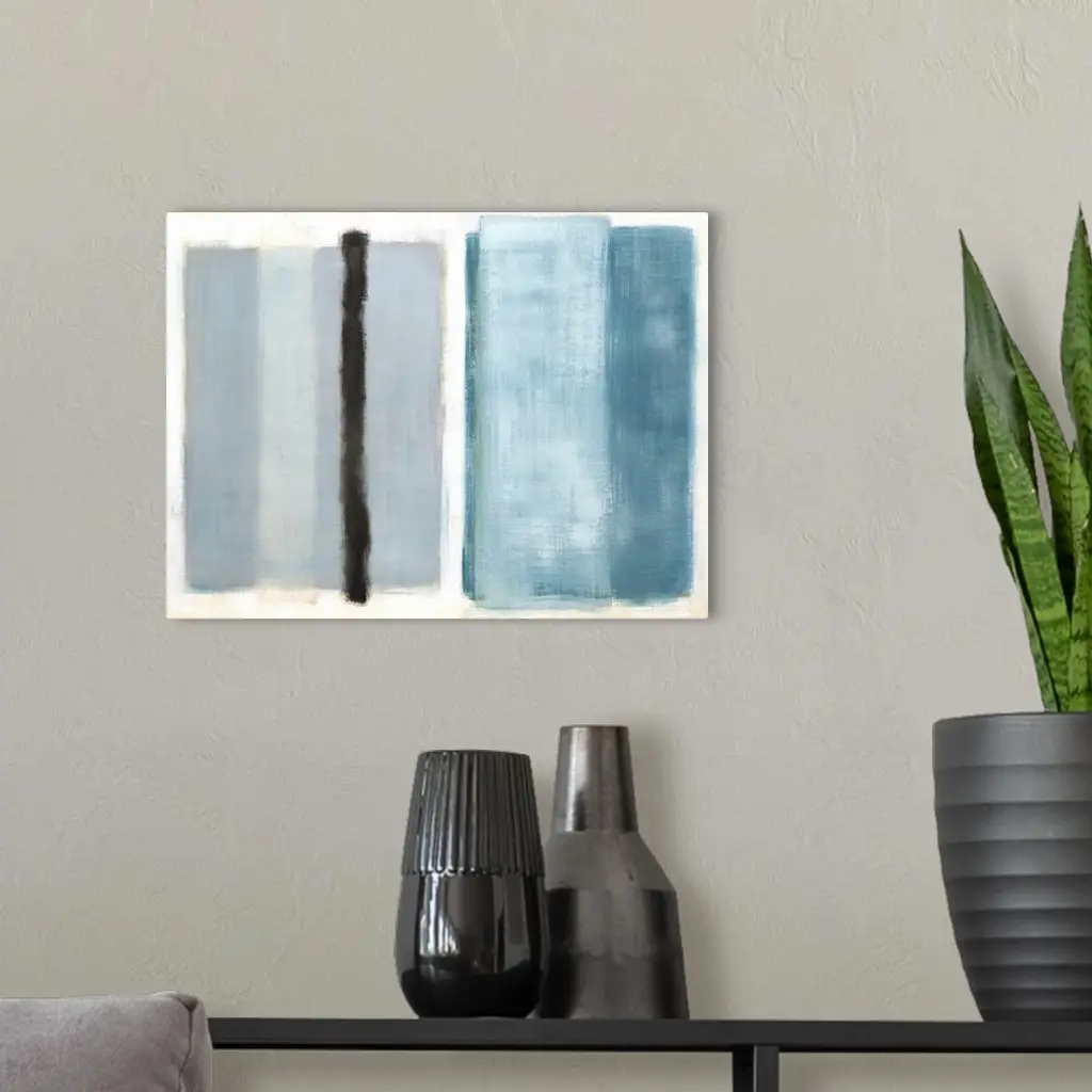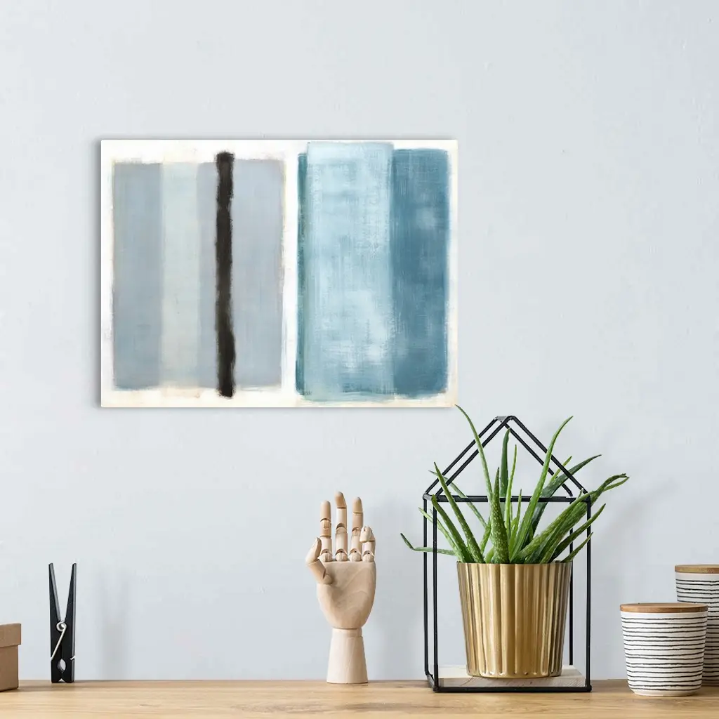 Large abstract painting with rectangular sections of color in shades of blue and gray with one black line and a white and orange boarder.